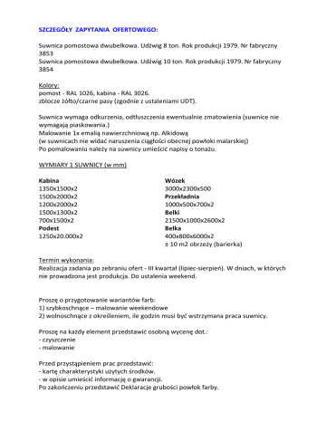 SZCZEGÓŁY ZAPYTANIA OFERTOWEGO: Suwnica pomostowa dwubelkowa. Udźwig 8 ton. Rok produkcji 1979. Nr fabryczny 3853 Suwnica pomostowa dwubelkowa. Udźwig 10 ton. Rok produkcji 1979. Nr fabryczny 3854 Kolory: pomost - RAL 1026, kabina - RAL 3026. zblocze żółto/czarne pasy (zgodnie z ustaleniami UDT). Suwnica wymaga odkurzenia, odtłuszczenia ewentualnie zmatowienia (suwnice nie wymagają piaskowania.) Malowanie 1x emalią nawierzchniową np. Alkidową (w suwnicach nie widać naruszenia ciągłości obecnej powłoki malarskiej) Po pomalowaniu należy na suwnicy umieścić napisy o tonażu. WYMIARY 1 SUWNICY (w mm) Kabina 1350x1500x2 1500x2000x2 1200x2000x2 1500x1300x2 700x1500x2 Podest 1250x20.000x2 Wózek 3000x2300x500 Przekładnia 1000x500x700x2 Belki 21500x1000x2600x2 Belka 400x800x6000x2 ± 10 m2 obrzeży (barierka) Termin wykonania: Realizacja zadania po zebraniu ofert - III kwartał (lipiec-sierpień). W dniach, w których nie prowadzona jest produkcja. Do ustalenia weekend. Proszę o przygotowanie wariantów farb: 1) szybkoschnące – malowanie weekendowe 2) wolnoschnące z określeniem, ile godzin musi być wstrzymana praca suwnicy. Proszę na każdy element przedstawić osobną wycenę dot.: - czyszczenie - malowanie Przed przystąpieniem prac przedstawić: - kartę charakterystyki użytych środków. - w opisie umieścić informację o gwarancji. Po zakończeniu przedstawić Deklaracje grubości powłok farby.