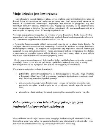 Moje dziecko jest leworęczne Lateralizacja to inaczej stronność ciała, a więc większa sprawność jednej strony ciała od drugiej, która nie ogranicza się wyłącznie do pracy rąk, choć najwyraźniej zaznacza się właśnie w czynnościach manualnych. Występuje ona również w przypadku nóg oraz parzystych narządów zmysłu, zwłaszcza oczu. Najczęściej skupiamy się na obserwowaniu, która ręka dominuje u dziecka. Pierwsze objawy dominacji ręki można zaobserwować już u niemowlęcia, począwszy od ok. 6-7 miesiąca życia dziecka. Przewaga jednej ręki nad drugą staje się wyraźna u wielu dzieci około 4 roku życia. Zwykle na przełomie wieku przedszkolnego i szkolnego ustala się lateralizacja czynności ruchowych rąk, która ostatecznego kształtu nabiera w wieku 12-14 lat. „ Asymetria funkcjonowania półkul mózgowych rozwija się w ciągu życia dziecka. W kolejnych okresach rozwoju układu nerwowego dochodzi do ustalenia w mózgu lokalizacji poszczególnych funkcji”. Ze względu na krzyżowanie się większości szlaków nerwowych łączących mózg z narządami zmysłów i ruchu, czynności i funkcje powiązane są z półkulami w następującym porządku: prawa półkula kieruje pracą lewej strony ciała, a lewa półkula odpowiada za funkcjonowanie narządów po prawej stronie. Oprócz asymetrycznej przewagi funkcjonalnej jednej z półkul mózgowych może wystąpić sytuacja jej braku, co ma miejsce, gdy żadna z półkul nie wykazuje wyraźnej przewagi, dominacja wówczas nie występuje, obie półkule działają jakby ekwiwalentnie. Wyróżniamy następujące rodzaje lateralizacji: jednorodna – prawostronna (przejawia się dominacją prawej ręki, oka i nogi, świadczy o dominacji półkuli lewej) lub lewostronna (przejawia się dominacją lewej ręki, oka i nogi, świadczy o dominacji półkuli prawej); niejednorodna (inaczej zwana skrzyżowaną) – polega na wyraźnej czynnościowej przewadze narządów ruchu i zmysłu, ale nie po tej samej stronie, a po obu stronach ciała; nieustalona – brak ustalonej dominacji poszczególnych narządów ruchu i zmysłu. Zaburzenia procesu lateralizacji jako przyczyna trudności i niepowodzeń szkolnych Nieprawidłowa lateralizacja i leworęczność mogą być źródłem różnych trudności dziecka. Szczególnie negatywny wpływ na naukę ma skrzyżowanie lateralizacji w zakresie oka i ręki, ponieważ utrudnia kształtowanie się koordynacji wzrokowo- manualnej. Trudności dziecka leworęcznego Lateralizacja lewostronna utrudnia dziecku funkcjonowanie, ponieważ większość urządzeń technicznych oraz przedmiotów codziennego użytku jest przeznaczona dla osób praworęcznych. Dziecko leworęczne znajduje się zazwyczaj w sytuacji o wiele trudniejszej niż jego praworęczni rówieśnicy. Szczególnie początki nauki szkolnej, przede wszystkim zaś początki nauki pisania bywają trudne, a nawet szokujące. Najczęściej w klasie I szkoły podstawowej dziecko leworęczne różni się od swoich kolegów. Odrębność ta połączona jest z kłopotami i trudnościami technicznymi, a nierzadko z zaburzeniami utrudniającymi naukę czytania i pisania. Sprawą niezmiernie ważną jest „ wybór ręki”, którą dziecko leworęczne ma pisać. Jeśli okaże się, że lateralizacja lewostronna jest pełna, tzn. dominuje nie tylko lewa ręka, ale też noga i oko, dziecko nie powinno mieć kłopotów z nauką pisania, czytania, określania kierunków. Podczas rysowania czy pisania u dzieci leworęcznych mogą jednak pojawić się problemy. Zaburzenia stwierdzone u dzieci lewostronnych uznaje się za skutek zmuszania ich do posługiwania się prawą ręką, co wywołuje tzw. konflikt dominacji ( uaktywnienie ośrodków w półkuli niedominującej ). Należy podkreślić, że dzieci leworęczne przestawiane na „ siłę” wykazują różne zaburzenia osobowości. Możemy zauważyć u nich płaczliwość, lękliwość, ataki złości, agresji. Zaburzenia nerwicowe objawiają się jąkaniem, moczeniem nocnym. Utrwala się w nich niechęć do przedszkola, szkoły. Często obserwuje się nadpobudliwość psychomotoryczną. Problemy psychologiczne są skutkiem niewłaściwej postawy otoczenia wobec leworęczności. Przejawia się ona nadmiernym zainteresowaniem i ochroną dziecka, bądź też zmuszaniem do wykonywania czynności prawą ręką, czy wreszcie wyśmiewaniem, przezywaniem, np. przez kolegów. Takie zachowania mogą negatywnie wpływać na samoocenę dziecka, obniżać poczucie jego wartości, prowadzić do kompleksów, nieśmiałości, a nawet lękliwości, nasilającej się w nowych sytuacjach ( obawa przed reakcją nieznanego otoczenia, niepewność) Może to prowadzić do kształtowania się postawy wycofującej. Leworęczność jest zjawiskiem złożonym i ma wielorakie aspekty. Decyzja o „przestawianiu” dziecka na prawą rękę wymaga więc wzięcia pod uwagę wielu różnych czynników. Próby przeuczania mogą być podejmowane w przypadku dzieci oburęcznych i o słabej przewadze ręki lewej; dzieci u których sprawność ruchowa prawej ręki jest prawidłowa. Nigdy nie przeuczamy na prawą rękę dzieci: zlateralizowanych lewostronnie wczesnej sile dominacji lewej ręki lewoocznych - dąży się do jednorodnej ( po tej samej stronie ciała) lateralizacji oka i ręki upośledzonych umysłowo małej sprawności ręki prawej akceptujących swoją leworęczność jąkających się Wśród wielu szczególnych zasad postępowania z dzieckiem leworęcznym najważniejszym jest prawo dziecka leworęcznego do posługiwania lewą ręką. Postępowanie z dzieckiem leworęcznym nie jest równoznaczne z przestawieniem go na rękę prawą, ale powinno uwzględnić pomoc w przygotowaniu dziecka do nauki pisania zgodnie z jego możliwościami. Czynność pisania tradycyjnie wykonywana prawą ręką w kierunku od strony lewej ku prawej, zazwyczaj sprawia dziecku leworęcznemu problemy. Sposób pisania lewą r