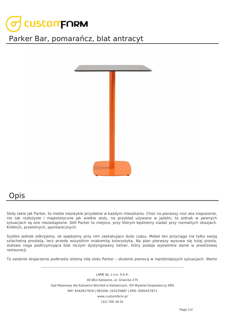 Parker Bar, pomarańcz, blat antracyt Opis Stoły takie jak Parker, to meble niezwykle przydatne w każdym mieszkaniu. Choć na pierwszy rzut oka niepozorne, nie tak rozłożyste i majestatyczne jak wielkie stoły, na przykład używane w jadalni, to jednak w pewnych sytuacjach są one niezastąpione. Stół Parker to miejsce, przy którym będziemy siadać przy rozmaitych okazjach. Krótkich, przelotnych, spontanicznych. Szybko jednak odkryjemy, że spędzamy przy nim zaskakująco dużo czasu. Mebel ten przyciąga nie tylko swoją szlachetną prostotą, lecz przede wszystkim znakomitą kolorystyką. Na plan pierwszy wysuwa się tutaj prosta, stalowa noga podtrzymująca blat niczym dystyngowany kelner, który podaje wykwintne danie w prestiżowej restauracji. To ostatnie skojarzenie podkreśla istotną rolę stołu Parker – służenie pomocą w najróżniejszych sytuacjach. Warto ----------------------------------------------------------------------------------------------------------------------------------LARB Sp. z o.o. S.K.A. 40-862 Katowice, ul. Gliwicka 275 Sąd Rejonowy dla Katowice-Wschód w Katowicach, VIII Wydział Gospodarczy KRS NIP: 6342817919 | REGON: 243235887 | KRS: 0000457871 www.customform.pl (32) 700 18 01 Page 1/2 zwrócić uwagę na szczegóły, które ułatwiają bezpieczne użytkowanie stołu. Mamy tu na myśli na przykład starannie zaokrąglone narożniki blatu czy też stabilną konstrukcję podstawy, która chroni mebel przed przypadkowym przewróceniem. Zastosowania Stół do jadalni Parker to niewątpliwa ozdoba pomieszczeń utrzymanych w stylu nowoczesnym i minimalistycznym. Dzięki charakterystycznej kolorystyce, ma szansę również wnieść wiele świeżości do wnętrz typowo skandynawskich. Stół Parker, ze swoją powierzchnią – łatwą do utrzymania w czystości, może być ciekawą propozycją wyposażenia wnętrz lokali gastronomicznych – np. kawiarni. Specyfikacja Wysokość 107 cm Szerokość 70 cm Długość 70 cm Podstawa metal malowany proszkowo Blat laminat kompaktowy Dodatkowe zdjęcia ----------------------------------------------------------------------------------------------------------------------------------LARB Sp. z o.o. S.K.A. 40-862 Katowice, ul. Gliwicka 275 Sąd Rejonowy dla Katowice-Wschód w Katowicach, VIII Wydział Gospodarczy KRS NIP: 6342817919 | REGON: 243235887 | KRS: 0000457871 www.customform.pl (32) 700 18 01 Page 2/2 Powered by TCPDF (www.tcpdf.org)