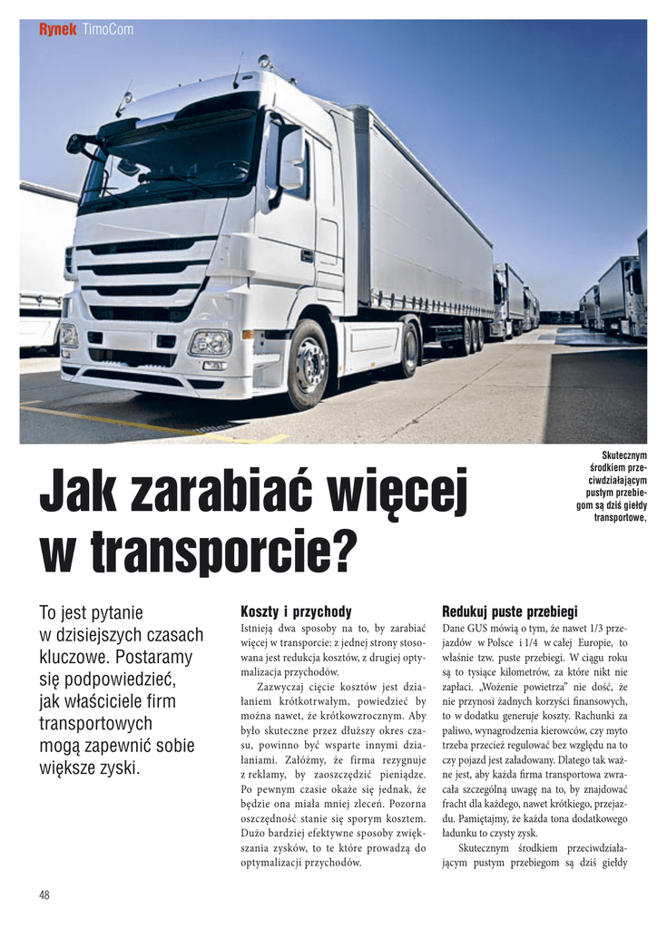 Rynek TimoCom Jak zarabiać więcej w transporcie? To jest pytanie w dzisiejszych czasach kluczowe. Postaramy się podpowiedzieć, jak właściciele firm transportowych mogą zapewnić sobie większe zyski. 48 Skutecznym środkiem przeciwdziałającym pustym przebiegom są dziś giełdy transportowe, Koszty i przychody Redukuj puste przebiegi Istnieją dwa sposoby na to, by zarabiać więcej w transporcie: z jednej strony stosowana jest redukcja kosztów, z drugiej optymalizacja przychodów. Zazwyczaj cięcie kosztów jest działaniem krótkotrwałym, powiedzieć by można nawet, że krótkowzrocznym. Aby było skuteczne przez dłuższy okres czasu, powinno być wsparte innymi działaniami. Załóżmy, że firma rezygnuje z reklamy, by zaoszczędzić pieniądze. Po pewnym czasie okaże się jednak, że będzie ona miała mniej zleceń. Pozorna oszczędność stanie się sporym kosztem. Dużo bardziej efektywne sposoby zwiększania zysków, to te które prowadzą do optymalizacji przychodów. Dane GUS mówią o tym, że nawet 1/3 przejazdów w Polsce i 1/4 w całej Europie, to właśnie tzw. puste przebiegi. W ciągu roku są to tysiące kilometrów, za które nikt nie zapłaci. „Wożenie powietrza” nie dość, że nie przynosi żadnych korzyści finansowych, to w dodatku generuje koszty. Rachunki za paliwo, wynagrodzenia kierowców, czy myto trzeba przecież regulować bez względu na to czy pojazd jest załadowany. Dlatego tak ważne jest, aby każda firma transportowa zwracała szczególną uwagę na to, by znajdować fracht dla każdego, nawet krótkiego, przejazdu. Pamiętajmy, że każda tona dodatkowego ładunku to czysty zysk. Skutecznym środkiem przeciwdziałającym pustym przebiegom są dziś giełdy transportowe, jak wiodąca w Europie platforma zleceń TC Truck&Cargo®. Użytkownicy mogą za jej pomocą w ułamku sekundy wyszukać odpowiednią ofertę frachtu lub też wprowadzić do systemu swój pusty pojazd. Omijaj pośredników Wiadomo, że realizując transport międzynarodowy pojazdy przemieszczają się po różnych częściach Europy. Aby optymalnie wykorzystać swój potencjał przewozowy firma powinna dobierać bezpośrednich partnerów w poszczególnych krajach. Korzystanie z ofert z drugiej, trzeciej, a czasem nawet i czwartej ręki, to oddanie dużej części swojego potencjalnego zysku pośrednikom. Pieniądze, które powinny trafić do przewoźnika, trafiają do kolejnych ogniw łańcucha dostaw. Firma transportowa, która występuje niemalże na samym jego końcu – zarabia grosze. Aby więc zoptymalizować przychody przedsiębiorstwa, a tym samym zarabiać więcej, należy redukować liczbę pośredników. Ułatwia to, będąca liderem w Europie, giełda transportowa TC Truck&Cargo® firmy TimoCom, która skupia 85000 użytkowników z całej Europy. Polscy przewoźnicy zyskują bezpośredni dostęp do zachodnioeuropejskich spedytorów, dzięki czemu mogą realizować bardziej opłacalne zlecenia z pierwszej ręki i zarabiać więcej. Stałe zlecenia – stały zysk Doświadczenie, rzetelność i konkurencyjne stawki, to czasami za mało, aby zapewnić firmie transportowej stałą pracę i płynność finansową. Długoterminowe zlecenia na terenie całej Europy oraz sprawdzeni partnerzy to sposób na osiągnięcie dodatkowych korzyści. Przewoźnik otrzymuje zlecenia bez względu na sytuację na rynku. Stały dopływ gotówki, możliwość budowania planów budżetowych oraz planowania tras pojazdów z większym wyprzedzeniem – to kolejne atuty posiadania stałego zleceniodawcy. Poza tym firma może rozszerzać obszar prowadzonej działalności oraz umacniać swoją pozycję na rynku. Jeszcze do niedawna polscy przewoźnicy nie mieli tak łatwego dostępu do stałych tras na terenie innego kraju. Teraz, dzięki platformie przetargowej firmy TimoCom, zyskali możliwość brania udziału w ogólnoeuropejskich przetargach na stałe zlecenia transportowe. TC eBid® umożliwia kontakt do sprawdzonych firm załadowczych (produkcyjnych, handlowych), a tym samym daje szansę na świadczenie nowych, intratnych usług transportowych na terenie całej Europy. Podane wyżej sposoby optymalizacji przychodów to tylko nieliczne z całego wachlarza możliwości, które przewoźnicy powinni wykorzystywać optymalizując swój biznes transportowy. Można ich szukać na własną rękę, lecz dużo skuteczniej i łatwiej jest sięgnąć po sprawdzone źródła. Produkty firmy TimoCom od lat cieszą się uznaniem na rynku europejskim. Są to nowoczesne narzędzia optymalizujące transport. Giełda ofert transportowych TC Truck&Cargo® oraz platforma przetargowa TC eBid® pomaga- Załóżmy, że firma rezygnuje z reklamy, by zaoszczędzić pieniądze. Po pewnym czasie okaże się jednak, że będzie ona miała mniej zleceń. Pozorna oszczędność stanie się sporym kosztem ją między innymi redukować puste przebiegi, omijać pośredników, szukać długoterminowych kontraktów oraz nowych możliwości rozwoju, na przykład w postaci kabotażu. Giełda transportowa TC Truck&Cargo® to do 300000 bezpośrednich ofert od firm z całej Europy każdego dnia. Co więcej, są to firmy starannie zweryfikowane, co zwiększa bezpieczeństwo transakcji. 85000 użytkowników nie może się mylić. TC Truck&Cargo® to program sprawdzony i skuteczny. Platforma przetargowa TC eBid® ma za zadanie ułatwić zdobycie stałych kontrahentów, którzy mogą być kluczowi dla działalności firm transportowych. Przewoźnicy zdają sobie sprawę z tego, iż w czasach dużej konkurencji wśród firm przewozowych pozyskiwanie nowych zleceń stałych jest coraz trudniejsze, a aktywniejsze szukanie nowych możliwości rozwoju nieuniknione. Platforma TC eBid® w prosty, szybki i skuteczny sposób łączy przewoźników z załadowcami z całej Europy. Dla TimoCom to jednak za mało. Firma od lat dba o to, by jej użytkownicy starannie dobierali partnerów biznesowych. Dlatego też przestrzega restry