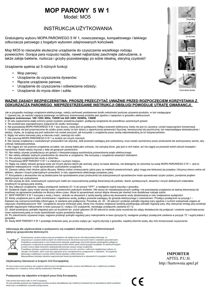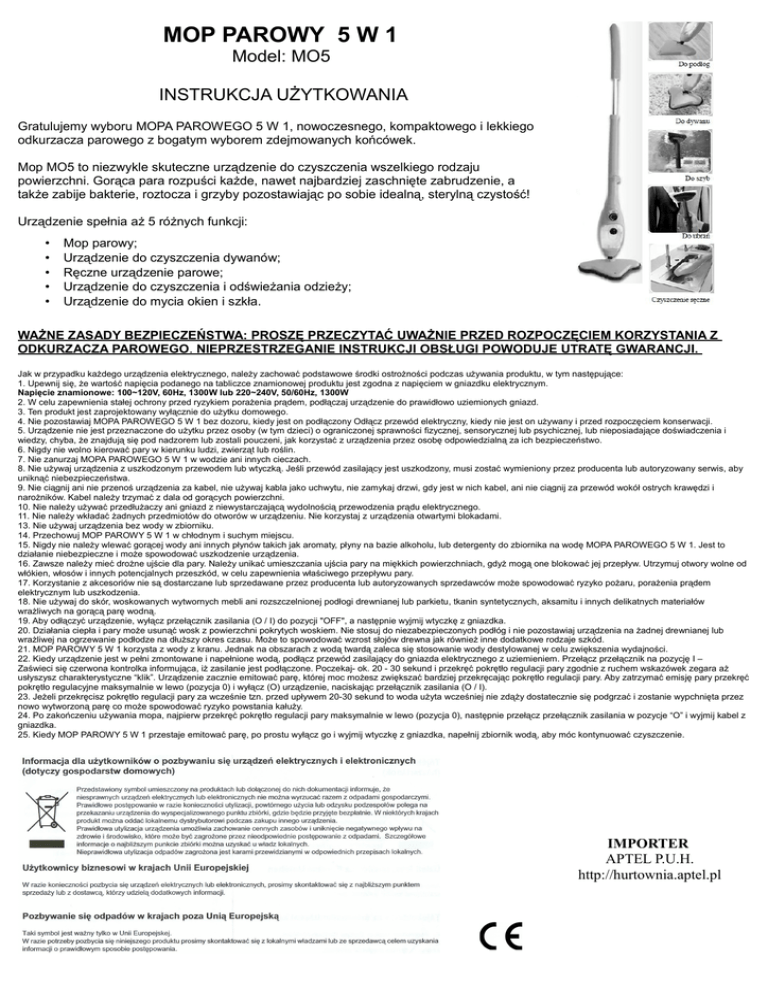 MOP PAROWY 5 W 1 Model: MO5 INSTRUKCJA UŻYTKOWANIA Gratulujemy wyboru MOPA PAROWEGO 5 W 1, nowoczesnego, kompaktowego i lekkiego odkurzacza parowego z bogatym wyborem zdejmowanych końcówek. Mop MO5 to niezwykle skuteczne urządzenie do czyszczenia wszelkiego rodzaju powierzchni. Gorąca para rozpuści każde, nawet najbardziej zaschnięte zabrudzenie, a także zabije bakterie, roztocza i grzyby pozostawiając po sobie idealną, sterylną czystość! Urządzenie spełnia aż 5 różnych funkcji: • • • • • Mop parowy; Urządzenie do czyszczenia dywanów; Ręczne urządzenie parowe; Urządzenie do czyszczenia i odświeżania odzieży; Urządzenie do mycia okien i szkła. WAŻNE ZASADY BEZPIECZEŃSTWA: PROSZĘ PRZECZYTAĆ UWAŻNIE PRZED ROZPOCZĘCIEM KORZYSTANIA Z ODKURZACZA PAROWEGO. NIEPRZESTRZEGANIE INSTRUKCJI OBSŁUGI POWODUJE UTRATĘ GWARANCJI. Jak w przypadku każdego urządzenia elektrycznego, należy zachować podstawowe środki ostrożności podczas używania produktu, w tym następujące: 1. Upewnij się, że wartość napięcia podanego na tabliczce znamionowej produktu jest zgodna z napięciem w gniazdku elektrycznym. Napięcie znamionowe: 100~120V, 60Hz, 1300W lub 220~240V, 50/60Hz, 1300W 2. W celu zapewnienia stałej ochrony przed ryzykiem porażenia prądem, podłączaj urządzenie do prawidłowo uziemionych gniazd. 3. Ten produkt jest zaprojektowany wyłącznie do użytku domowego. 4. Nie pozostawiaj MOPA PAROWEGO 5 W 1 bez dozoru, kiedy jest on podłączony Odłącz przewód elektryczny, kiedy nie jest on używany i przed rozpoczęciem konserwacji. 5. Urządzenie nie jest przeznaczone do użytku przez osoby (w tym dzieci) o ograniczonej sprawności fizycznej, sensorycznej lub psychicznej, lub nieposiadające doświadczenia i wiedzy, chyba, że znajdują się pod nadzorem lub zostali pouczeni, jak korzystać z urządzenia przez osobę odpowiedzialną za ich bezpieczeństwo. 6. Nigdy nie wolno kierować pary w kierunku ludzi, zwierząt lub roślin. 7. Nie zanurzaj MOPA PAROWEGO 5 W 1 w wodzie ani innych cieczach. 8. Nie używaj urządzenia z uszkodzonym przewodem lub wtyczką. Jeśli przewód zasilający jest uszkodzony, musi zostać wymieniony przez producenta lub autoryzowany serwis, aby uniknąć niebezpieczeństwa. 9. Nie ciągnij ani nie przenoś urządzenia za kabel, nie używaj kabla jako uchwytu, nie zamykaj drzwi, gdy jest w nich kabel, ani nie ciągnij za przewód wokół ostrych krawędzi i narożników. Kabel należy trzymać z dala od gorących powierzchni. 10. Nie należy używać przedłużaczy ani gniazd z niewystarczającą wydolnością przewodzenia prądu elektrycznego. 11. Nie należy wkładać żadnych przedmiotów do otworów w urządzeniu. Nie korzystaj z urządzenia otwartymi blokadami. 13. Nie używaj urządzenia bez wody w zbiorniku. 14. Przechowuj MOP PAROWY 5 W 1 w chłodnym i suchym miejscu. 15. Nigdy nie należy wlewać gorącej wody ani innych płynów takich jak aromaty, płyny na bazie alkoholu, lub detergenty do zbiornika na wodę MOPA PAROWEGO 5 W 1. Jest to działanie niebezpieczne i może spowodować uszkodzenie urządzenia. 16. Zawsze należy mieć drożne ujście dla pary. Należy unikać umieszczania ujścia pary na miękkich powierzchniach, gdyż mogą one blokować jej przepływ. Utrzymuj otwory wolne od włókien, włosów i innych potencjalnych przeszkód, w celu zapewnienia właściwego przepływu pary. 17. Korzystanie z akcesoriów nie są dostarczane lub sprzedawane przez producenta lub autoryzowanych sprzedawców może spowodować ryzyko pożaru, porażenia prądem elektrycznym lub uszkodzenia. 18. Nie używaj do skór, woskowanych wytwornych mebli ani rozszczelnionej podłogi drewnianej lub parkietu, tkanin syntetycznych, aksamitu i innych delikatnych materiałów wrażliwych na gorącą parę wodną. 19. Aby odłączyć urządzenie, wyłącz przełącznik zasilania (O / I) do pozycji "OFF", a następnie wyjmij wtyczkę z gniazdka. 20. Działania ciepła i pary może usunąć wosk z powierzchni pokrytych woskiem. Nie stosuj do niezabezpieczonych podłóg i nie pozostawiaj urządzenia na żadnej drewnianej lub wrażliwej na ogrzewanie podłodze na dłuższy okres czasu. Może to spowodować wzrost słojów drewna jak również inne dodatkowe rodzaje szkód. 21. MOP PAROWY 5 W 1 korzysta z wody z kranu. Jednak na obszarach z wodą twardą zaleca się stosowanie wody destylowanej w celu zwiększenia wydajności. 22. Kiedy urządzenie jest w pełni zmontowane i napełnione wodą, podłącz przewód zasilający do gniazda elektrycznego z uziemieniem. Przełącz przełącznik na pozycję I – Zaświeci się czerwona kontrolka informująca, iż zasilanie jest podłączone. Poczekaj- ok. 20 - 30 sekund i przekręć pokrętło regulacji pary zgodnie z ruchem wskazówek zegara aż usłyszysz charakterystyczne “klik”. Urządzenie zacznie emitować parę, której moc możesz zwiększać bardziej przekręcając pokrętło regulacji pary. Aby zatrzymać emisję pary przekręć pokrętło regulacyjne maksymalnie w lewo (pozycja 0) i wyłącz (O) urządzenie, naciskając przełącznik zasilania (O / I). 23. Jeżeli przekręcisz pokrętło regulacji pary za wcześnie tzn. przed upływem 20-30 sekund to woda użyta wcześniej nie zdąży dostatecznie się podgrzać i zostanie wypchnięta przez nowo wytworzoną parę co może spowodować ryzyko powstania kałuży. 24. Po zakończeniu używania mopa, najpierw przekręć pokrętło regulacji pary maksymalnie w lewo (pozycja 0), następnie przełącz przełącznik zasilania w pozycje “O” i wyjmij kabel z gniazdka. 25. Kiedy MOP PAROWY 5 W 1 przestaje emitować parę, po prostu wyłącz go i wyjmij wtyczkę z gniazdka, napełnij zbiornik wodą, aby móc kontynuować czyszczenie. IMPORTER APTEL P.U.H. http://hurtownia.aptel.pl
