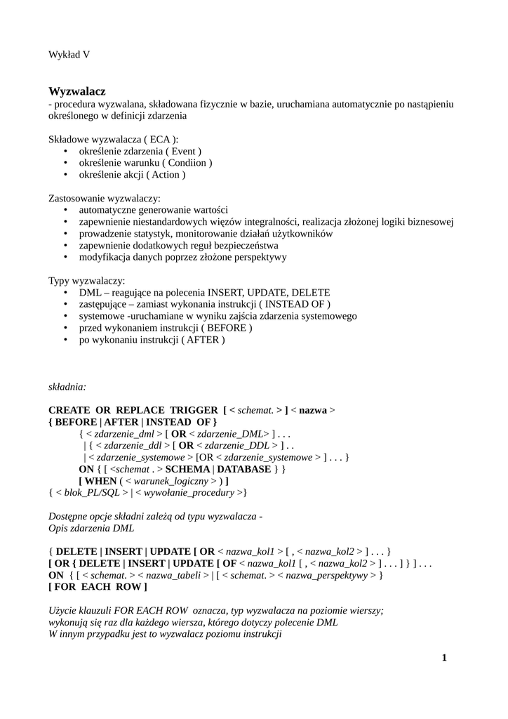 CREATE OR REPLACE TRIGGER [ < schemat. > ] < nazwa >