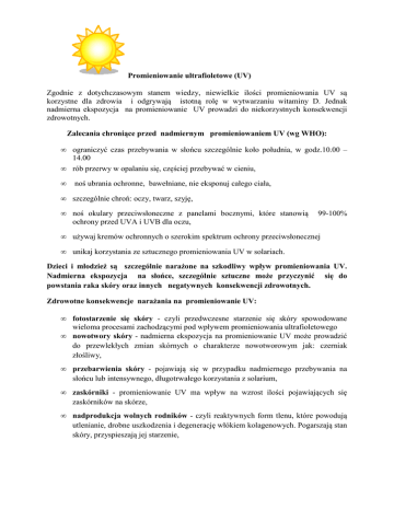 Promieniowanie ultrafioletowe (UV) Zgodnie z dotychczasowym stanem wiedzy, niewielkie ilości promieniowania UV są korzystne dla zdrowia i odgrywają istotną rolę w wytwarzaniu witaminy D. Jednak nadmierna ekspozycja na promieniowanie UV prowadzi do niekorzystnych konsekwencji zdrowotnych. Zalecania chroniące przed nadmiernym promieniowaniem UV (wg WHO): • • ograniczyć czas przebywania w słońcu szczególnie koło południa, w godz.10.00 – 14.00 rób przerwy w opalaniu się, częściej przebywać w cieniu, • noś ubrania ochronne, bawełniane, nie eksponuj całego ciała, • szczególnie chroń: oczy, twarz, szyję, • noś okulary przeciwsłoneczne z panelami bocznymi, które stanowią ochrony przed UVA i UVB dla oczu, • używaj kremów ochronnych o szerokim spektrum ochrony przeciwsłonecznej • unikaj korzystania ze sztucznego promieniowania UV w solariach. 99-100% Dzieci i młodzież są szczególnie narażone na szkodliwy wpływ promieniowania UV. Nadmierna ekspozycja na słońce, szczególnie sztuczne może przyczynić się do powstania raka skóry oraz innych negatywnych konsekwencji zdrowotnych. Zdrowotne konsekwencje narażania na promieniowanie UV: • • fotostarzenie się skóry - czyli przedwczesne starzenie się skóry spowodowane wieloma procesami zachodzącymi pod wpływem promieniowania ultrafioletowego nowotwory skóry - nadmierna ekspozycja na promieniowanie UV może prowadzić do przewlekłych zmian skórnych o charakterze nowotworowym jak: czerniak złośliwy, • przebarwienia skóry - pojawiają się w przypadku nadmiernego przebywania na słońcu lub intensywnego, długotrwałego korzystania z solarium, • zaskórniki - promieniowanie UV ma wpływ na wzrost ilości pojawiających się zaskórników na skórze, • nadprodukcja wolnych rodników - czyli reaktywnych form tlenu, które powodują utlenianie, drobne uszkodzenia i degenerację włókiem kolagenowych. Pogarszają stan skóry, przyspieszają jej starzenie, • immunosupresja - zwiększona ekspozycja na promieniowanie UV prowadzi do osłabienia układu odpornościowego. Udowodniono, że intensywne opalanie się prowadzi do reaktywacji wirusa opryszczki - Hermes Simplex Virus. • fotodermatozy – nienowotworowe choroby skóry, wynikające z powstających w organizmie szkodliwych związków, aktywujących się pod wpływem promieni UV, • choroby oczu – wykazano, że istnieje zależność między zaćmą a nadmierną ilością promieniowania UVB. • rumień i oparzenia słoneczne.