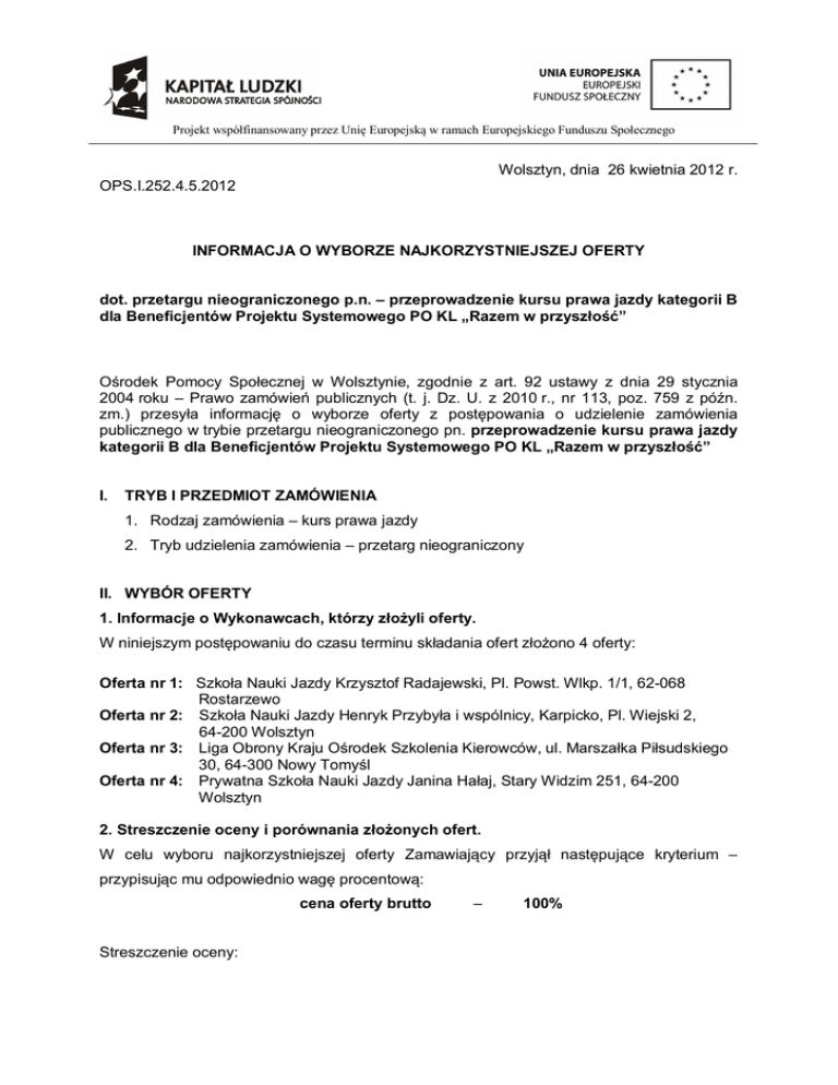 Projekt współfinansowany przez Unię Europejską w ramach Europejskiego Funduszu Społecznego Wolsztyn, dnia 26 kwietnia 2012 r. OPS.I.252.4.5.2012 INFORMACJA O WYBORZE NAJKORZYSTNIEJSZEJ OFERTY dot. przetargu nieograniczonego p.n. – przeprowadzenie kursu prawa jazdy kategorii B dla Beneficjentów Projektu Systemowego PO KL „Razem w przyszłość” Ośrodek Pomocy Społecznej w Wolsztynie, zgodnie z art. 92 ustawy z dnia 29 stycznia 2004 roku – Prawo zamówień publicznych (t. j. Dz. U. z 2010 r., nr 113, poz. 759 z późn. zm.) przesyła informację o wyborze oferty z postępowania o udzielenie zamówienia publicznego w trybie przetargu nieograniczonego pn. przeprowadzenie kursu prawa jazdy kategorii B dla Beneficjentów Projektu Systemowego PO KL „Razem w przyszłość” I. TRYB I PRZEDMIOT ZAMÓWIENIA 1. Rodzaj zamówienia – kurs prawa jazdy 2. Tryb udzielenia zamówienia – przetarg nieograniczony II. WYBÓR OFERTY 1. Informacje o Wykonawcach, którzy złożyli oferty. W niniejszym postępowaniu do czasu terminu składania ofert złożono 4 oferty: Oferta nr 1: Szkoła Nauki Jazdy Krzysztof Radajewski, Pl. Powst. Wlkp. 1/1, 62-068 Rostarzewo Oferta nr 2: Szkoła Nauki Jazdy Henryk Przybyła i wspólnicy, Karpicko, Pl. Wiejski 2, 64-200 Wolsztyn Oferta nr 3: Liga Obrony Kraju Ośrodek Szkolenia Kierowców, ul. Marszałka Piłsudskiego 30, 64-300 Nowy Tomyśl Oferta nr 4: Prywatna Szkoła Nauki Jazdy Janina Hałaj, Stary Widzim 251, 64-200 Wolsztyn 2. Streszczenie oceny i porównania złożonych ofert. W celu wyboru najkorzystniejszej oferty Zamawiający przyjął następujące kryterium – przypisując mu odpowiednio wagę procentową: cena oferty brutto Streszczenie oceny: – 100% Projekt współfinansowany przez Unię Europejską w ramach Europejskiego Funduszu Społecznego Łączna Lp. Cena brutto oferty / Przyznana ilość punktów w kryterium cena (przez 1 członka komisji) Nazwa Wykonawcy punktacja przyznana przez członków Komisji 1. Szkoła Nauki Jazdy Krzysztof Radajewski, Pl. Powst. Wlkp. 1/1, 62-068 Rostarzewo 11.600,00 zł /(10.400,00 zł / 11.600,00 zł) x 100 % x 100 pkt = 89,66 pkt 268,98 2. Szkoła Nauki Jazdy Henryk Przybyła i wspólnicy, Karpicko, Pl. Wiejski 2, 64-200 Wolsztyn 14.930,00 zł /(10.400,00 zł / 14.930,00 zł) x 100 % x 100 pkt = 69,66 pkt 208,98 3. Liga Obrony Kraju Ośrodek Szkolenia Kierowców, ul. Marszałka Piłsudskiego 30, 64-300 Nowy Tomyśl 10.512,00 zł /(10.400,00 zł / 10.512,00 zł) x 100 % x 100 pkt = 98,93 pkt 296,79 Prywatna Szkoła Nauki Jazdy Janina Hałaj, Stary Widzim 251, 64-200 Wolsztyn 10.400,00 zł /(10.400,00 zł / 10.400,00 zł) x 100 % x 100 pkt = 100,00 pkt 300,00 4. 3. Informacja o wyborze najkorzystniejszej oferty Do realizacji zamówienia wybrano ofertę, którą złożyła firma: Prywatna Szkoła Nauki Jazdy Janina Hałaj, Stary Widzim 251, 64-200 Wolsztyn Cena oferty wybranej: 10.400,00 zł Słownie: dziesięć tysięcy czterysta złotych 00/100 4.Uzasadnienie wyboru: Wykonawca spełnił wszystkie warunki udziału w postępowaniu zawarte w SIWZ i w ustawie – Prawo zamówień publicznych, złożył ofertę nie podlegającą odrzuceniu oraz otrzymał maksymalną ilość punktów w ocenie ofert.