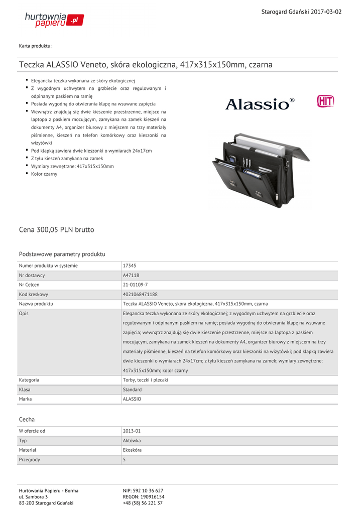 Starogard Gdański 2017-03-02 Karta produktu: Teczka ALASSIO Veneto, skóra ekologiczna, 417x315x150mm, czarna Elegancka teczka wykonana ze skóry ekologicznej Z wygodnym uchwytem na grzbiecie oraz regulowanym i odpinanym paskiem na ramię Posiada wygodną do otwierania klapę na wsuwane zapięcia Wewnątrz znajdują się dwie kieszenie przestrzenne, miejsce na laptopa z paskiem mocującym, zamykana na zamek kieszeń na dokumenty A4, organizer biurowy z miejscem na trzy materiały piśmienne, kieszeń na telefon komórkowy oraz kieszonki na wizytówki Pod klapką zawiera dwie kieszonki o wymiarach 24x17cm Z tyłu kieszeń zamykana na zamek Wymiary zewnętrzne: 417x315x150mm Kolor czarny Cena 300,05 PLN brutto Podstawowe parametry produktu Numer produktu w systemie 17345 Nr dostawcy A47118 Nr Celcen 21-01109-7 Kod kreskowy 4021068471188 Nazwa produktu Teczka ALASSIO Veneto, skóra ekologiczna, 417x315x150mm, czarna Opis Elegancka teczka wykonana ze skóry ekologicznej; z wygodnym uchwytem na grzbiecie oraz regulowanym i odpinanym paskiem na ramię; posiada wygodną do otwierania klapę na wsuwane zapięcia; wewnątrz znajdują się dwie kieszenie przestrzenne, miejsce na laptopa z paskiem mocującym, zamykana na zamek kieszeń na dokumenty A4, organizer biurowy z miejscem na trzy materiały piśmienne, kieszeń na telefon komórkowy oraz kieszonki na wizytówki; pod klapką zawiera dwie kieszonki o wymiarach 24x17cm; z tyłu kieszeń zamykana na zamek; wymiary zewnętrzne: 417x315x150mm; kolor czarny Kategoria Torby, teczki i plecaki Klasa Standard Marka ALASSIO Cecha W ofercie od 2013-01 Typ Aktówka Materiał Ekoskóra Przegrody 5 Hurtowania Papieru - Borma ul. Sambora 3 83-200 Starogard Gdański NIP: 592 10 36 627 REGON: 190916154 +48 (58) 56 221 37 Starogard Gdański 2017-03-02 Karta katalogowa produktu cd. Teczka ALASSIO Veneto, skóra ekologiczna, 417x315x150mm, czarna Produkt Teczka Wymiary Format A4 Wymiary (mm) 417x315x150 Wspólny słownik zamówień CPV 22817000-0 Terminarze lub organizery osobiste Certyfikaty Hit Hit Nowy produkt w ofercie Standard Kolor Kolor Czarny Pozostałe zdjęcia produktu Serdecznie zapraszamy do współpracy Hurtowania Papieru - Borma zespół. Hurtowania Papieru - Borma ul. Sambora 3 83-200 Starogard Gdański NIP: 592 10 36 627 REGON: 190916154 +48 (58) 56 221 37
