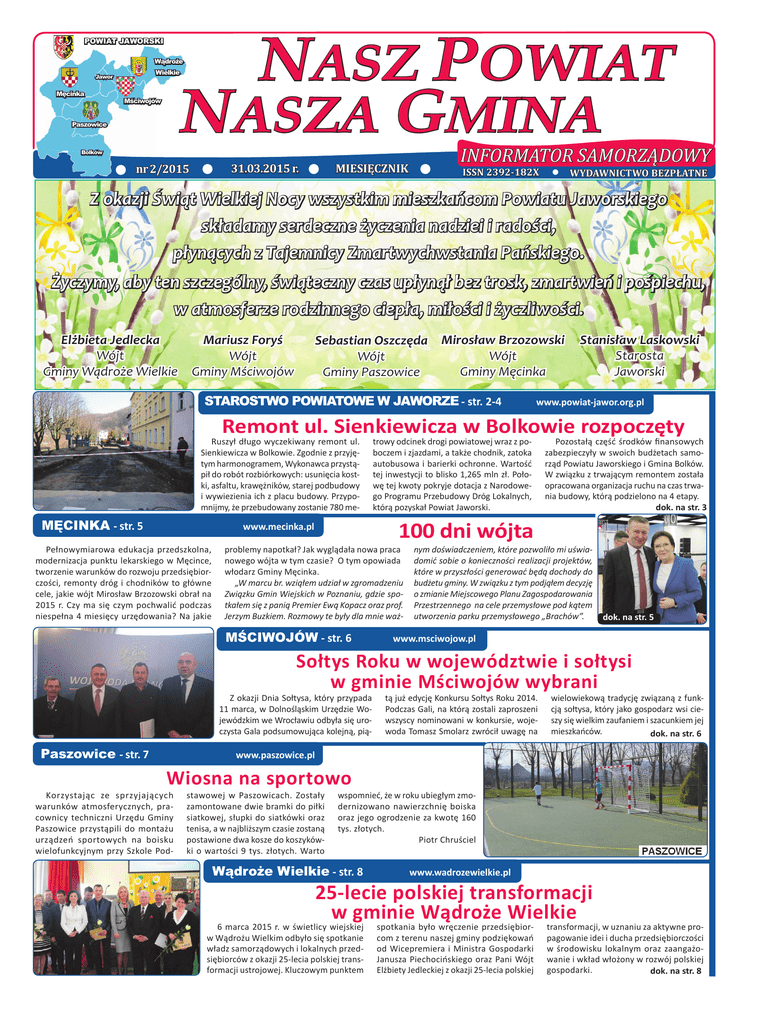 POWIAT JAWORSKI NASZ POWIAT NASZA GMINA Wądroże Męcinka Mściwojów Paszowice Bolków ● nr 2/2015 ● 31.03.2015 r. ● MIESIĘCZNIK ● INFORMATOR SAMORZĄDOWY ISSN 2392-182X ● Wielkie Jawor WYDAWNICTWO BEZPŁATNE Z okazji Świąt Wielkiej Nocy wszystkim mieszkańcom Powiatu Jaworskiego składamy serdeczne życzenia nadziei i radości, płynących z Tajemnicy Zmartwychwstania Pańskiego. Życzymy, aby ten szczególny, świąteczny czas upłynął bez trosk, zmartwień i pośpiechu, w atmosferze rodzinnego ciepła, miłości i życzliwości. Elżbieta Jedlecka Wójt Gminy Wądroże Wielkie Mariusz Foryś Wójt Gminy Mściwojów Sebastian Oszczęda Wójt Gminy Paszowice Mirosław Brzozowski Wójt Gminy Męcinka STAROSTWO POWIATOWE W JAWORZE - str. 2-4 Stanisław Laskowski Starosta Jaworski www.powiat-jawor.org.pl Remont ul. Sienkiewicza w Bolkowie rozpoczęty Ruszył długo wyczekiwany remont ul. Sienkiewicza w Bolkowie. Zgodnie z przyjętym harmonogramem, Wykonawca przystąpił do robót rozbiórkowych: usunięcia kostki, asfaltu, krawężników, starej podbudowy i wywiezienia ich z placu budowy. Przypomnijmy, że przebudowany zostanie 780 me- MĘCINKA - str. 5 Pozostałą część środków finansowych zabezpieczyły w swoich budżetach samorząd Powiatu Jaworskiego i Gmina Bolków. W związku z trwającym remontem została opracowana organizacja ruchu na czas trwania budowy, którą podzielono na 4 etapy. dok. na str. 3 100 dni wójta www.mecinka.pl Pełnowymiarowa edukacja przedszkolna, modernizacja punktu lekarskiego w Męcince, tworzenie warunków do rozwoju przedsiębiorczości, remonty dróg i chodników to główne cele, jakie wójt Mirosław Brzozowski obrał na 2015 r. Czy ma się czym pochwalić podczas niespełna 4 miesięcy urzędowania? Na jakie trowy odcinek drogi powiatowej wraz z poboczem i zjazdami, a także chodnik, zatoka autobusowa i barierki ochronne. Wartość tej inwestycji to blisko 1,265 mln zł. Połowę tej kwoty pokryje dotacja z Narodowego Programu Przebudowy Dróg Lokalnych, którą pozyskał Powiat Jaworski. problemy napotkał? Jak wyglądała nowa praca nowego wójta w tym czasie? O tym opowiada włodarz Gminy Męcinka. „W marcu br. wziąłem udział w zgromadzeniu Związku Gmin Wiejskich w Poznaniu, gdzie spotkałem się z panią Premier Ewą Kopacz oraz prof. Jerzym Buzkiem. Rozmowy te były dla mnie waż- MŚCIWOJÓW - str. 6 nym doświadczeniem, które pozwoliło mi uświadomić sobie o konieczności realizacji projektów, które w przyszłości generować będą dochody do budżetu gminy. W związku z tym podjąłem decyzję o zmianie Miejscowego Planu Zagospodarowania Przestrzennego na cele przemysłowe pod kątem utworzenia parku przemysłowego „Brachów”. dok. na str. 5 www.msciwojow.pl Sołtys Roku w województwie i sołtysi w gminie Mściwojów wybrani Z okazji Dnia Sołtysa, który przypada 11 marca, w Dolnośląskim Urzędzie Wojewódzkim we Wrocławiu odbyła się uroczysta Gala podsumowująca kolejną, pią- Paszowice - str. 7 tą już edycję Konkursu Sołtys Roku 2014. Podczas Gali, na którą zostali zaproszeni wszyscy nominowani w konkursie, wojewoda Tomasz Smolarz zwrócił uwagę na wielowiekową tradycję związaną z funkcją sołtysa, który jako gospodarz wsi cieszy się wielkim zaufaniem i szacunkiem jej mieszkańców. dok. na str. 6 www.paszowice.pl Wiosna na sportowo Korzystając ze sprzyjających warunków atmosferycznych, pracownicy techniczni Urzędu Gminy Paszowice przystąpili do montażu urządzeń sportowych na boisku wielofunkcyjnym przy Szkole Pod- stawowej w Paszowicach. Zostały zamontowane dwie bramki do piłki siatkowej, słupki do siatkówki oraz tenisa, a w najbliższym czasie zostaną postawione dwa kosze do koszykówki o wartości 9 tys. złotych. Warto wspomnieć, że w roku ubiegłym zmodernizowano nawierzchnię boiska oraz jego ogrodzenie za kwotę 160 tys. złotych. Piotr Chruściel Wądroże Wielkie - str. 8 www.wadrozewielkie.pl 25-lecie polskiej transformacji w gminie Wądroże Wielkie 6 marca 2015 r. w świetlicy wiejskiej w Wądrożu Wielkim odbyło się spotkanie władz samorządowych i lokalnych przedsiębiorców z okazji 25-lecia polskiej transformacji ustrojowej. Kluczowym punktem spotkania było wręczenie przedsiębiorcom z terenu naszej gminy podziękowań od Wicepremiera i Ministra Gospodarki Janusza Piechocińskiego oraz Pani Wójt Elżbiety Jedleckiej z okazji 25-lecia polskiej transformacji, w uznaniu za aktywne propagowanie idei i ducha przedsiębiorczości w środowisku lokalnym oraz zaangażowanie i wkład włożony w rozwój polskiej gospodarki. dok. na str. 8 Starostwo Powiatowe w Jaworze 31.03.2015 r. - NASZ POWIAT, NASZA GMINA - str. 2 Młodzież Zapobiega Pożarom XIII POWIATOWE TARGI EDUKACYJNE 27 marca 2015 roku w Auli PCKZiU w Jaworze odbyły się XIII Powiatowe Targi Edukacyjne zorganizowane przez Powiatowy Ośrodek Rozwoju Edukacji w Jaworze przy współpracy Powiatowego Centrum Kształcenia Zawodowego i Ustawicznego. Patronat honorowy nad przedsięwzięciem objęła Dolnośląska Kurator Oświaty Beata Pawłowicz oraz Starosta Jaworski Stanisław Laskowski. Celem Targów było zaprezentowanie uczniom powiatu jaworskiego dorobku oraz oferty edukacyjnej szkół ponadgimnazjalnych i szkół wyższych oraz ofert instytucji związanych z edukacją i rynkiem pracy. Młodzież miała możliwość zbadać swoje preferencje zawodowe, a dorośli wymienić doświadczenia, nawiązać współpracę z nauczycielami, szkołami i wystawcami. Oficjalnego otwarcia dokonała Dyrektor PORE Bogusława Kałużna oraz Starosta Jaworski - Stanisław Laskowski. Dla uczniów klas III gimnazjum na targach zaprezentowały się szkoły ponadgimnazjalne naszego powiatu: I Liceum Ogólnokształcące w Jaworze, Powiatowe Centrum Kształcenia Zawodowego i Ustawicznego w Jaworze, Zespół Szkół Agrobiznesu z Bolkowa. Swoją ofertę edukacyjną, skierowaną przede wszystkim dla uczniów i absolwent