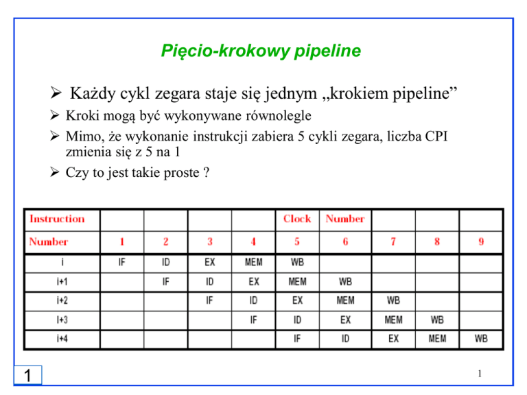 Pięcio-krokowy pipeline Każdy cykl zegara staje się jednym „krokiem pipeline” Kroki mogą być wykonywane równolegle Mimo, że wykonanie instrukcji zabiera 5 cykli zegara, liczba CPI zmienia się z 5 na 1 Czy to jest takie proste ? 1 1 Realizacja Pipeline CC1 CC2 CC3 CC4 CC5 CC6 CC7 CC8 Czas IM DM REG IM DM REG IM REG DM REG IM REG DM REG IM 2 REG REG REG DM REG 2 Three observations It is not so simple ! What can happens on every clock cycle ? For example: a single ALU cannot be asked to compute an effective address and perform an arithmetic operation at the same time. Happily the major functional units are used in different cycles, and hence overlapping the execution of multiple instructions introduced relatively few conflicts. There are three observation on which this fact rests: We use separate instruction and data memories (implemented typically as caches) The register file is used in the two stages: one for reading in ID and one for writing in WB To start a new instruction every clock, we must increment and store the PC every clock, and this must be done during the IF stage in preparation for the next instruction 3 3 The pipeline data paths – skeleton used EX/MEM MEM/WB im 4 (pipeline registers) reg alu dm reg im reg alu dm reg im reg alu dm reg im reg alu dm reg im reg alu dm reg 4 Basic Performance Issues Pipelining increases the CPU instruction throughput but it does not reduce the execution time of an individual instruction, however a program runs faster instruction throughput,pipeline latency). An Example: Let’s consider the unpipelined processor with 1 ns clock cycle which uses 4 cycles for ALU operations and branches and 5 cycles for memory operations. Assume that the relative frequencies of these operations are 40%, 20% and 40%, respectively. The total clock overhead for pipelined is 0,2 ns. The average instruction execution time on the unpipelined processor is equal to clock cycle * average CPI = 1ns * ((40%+20%)* 4+40%*5) = 4,4 ns For pipeline processor average instruction execution time is 1,2 ns (the clock must run at the speed of the lowest stage plus overhead). Then speedup from pipelining = 4,4ns/1,2ns = 3,7 times 5 5 Konflikty w przetwarzaniu pipeline Konflikt zasobów – występuje jeśli kilka instrukcji żąda tego samego zasobu Konflikt danych – występuje jeśli argument instrukcji jest wyliczany przez instrukcję bezpośrednio poprzedzającą Konflikt sterowania – występuje podczas wykonania instrukcji sterujących, np.: skoku warunkowego 6 6 Performance of Pipes with Stalls I A stall causes the pipeline performance to degrade from the ideal performance Let’s start from the previous formula It can be calculated as follows The ideal CPI on a pipelined processor is almost 1. Hence, we can compute the pipelined CPI (decreasing the CPI) 1 pipeline stall clock cycles per instruction 7 7 Performance of Pipes with Stalls II When we ignored the cycle time overheads then the speedup can be expressed by (clock cycles are equal): If all instruction take the same number of cycles, which must also equal the number of pipeline stages (the depth of the pipelined) then: This leads to result that pipelining can improve performance by the depth of the pipeline (if no pipeline stalls) 8 8 Performance of Pipes with Stalls III Now we assume that the CPI of the unpipelined processor, as well as that of the pipelined , is 1 (decreasing the clock cycle tme). 1 Clock cycle unpipelined * 1 Pipeline stall cycles per instruction Clock cycle pipelined When pipe stages are perfectly balanced and there are no overheads, the clock cycle on the pipelined processor is smaller than the clock cycle of the unpipelined processor by a factor equal to the pipelined depth, so speedup is expressed by: Speedup from pipelining 1 * pipeline depth 1 pipeline stall cycles per instruction This leads to conclusion, that if there are no stalls, the speedup is equal to the number of pipeline stages. 9 9 Structural Hazards The overlapped execution of instructions requires pipelining of functional units and duplication of resources to allow all possible combination of instruction in the pipeline. If some combination of instructions cannot be accommodated because of resource conflicts, the processor is said to have a structural hazard (+ some functional unit is not fully pipelined) It can happened when we need access to: Memory Registers Processor To resolve this, we stall one of the instructions until the required resource is available. A stall is commonly called a pipeline bubble. 10 10 Przykład konfliktu zasobów Load Instr.1 Instr.2 Instr.3 Instr.4 11 im Mem. access reg alu dm reg im reg alu dm reg im reg alu dm reg im reg alu dm reg im reg alu dm mem Mem. access reg 11 Konflikt zasobów rozwiązanie Instrukcja Load Instr. 1 Instr. 2 Instr. 3 Instr. 4 Instr. 5 12 Numer cyklu zegarowego 1 2 3 4 5 6 7 8 9 IF ID EX MEM WB IF ID EX MEM WB IF ID EX MEM WB stall IF ID IF 10 EX MEM WB ID EX MEM WB IF ID EX MEM 12 Structural hazard cost Let’s assume: – Data references constitute 40% of the mix, – Ideal CPI is equal to 1, – A clock rate for processor with structural hazard is 1.05 times higher than without hazard If the pipeline without structural hazard is faster, and by how much ? Average intr. time CPI * Clock cycle time Clock cycle timeideal (1 0.4 * 1) * 1.05 1.3 * Clock cycle timeideal The processor without structural hazard is 1,3 times faster. 13 13 Data hazards Data hazards occur when the pipeline changes the order of read/write accesses to operands so that the order differs from the order seen by sequentially executing instruction on an unpipelined processor. Let’s consider the execution of following instructions: DADD DSUB AND OR XOR 14 R1,R2,R3 R4,R1,R5 R6,R1,R7 R8,R1,R9 R10,R1,R11 14 Przykład konfliktu danych im DADD R1,R2,R3 DSUB R4,R1,R5 reg alu dm reg im reg alu dm reg im reg alu dm reg im reg alu dm reg im reg alu dm AND R6,R1,R7 OR R8,R1,R9 XOR R10,R1,R11 15 DADD DSUB A