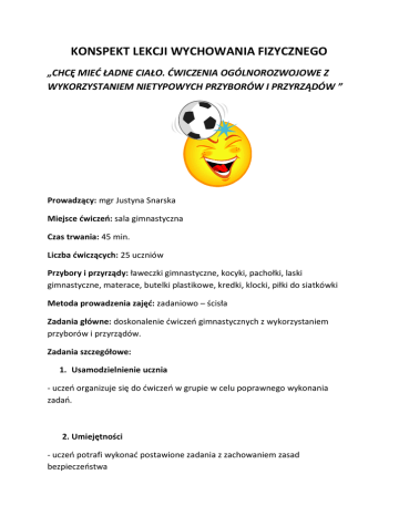 KONSPEKT LEKCJI WYCHOWANIA FIZYCZNEGO „CHCĘ MIEĆ ŁADNE CIAŁO. ĆWICZENIA OGÓLNOROZWOJOWE Z WYKORZYSTANIEM NIETYPOWYCH PRZYBORÓW I PRZYRZĄDÓW ” Prowadzący: mgr Justyna Snarska Miejsce ćwiczeń: sala gimnastyczna Czas trwania: 45 min. Liczba ćwiczących: 25 uczniów Przybory i przyrządy: ławeczki gimnastyczne, kocyki, pachołki, laski gimnastyczne, materace, butelki plastikowe, kredki, klocki, piłki do siatkówki Metoda prowadzenia zajęć: zadaniowo – ścisła Zadania główne: doskonalenie ćwiczeń gimnastycznych z wykorzystaniem przyborów i przyrządów. Zadania szczegółowe: 1. Usamodzielnienie ucznia - uczeń organizuje się do ćwiczeń w grupie w celu poprawnego wykonania zadań. 2. Umiejętności - uczeń potrafi wykonać postawione zadania z zachowaniem zasad bezpieczeństwa - współdziałanie ćwiczących w celu osiągnięcia precyzji ruchu 3. Wiadomości - podstawowe wiadomości z zakresu techniki wykonywania wymienionych ćwiczeń fizycznych - znajomość terminologii gimnastycznej – nazewnictwo ćwiczeń - wpływ ćwiczeń gimnastycznych w pobudzaniu odwagi i sprawności ogólnej - dobór ćwiczeń kształtujących określoną sprawność fizyczną. 4. Motoryczność - podnoszenie poziomu siły poszczególnych partii mięśni - kształtowanie dokładności ruchowej - rozwijanie koordynacji ruchowej 5. Cele dydaktyczne - kształcący: kształcenie wybranych cech motoryki, poprawa sprawności ogólnej ucznia - poznawczy: poznanie nowych ćwiczeń gimnastycznych - wychowawczy: zrozumienie istoty wykonywania ćwiczeń, samodyscyplina, Część lekcyjna I wstępna Tok zajęć Czynności Organizacyjne RozgrzewkaĆwiczenia kształtujące Zadanie i przebieg zajęć Uwagi organizacyjne 1. Zbiórka 2. Powitanie 3. Sprawdzenie gotowości do zajęć 4. Podanie zadań lekcji 5. Motywacja Zabawa ożywiająca „ Berek” Uczeń w roli berka dotyka ramienia uciekających 15 min ćwiczących. Ćwiczący dotknięty przez berka staje w rozkroku i czeka aż inny ćwiczący przejdzie pod jego nogami. Po wykonaniu tego zadania uczeń ponownie może brać udział w zabawie. Podział ćwiczących na pięć grup ćwiczebnych. Każda z grup ustawia się w rzędzie na jednym końcu sali . Na sygnał kolejno każdy z ćwiczących wykonuje zadane ćwiczenie poruszając się na drugi koniec sali. - podskoki - ćwiczenia ramion - ćwiczenia bieżne - ćwiczenia skoczne II główna Ćwiczenia ogólnorozwojowe z wykorzystanie przyborów i przyrządów Przydzielenie grupom zadań Obwód ćwiczebny. Zmiana ruchowych. Objaśnienie stacji po 3 min. wykonywanych ćwiczeń. 25 m 1. Ćwiczenia równoważne na ławeczkach 2. Ćwiczenia Clappana czworakach z wykorzystaniem III Ćwiczenia końcowa uspokajające kocyków 3. Ćwiczenia przeciw płaskostopiuwrzucanie za pomocą stóp mazaków i klocków do butelki 4. Ćwiczenia kształtujące mięśnie brzucha- ćwiczenia z laską gimnastyczną 5. Ćwiczenia kształtujące mięśnie grzbietu Przy każdej stacji umieszczony jest rysunek objaśniający sposób wykonania ćwiczenia. Ćwiczenia oddechowe. „Płatki śniegu” Sprzątnięcie miejsc ćwiczeń. Każda grupa sprząta swoją stację 5 min. Czynności organizacyjne 1. Zbiórka 2. Podsumowanie lekcji 3. Ewaluacja 4. Pożegnanie