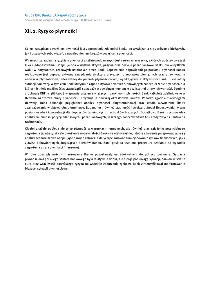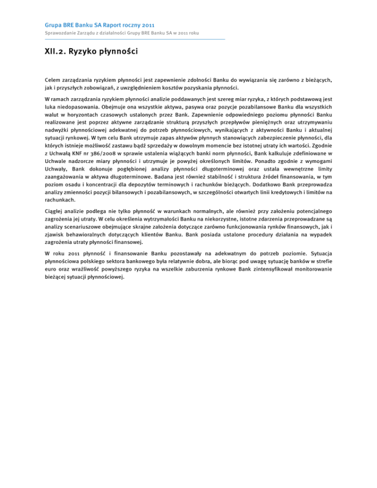 Grupa BRE Banku SA Raport roczny 2011 Sprawozdanie Zarządu z działalności Grupy BRE Banku SA w 2011 roku XII.2. Ryzyko płynności Celem zarządzania ryzykiem płynności jest zapewnienie zdolności Banku do wywiązania się zarówno z bieżących, jak i przyszłych zobowiązań, z uwzględnieniem kosztów pozyskania płynności. W ramach zarządzania ryzykiem płynności analizie poddawanych jest szereg miar ryzyka, z których podstawową jest luka niedopasowania. Obejmuje ona wszystkie aktywa, pasywa oraz pozycje pozabilansowe Banku dla wszystkich walut w horyzontach czasowych ustalonych przez Bank. Zapewnienie odpowiedniego poziomu płynności Banku realizowane jest poprzez aktywne zarządzanie strukturą przyszłych przepływów pieniężnych oraz utrzymywaniu nadwyżki płynnościowej adekwatnej do potrzeb płynnościowych, wynikających z aktywności Banku i aktualnej sytuacji rynkowej. W tym celu Bank utrzymuje zapas aktywów płynnych stanowiących zabezpieczenie płynności, dla których istnieje możliwość zastawu bądź sprzedaży w dowolnym momencie bez istotnej utraty ich wartości. Zgodnie z Uchwałą KNF nr 386/2008 w sprawie ustalenia wiążących banki norm płynności, Bank kalkuluje zdefiniowane w Uchwale nadzorcze miary płynności i utrzymuje je powyżej określonych limitów. Ponadto zgodnie z wymogami Uchwały, Bank dokonuje pogłębionej analizy płynności długoterminowej oraz ustala wewnętrzne limity zaangażowania w aktywa długoterminowe. Badana jest również stabilność i struktura źródeł finansowania, w tym poziom osadu i koncentracji dla depozytów terminowych i rachunków bieżących. Dodatkowo Bank przeprowadza analizy zmienności pozycji bilansowych i pozabilansowych, w szczególności otwartych linii kredytowych i limitów na rachunkach. Ciągłej analizie podlega nie tylko płynność w warunkach normalnych, ale również przy założeniu potencjalnego zagrożenia jej utraty. W celu określenia wytrzymałości Banku na niekorzystne, istotne zdarzenia przeprowadzane są analizy scenariuszowe obejmujące skrajne założenia dotyczące zarówno funkcjonowania rynków finansowych, jak i zjawisk behawioralnych dotyczących klientów Banku. Bank posiada ustalone procedury działania na wypadek zagrożenia utraty płynności finansowej. W roku 2011 płynność i finansowanie Banku pozostawały na adekwatnym do potrzeb poziomie. Sytuacja płynnościowa polskiego sektora bankowego była relatywnie dobra, ale biorąc pod uwagę sytuację banków w strefie euro oraz wrażliwość powyższego ryzyka na wszelkie zaburzenia rynkowe Bank zintensyfikował monitorowanie bieżącej sytuacji płynnościowej.