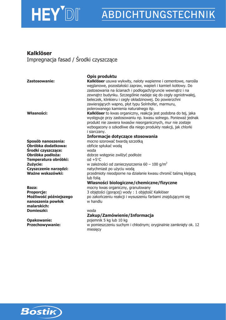 Kalklöser Impregnacja fasad / ĝrodki czyszczące Opis produktu Zastosowanie: WáasnoĞci: Kalklöser usuwa wykwity, naloty wapienne i cementowe, naroĞla wĊglanowe, pozostaáoĞci zapraw, wapieĔ i kamieĔ kotáowy. Do zastosowania na Ğcianach i podáogach/gruncie wewnątrz i na zewnątrz budynku. Szczególnie nadaje siĊ do cegáy ogniotrwaáej, beleczek, klinkieru i cegáy okáadzinowej. Do powierzchni zawierających wapno, páyt typu Solnhofer, marmuru, polerowanego kamienia naturalnego itp. Kalklöser to kwas organiczny, reakcja jest podobna do tej, jaka wystĊpuje przy zastosowaniu np. kwasu solnego. PoniewaĪ jednak produkt nie zawiera kwasów nieorganicznych, mur nie zostaje wzbogacony o szkodliwe dla niego produkty reakcji, jak chlorki i siarczany. Informacje dotyczące stosowania Sposób nanoszenia: Obróbka dodatkowa: ĝrodki czyszczące: Obróbka podáoĪa: Temperatura obróbki: ZuĪycie: Czyszczenie narzĊdzi: WaĪne wskazówki: mocno szorowaü twardą szczotką obficie spáukaü wodą woda dobrze wstĊpnie zwilĪyü podáoĪe od +5qC w zaleĪnoĞci od zanieczyszczenia 60 – 100 g/m2 natychmiast po uĪyciu wodą przedmioty nieodporne na dziaáanie kwasu chroniü taĞmą klejącą lub folią Baza: Proporcje: MoĪliwoĞü póĨniejszego nanoszenia powáok malarskich: Domieszki: mocny kwas organiczny, granulowany 3 objĊtoĞci (gorącej) wody : 1 objĊtoĞü Kalklöser po zakoĔczeniu reakcji i wysuszeniu farbami znajdującymi siĊ w handlu Opakowanie: Przechowywanie: pojemnik 5 kg lub 10 kg w pomieszczeniu suchym i cháodnym; oryginalnie zamkniĊty ok. 12 miesiĊcy WáasnoĞci biologiczne/chemiczne/fizyczne woda Zakup/Zamówienie/Informacja 4QJTUSFžDJ 4QJTUSFžDJ 1PXZƒT[ZDIXTLB[ØXFLVE[JFMBNZ1BŴTUXVOBQPETUBXJFQS[FQSPXBE[POZDIQSØCJEPžXJBED[FŴ/JFHXBSBOUVKFNZKFEOBL[B FGFLULPŴDPXZXKFEOPTULPXZNQS[ZQBELV[QPXPEVNPƒMJXPžDJS؃OPSPEOFHP[BTUPTPXBOJBOBT[ZDIQSPEVLUØXKBLJOJF[B MFƒOZDIPEOBTXBSVOLØXNBHB[ZOPXBOJBJVƒZDJB0CPXJŕ[VKFUPSØXOJFƒXXZQBELVSPT[D[FŴX[HMŢEFNOBT[ZDIEPSBEDØX UFDIOJD[OZDIJIBOEMPXZDI;BMFDBTJŢQS[FQSPXBE[BOJFXBTOZDIQSØC 8NPNFODJFVLB[BOJBTJŢOJOJFKT[FHPQSPTQFLUVXT[ZTULJFXZEBOJB[PTUBKŕVOJFXBƒOJPOF8ZEBOP #PTUJL1PMTLB4Q[PPtVMĽSFE[LBt,MFT[D[FXPL1P[OBOJB Bostik Sp. z o.o. • ul. Średzka 8 • 63-005 Kleszczewo k./Poznania 5FM'BYt5FMt5FM Tel. / Fax 061 / 663 88 87 • Tel. 061 / 663 88 86 • Tel. 502 / 16 16 26