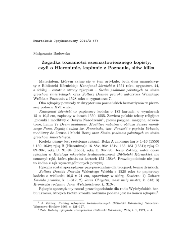 Kwartalnik Językoznawczy 2011/3 (7) Małgorzata Badowska Zagadka tożsamości szesnastowiecznego kopisty, czyli o Hieronimie, kapłanie z Poznania, słów kilka Materiałem, którym zajmę się w tym artykule, będą dwa manuskrypty z Biblioteki Kórnickiej: Kancjonał kórnicki z 1551 roku, sygnatura 44, a ściślej – ostatnie strony rękopisu – Siedm psalmow pokutnych za siedm grzechow śmiertelnych, oraz Żołtarz Dawida proroka autorstwa Walentego Wróbla z Poznania z 1528 roku o sygnaturze 7. Oba rękopisy powstały w skryptorium poznańskich bernardynów w pierwszej połowie XVI wieku. Kancjonał kórnicki to papierowy kodeks o 183 kartach, o wymiarach 15 × 10,5 cm, zapisany w latach 1550–1555. Zawiera polskie teksty religijne: „piosnki i modlitwy o Bożym Narodzeniu”, pieśni pasyjne, maryjne, adwentowe, hymn Te Deum laudamus, Modlitwę nabożną o obliczu Jezusa namilszego Pana, Regułę i zakon św. Franciszka, tzw. Powieść o papieżu Urbanie, modlitwy do Jezusa i Matki Bożej oraz Siedm psalmow pokutnych za siedm grzechow śmiertelnych. Kodeks pisany jest sześcioma rękami. Ręką A zapisano karty 1–16 (1550) i 159–163v; ręką B (Hieronima): 16–88v, 96v–151v, 165–183 (1551); ręką C: 89–90v; ręką D: 91–94 (1555); ręką E: 94v–96. Jerzy Zathey, autor opisu rękopisu w Katalogu rękopisów średniowiecznych Biblioteki Kórnickiej, nie oznaczył ręki, która pisała na kartach 152–158v1 . Prawdopodobnie nie jest to żadna z rąk wyszczególnionych powyżej. Rękopis został sporządzony przypuszczalnie dla tercjarek bernardyńskich. Żołtarz Dawida Proroka Walentego Wróbla z 1528 roku to papierowy kodeks o wielkości 16,5 x 21 cm, oprawiony w skórę. Zawiera: 1) Żołtarz Dawida proroka, k. 1–312; 2) Jezus Chrystus, nasz miły mistrz, k. 313; 3) Kroniczka rodzinna Jana Wyleżyńskiego, k. 313v. Rękopis sporządzony został prawdopodobnie dla rodu Wyleżyńskich herbu Trzaska, których krótka kronika rodzinna podana jest na końcu rękopisu2 . 1 J. Zathey, Katalog rękopisów średniowiecznych Biblioteki Kórnickiej, Wrocław– Warszawa–Kraków 1963, s. 121–127. 2 Zob. Katalog rękopisów staropolskich Biblioteki Kórnickiej PAN, t. 1, 1971, s. 4. Małgorzata Badowska, Zagadka tożsamości szesnastowiecznego kopisty... 98 *** Pierwsza wzmianka o Kancjonale kórnickim pojawiła się w 1844 roku w VI tomie Historii literatury polskiej. Autor tej wiadomości – Michał Wiszniewski – określił manuskrypt jako „zbiór najdawniejszych kantyczek” należący do hrabiego Działyńskiego. Bardziej szczegółowy opis zawiera kartkowy katalog rękopiśmiennych zbiorów kórnickich z 1875 roku, sporządzony przez ówczesnego dyrektora Biblioteki – Zygmunta Celichowskiego. To właśnie Celichowski jako pierwszy zasygnalizował pewną istotną kwestię – otóż pismo głównego kopisty Kancjonału jest bardzo podobne do szlachetnej tekstury kopisty Żołtarza Dawida proroka3 . W obu rękopisach kopiści się podpisali: na ostatniej karcie Siedmiu psalmow widnieje podpis „Jeronimus” z datą 1551, a na karcie 312 verso Żołtarza – „Jeronim, kapłan z Poznania”. Ryc. 1. Autograf Jeronima z 1528 roku Ryc. 2. Autograf Jeronima z 1551 roku Żaden z kolejnych badaczy nie zdecydował się na postawienie rozstrzygającej tezy; niektórzy, jak na przykład Roman Mazurkiewicz, twierdzili, że dopiero dokładne zbadanie grafii obu zabytków może udzielić jednoznacznej odpowiedzi na pytanie, czy obaj kopiści nie byli tą samą osobą. 3 Zob. „Jaśniejsza tysiąc nad słońce”. Pieśni i modlitwy z tzw. Kancjonału kórnickiego, oprac. R. Mazurkiewicz, Kraków 2000, s. 10, 17. Małgorzata Badowska, Zagadka tożsamości szesnastowiecznego kopisty... 99 Oto przegląd podobieństw obu rękopisów: Po pierwsze – oba manuskrypty pisane są bardzo podobnym charakterem pisma, ale manuskrypty różnią się między sobą kształtem litery y oraz inicjałami A i D. Dodam, że pismo w Kancjonale kórnickim jest o wiele mniej staranne, przez co nie jest tak zwarte, jak w Żołtarzu. Mimo że Żołtarz nie był bogato iluminowany, to zdobnictwo Siedmiu psalmow jest jeszcze uboższe. Zgadzałoby się to z typem odbiorcy – o wiele staranniejszy był rękopis przeznaczony dla szlacheckiej rodziny Wyleżyńskich, niż kancjonał napisany na potrzeby franciszkańskiego bractwa. Różnica w kształcie liter zaś może być z łatwością wytłumaczona odstępem czasowym – przecież od przepisania Żołtarza do skopiowania Siedmiu psalmow i innych tekstów z Kancjonału minęły co najmniej dwadzieścia trzy lata, a jak twierdził Stanisław Rospond: „Ten sam pisarz w młodości może pisać inaczej niż w podeszłym wieku”4 . Po drugie – imię kopisty jest takie samo. Na dodatek oba teksty powstały w tym samym skryptorium, z którym powiązane są także inne rękopisy Biblioteki Kórnickiej o sygnaturach: 56, 97, 101, 119. Nawet oprawy zdradzają pochodzenie z tego samego warsztatu introligatorskiego, tak samo jak papier pochodzi z jednej papierni – poznańskiej5 . Prawdopodobieństwo, że kopistą mógł być ten sam człowiek, zakonnik bernardyński, wobec tego wzrasta. Po trzecie – odstęp czasowy pomiędzy pierwszym rękopisem a drugim nie wyklucza, że pisać je mogła ta sama ręka. Hieronim z Poznania, przepisując pierwszy kodeks, mógł mieć około dwudziestu paru lat, może był świeżo po święceniach, skoro podkreślił w podpisie fakt swojego kapłaństwa. W 1551 roku miałby więc około pięćdziesięciu lat. Do powyższych dodam własne spostrzeżenie: psalmy pokutne z Kancjonału to wyekscerpowane psalmy z Żołtarza Dawida proroka Walentego Wróbla, a więc psalmy: 6, 32 (31), 38 (37), 51 (50), 102 (101), 130 (129), 143 (142). *** Kim był autor psałterza, Walenty Wróbel? Żył w latach 1475–1537. Pochodził z Poznania, był profesorem Akademii Krakowskiej, kaznodzieją. Uważany jest za pierwszego biblist