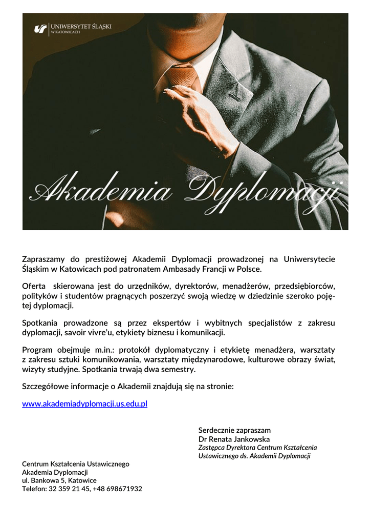 Zapraszamy do prestiżowej Akademii Dyplomacji prowadzonej na Uniwersytecie Śląskim w Katowicach pod patronatem Ambasady Francji w Polsce. Oferta skierowana jest do urzędników, dyrektorów, menadżerów, przedsiębiorców, polityków i studentów pragnących poszerzyć swoją wiedzę w dziedzinie szeroko pojętej dyplomacji. Spotkania prowadzone są przez ekspertów i wybitnych specjalistów z zakresu dyplomacji, savoir vivre’u, etykiety biznesu i komunikacji. Program obejmuje m.in.: protokół dyplomatyczny i etykietę menadżera, warsztaty z zakresu sztuki komunikowania, warsztaty międzynarodowe, kulturowe obrazy świat, wizyty studyjne. Spotkania trwają dwa semestry. Szczegółowe informacje o Akademii znajdują się na stronie: www.akademiadyplomacji.us.edu.pl Serdecznie zapraszam Dr Renata Jankowska Zastępca Dyrektora Centrum Kształcenia Ustawicznego ds. Akademii Dyplomacji Centrum Kształcenia Ustawicznego Akademia Dyplomacji ul. Bankowa 5, Katowice Telefon: 32 359 21 45, +48 698671932