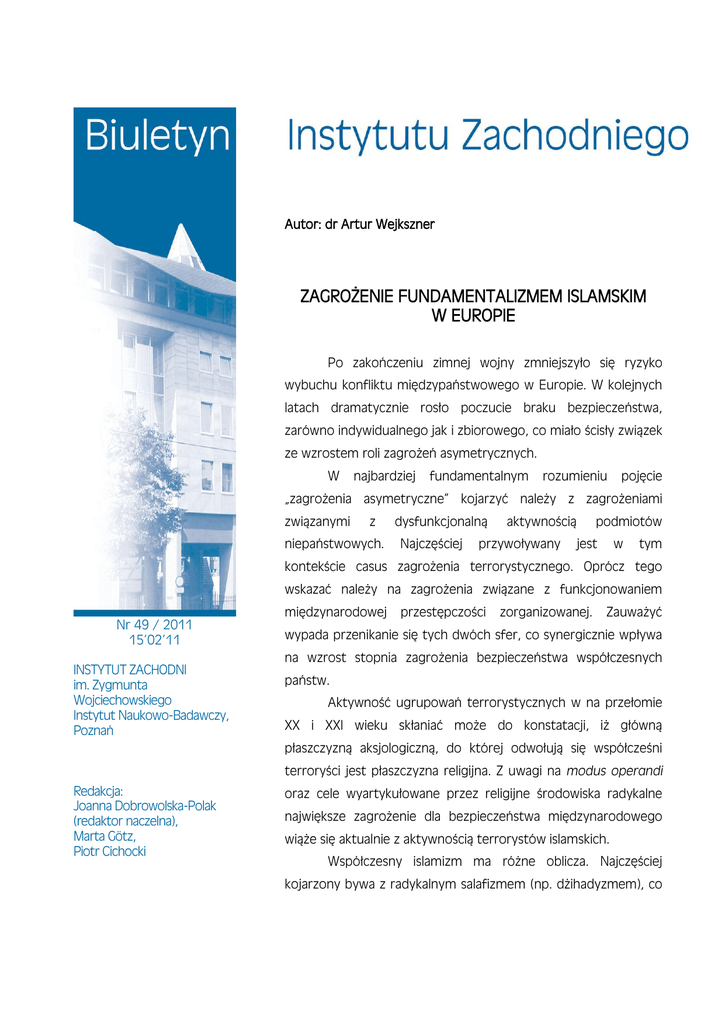 Autor: dr Artur Wejkszner ZAGROŻENIE FUNDAMENTALIZMEM ISLAMSKIM W EUROPIE Po zakończeniu zimnej wojny zmniejszyło się ryzyko wybuchu konfliktu międzypaństwowego w Europie. W kolejnych latach dramatycznie rosło poczucie braku bezpieczeństwa, zarówno indywidualnego jak i zbiorowego, co miało ścisły związek ze wzrostem roli zagrożeń asymetrycznych. W najbardziej fundamentalnym rozumieniu pojęcie „zagrożenia asymetryczne” kojarzyć należy z zagrożeniami związanymi z niepaństwowych. dysfunkcjonalną Najczęściej aktywnością przywoływany podmiotów jest w tym kontekście casus zagrożenia terrorystycznego. Oprócz tego wskazać należy na zagrożenia związane z funkcjonowaniem Nr 49 / 2011 15„02„11 INSTYTUT ZACHODNI im. Zygmunta Wojciechowskiego Instytut Naukowo-Badawczy, Poznań międzynarodowej przestępczości zorganizowanej. Zauważyć wypada przenikanie się tych dwóch sfer, co synergicznie wpływa na wzrost stopnia zagrożenia bezpieczeństwa współczesnych państw. Aktywność ugrupowań terrorystycznych w na przełomie XX i XXI wieku skłaniać może do konstatacji, iż główną płaszczyzną aksjologiczną, do której odwołują się współcześni terroryści jest płaszczyzna religijna. Z uwagi na modus operandi Redakcja: Joanna Dobrowolska-Polak (redaktor naczelna), Marta Götz, Piotr Cichocki oraz cele wyartykułowane przez religijne środowiska radykalne największe zagrożenie dla bezpieczeństwa międzynarodowego wiąże się aktualnie z aktywnością terrorystów islamskich. Współczesny islamizm ma różne oblicza. Najczęściej kojarzony bywa z radykalnym salafizmem (np. dżihadyzmem), co uznać należy za nadużycie wynikające z niewiedzy lub islamofobii. W literaturze przedmiotu używanych jest wiele terminów przybliżających w mniejszym lub większym stopniu odpowiedź na pytanie o jego istotę. Badacze problematyki wskazują np. na fundamentalizm islamski, islam polityczny czy radykalny islam, abstrahując często od głębszego wytłumaczenia tych pojęć. Wielu autorów, m.in. Daniel Pipes, uważa, iż islamizm jest kolejnym przykładem manifestacji radykalnych utopijnych ideologii czego w szczególności Europa doświadczała już w wieku XX. Ta generalizacja nie jest jednak uzasadniona. Poprzez termin „islamizm” (lub jego synonim w postaci „islamskiego aktywizmu”1) należy rozumieć bowiem islamski ruch polityczny, którego członkowie głoszą określony zespół poglądów dotyczących relacji społeczno-politycznych w społeczeństwach muzułmańskich oraz promują określone sposoby wprowadzenia ich w życie (niekoniecznie w oparciu o użycie przemocy). Radykalne grupy islamistyczne, w tym grupy dżihadystów stanowią jedynie niewielką część całego spektrum islamskiego aktywizmu we współczesnym świecie. Duża część ugrupowań islamistycznych, działających w ramach tzw. nurtu salafickiego walczy z lokalnymi świeckimi reżimami w państwach muzułmańskich o zmianę ustroju społeczno-politycznego i wprowadzenie w życie reguł prawa islamskiego, najczęściej środkami pokojowymi. Ruch odrodzenia islamu, a więc tzw. ruch salaficki jest zróżnicowany wewnętrznie. Zdecydowanie dominują zorientowane na realizowanie pokojowe w nim grupy swych planów polityczno-religijnych. Radykalne środowiska islamistyczne stanowią poważne wyzwanie dla Unii Europejskiej sensu largo i rządów poszczególnych państw członkowskich sensu stricto. Wyzwanie to związane jest z istnieniem kilku istotnych płaszczyzn funkcjonowania islamistycznych środowisk w Europie. Wśród nich warto zwrócić uwagę na pięć podstawowych. 1 Por. Thomas Hegghammer, Global Jihadism after the Iraq War, “Middle East Journal” Vol. 60, No. 1, Winter 2006, s. 11. Biuletyn Instytutu Zachodniego • www.iz.poznan.pl 2 1. Działalność propagandowo-indoktrynacyjna. 2. Aktywizm islamistyczny. 3. Kryminalizacja aktywności islamistycznej. 4. Rekrutacja członków komórek terrorystycznych. 5. Aktywność terrorystyczna. Działalność propagandowo-indoktrynacyjna związana jest z promocją określonego światopoglądu przez środowiska islamistyczne. Mając na uwadze wskazane wyżej szerokie spektrum poglądów promowanych w ramach tzw. ruchu odnowy islamu warto skupić się (z uwagi na wysoki poziom zagrożenia ze strony tej grupy dżihadystycznych. radykalnej) na Współczesna aktywności działalność środowisk propagandowa podejmowana przez powyższą grupę kojarzona jest z tzw. e-dżihadem. Jej wyróżnikiem jest wykorzystywanie kanałów elektronicznych, dzięki którym dżihadyści mają możliwość efektywnego dotarcia ze swymi poglądami do szerokiej rzeszy muzułmanów w Europie (i rzecz jasna poza nią). Znaczenie tego typu działań wiąże się ściśle ze najistotniejszymi funkcjami ideologii dżihadystycznej, o których wspominał m.in. A. Moghadam (chodzi w tym wypadku o funkcje: wyjaśniającą, diagnostyczną, tworzenia tożsamości grupowej i wskazywania konkretnych sposobów działania). Generalizacje dotyczące tego sposobu funkcjonowania islamistów są niezmierne trudne. Istnieje bowiem spora grupa ideologów dżihadyzmu (William McCants w swoim „Atlasie ideologów dżihadystycznych” wspomina o ok. 80 z nich), która z roku na rok poszerza się o nowe osoby mające coraz większe wpływy także w Europie. W ostatnich kilku latach wielką popularność zwłaszcza wśród islamistów posługujących się językiem angielskim zdobył urodzony w USA Anwar al-Awlaki (kojarzony z Al-Kaidą na Półwyspie Arabskim). Aktywizm islamistyczny wiąże się ściśle z wykorzystywaniem swobód religijnych czy politycznych do działalności mającej na celu wzbudzenie postaw antyzachodnich, antyliberalnych, antydemokratycznych, antychrześcijańskich, Biuletyn Instytutu Zachodniego • www.iz.poznan.pl 3 a więc negujących w istocie cywilizacyjny dorobek społeczeństw europejskich. Prym w takiej działalności wiodły