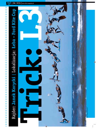 Trick: L3 foto: Łukasz Nazdraczew Rajder: Janek Korycki | Lokalizacja: Łeba – Ford Kite Cup | 16 | kite |www.h2o-magazyn.pl Zdaniem Janka trick jest prosty... oczywiście dla tych, którzy wykonują backrolla z kiteloopem. Po jego opanowaniu wystarczy zostawić sobie jeden lub dwa metry wysokości więcej, aby móc przełożyć bar za plecami. Aby wykonać poprawne L3, należy: 1 Wybić się mocno z krawędzi, nadać rotację do backrolla, podczas gdy latawiec robi kiteloopa. 2 3 W końcowej fazie backrolla należy mocno przyciągnąć do siebie bar, aby przyśpieszyć rotację oraz zwiększyć moc. W momencie gdy kite kończy rotację i znów zaczyna ciągnąć do góry, należy przechwycić bar drugą ręką. Podczas przechwycenia najważniejsze jest pewne złapanie odpowiedniej strony bara oraz wykonanie tego na tyle szybko i wcześnie, aby kite nie zaczął jeszcze zbytnio ciągnąć do góry. 4 Po przełożeniu bara wystarczy po prostu ładnie wylądować skok. LĄDOWANIA Kiteloopów z zasady są trudne, lecz po dobrym przełożeniu prawdopodobieństwo ustania skoku jest bardzo duże. Odpięte kiteloopy z backrollem i hp (L3) to jedne z moich ulubionych tricków, szczególnie gdy wieje równy wiatr. Powodzenia Janek Korycki