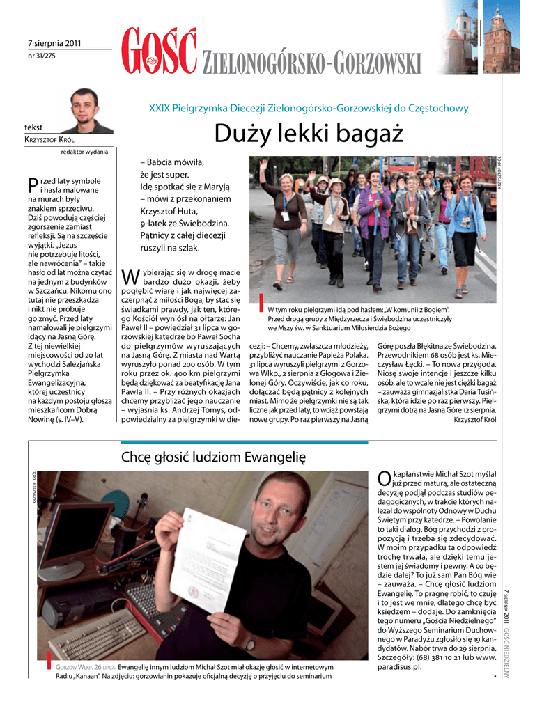 7 sierpnia 2011 nr 31/275 XXIX Pielgrzymka Diecezji Zielonogórsko-Gorzowskiej do Częstochowy redaktor wydania – Babcia mówiła, że jest super. Idę spotkać się z Maryją – mówi z przekonaniem Krzysztof Huta, 9-latek ze Świebodzina. Pątnicy z całej diecezji ruszyli na szlak. P rzed laty symbole i hasła malowane na murach były znakiem sprzeciwu. Dziś powodują częściej zgorszenie zamiast refleksji. Są na szczęście wyjątki. „Jezus nie potrzebuje litości, ale nawrócenia” – takie hasło od lat można czytać na jednym z budynków w Szczańcu. Nikomu ono tutaj nie przeszkadza i nikt nie próbuje go zmyć. Przed laty namalowali je pielgrzymi idący na Jasną Górę. Z tej niewielkiej miejscowości od 20 lat wychodzi Salezjańska Pielgrzymka Ewangelizacyjna, której uczestnicy na każdym postoju głoszą mieszkańcom Dobrą Nowinę (s. IV–V). Krzysztof Król Duży lekki bagaż tekst Krzysztof Król W ybierając się w drogę macie bardzo dużo okazji, żeby pogłębić wiarę i jak najwięcej zaczerpnąć z miłości Boga, by stać się świadkami prawdy, jak ten, którego Kościół wyniósł na ołtarze: Jan Paweł II – powiedział 31 lipca w gorzowskiej katedrze bp Paweł Socha do pielgrzymów wyruszających na Jasną Górę. Z miasta nad Wartą wyruszyło ponad 200 osób. W tym roku przez ok. 400 km pielgrzymi będą dziękować za beatyfikację Jana Pawła II. – Przy różnych okazjach chcemy przybliżać jego nauczanie – wyjaśnia ks. Andrzej Tomys, odpowiedzialny za pielgrzymki w die- W tym roku pielgrzymi idą pod hasłem: „W komunii z Bogiem”. Przed drogą grupy z Międzyrzecza i Świebodzina uczestniczyły we Mszy św. w Sanktuarium Miłosierdzia Bożego cezji: – Chcemy, zwłaszcza młodzieży, przybliżyć nauczanie Papieża Polaka. 31 lipca wyruszyli pielgrzymi z Gorzowa Wlkp., 2 sierpnia z Głogowa i Zielonej Góry. Oczywiście, jak co roku, dołączać będą pątnicy z kolejnych miast. Mimo że pielgrzymki nie są tak liczne jak przed laty, to wciąż powstają nowe grupy. Po raz pierwszy na Jasną Krzysztof Król Chcę głosić ludziom Ewangelię Krzysztof Król O kapłaństwie Michał Szot myślał już przed maturą, ale ostateczną decyzję podjął podczas studiów pedagogicznych, w trakcie których należał do wspólnoty Odnowy w Duchu Świętym przy katedrze. – Powołanie to taki dialog. Bóg przychodzi z propozycją i trzeba się zdecydować. W moim przypadku ta odpowiedź trochę trwała, ale dzięki temu jestem jej świadomy i pewny. A co będzie dalej? To już sam Pan Bóg wie – zauważa. – Chcę głosić ludziom Ewangelię. To pragnę robić, to czuję i to jest we mnie, dlatego chcę być księdzem – dodaje. Do zamknięcia tego numeru „Gościa Niedzielnego” do Wyższego Seminarium Duchownego w Paradyżu zgłosiło się 19 kandydatów. Nabór trwa do 29 sierpnia. Szczegóły: (68) 381 10 21 lub www. paradisus.pl. • 7 sierpnia 2011 Gość Niedzielny Gorzów Wlkp. 26 lipca. Ewangelię innym ludziom Michał Szot miał okazję głosić w internetowym Radiu „Kanaan”. Na zdjęciu: gorzowianin pokazuje oficjalną decyzję o przyjęciu do seminarium Górę poszła Błękitna ze Świebodzina. Przewodnikiem 68 osób jest ks. Mieczysław Łęcki. – To nowa przygoda. Niosę swoje intencje i jeszcze kilku osób, ale to wcale nie jest ciężki bagaż – zauważa gimnazjalistka Daria Tusińska, która idzie po raz pierwszy. Pielgrzymi dotrą na Jasną Górę 12 sierpnia. gość zielonogórsko-gorzowski gość zielonogórsko-gorzowski Sanktuarium to szkoła wiary. Tu się uczymy za przykładem św. Jakuba Apostoła być wierni Chrystusowi w Kościele świętym – mówił podczas homilii bp Socha Strażacy przez dwa dni usuwali gruz i zabezpieczali teren katastrofy ok. 2 km, po czym się wykoleił. – Po przyjeździe przeszukiwaliśmy pomieszczenia, ewakuowaliśmy 8 osób, które tam mieszkały i udzielaliśmy wspólnie z pogotowiem pierwszej pomocy – opowiada Tomasz Górniak, rzecznik Straży Pożarnej w Strzelcach Krajeńskich. Prokuratura postawiła zarzut nieumyślnego spowodowania wypadku trzem osobom w wieku od 17 do 19 lat. kg Mają wyremontowany ośrodek, wielofunkcyjne boiska, wykwalifikowaną kadrę wychowawców… a przede wszystkim pomysł na kolonie. Co roku wakacje spędza tu przeszło tysiąc dzieci. Mjr Szczepan Głuszczak Katarzyna Gauza ła Msza św., podczas której ks. prałat Ryszard Sztylpa – rektor Polskiej Misji Katolickiej na Kraje Beneluksu – odsłonił i poświęcił wmurowany kamień z kościoła św. Huberta w Belgii. Później odbył się piknik myśliwski, połączony m.in. z prezentacją zwyczajów łowieckich, konkursem gwary myśliwskiej, zabawą taneczną i grillem. kg Paweł Poświat pośmiertnie został mianowany do stopnia sierżanta A fganistan . W polskiej bazie Ghazni 31 lipca 2011 r. odbyła się ceremonia pożegnania śp. sierż. Pawła Poświata, który zginął trzy dni wcześniej podczas operacji w północnej części prowincji. 30 lipca żołnierze modlili się w intencji zmarłego kolegi. – Służba żołnierska to ofiara na ołtarzu ojczyzny. Dzisiaj na tym ołtarzu ofiarujemy służbę i życie śp. Pawła Poświata, który był przesiąknięty wiarą, Bogiem – mówił na początku liturgii ks. ppłk Jerzy Suchecki. St. szer. Paweł Poświat służbę wojskową rozpoczął w 2003 roku. Służył na stanowisku kierowcy w 17. Wielkopolskiej Brygadzie Zmechanizowanej. Miał 29 lat i był kawalerem. kk [email protected] Adres redakcji: 65-075 Zielona Góra pl. Powstańców Wielkopolskich 2 Telefon (68) 411 02 54 Redagują: ks. Witold Lesner – dyrektor oddziału, Magdalena Kozieł, Krzysztof Król P odobnie jak w innych ośrodkach wypoczynkowych chcemy, aby dzieci odpoczęły i ciekawie spędziły czas – wyjaśnia ks. Henryk Grządko, który wspiera duszpastersko ośrodek. Od 1998 roku prowadzi go Stowarzyszenie Pomocy Bliźniemu im. Brata Krystyna. Na koloni
