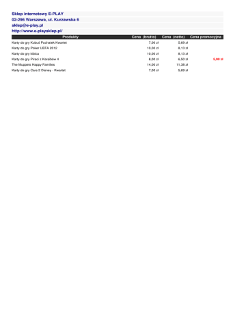 Sklep internetowy E-PLAY 02-296 Warszawa, ul. Kurzawska 6 [email protected] http://www.e-playsklep.pl/ Produkty Karty do gry Kubuś Puchatek Kwartet Cena (brutto) Cena (netto) 7,00 zł 5,69 zł Karty do gry Poker UEFA 2012 10,00 zł 8,13 zł Karty do gry kibica 10,00 zł 8,13 zł 8,00 zł 6,50 zł 14,00 zł 11,38 zł 7,00 zł 5,69 zł Karty do gry Piraci z Karaibów 4 The Muppets Happy Families Karty do gry Cars 2 Disney - Kwartet Cena promocyjna 5,00 zł