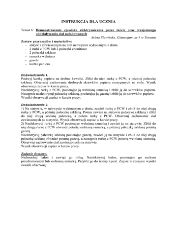 INSTRUKCJA DLA UCZNIA Temat 6: Demonstrowanie zjawiska elektryzowania przez tarcie oraz wzajemnego oddziaływania ciał naładowanych Arleta Sławińska, Gimnazjum nr 3 w Toruniu Zestaw przyrządów i materiałów: - statyw z zawieszonym na nim uchwytem wykonanym z drutu - 2 rurki z PCW lub 2 pałeczki ebonitowe - 2 pałeczki szklane - szmatka wełniana - gazeta - kartka papieru Doświadczenie 1. Podrzyj kartkę papieru na drobne kawałki. Zbliż do nich rurkę z PCW, a później pałeczkę szklaną. Obserwuj zachowanie drobnych skrawków papieru rozsypanych na stole. Wynik obserwacji zapisz w karcie pracy. Naelektryzuj rurkę z PCW, pocierając ją wełnianą szmatką i zbliż ją do skrawków papieru. Następnie naelektryzuj pałeczkę szklaną, pocierając ją gazetą i zbliż ją do skrawków papieru. Wyniki obserwacji zapisz w karcie pracy. Doświadczenie 2. 1) Na statywie, w uchwycie wykonanym z drutu, zawieś rurkę z PCW i zbliż do niej drugą rurkę z PCW, a później pałeczkę szklaną. Potem zawieś na statywie pałeczkę szklaną i zbliż do niej drugą szklaną pałeczkę, a potem rurkę z PCW. Obserwuj zachowanie ciał zawieszonych na statywie. Wynik obserwacji zapisz w karcie pracy. 2) Naelektryzuj rurkę z PCW pocierając wełnianą szmatką i zawieś ją na statywie. Zbliż do niej drugą rurkę z PCW również potartą wełnianą szmatką, a później pałeczkę szklaną potartą gazetą. Naelektryzuj pałeczkę szklaną pocierając gazetą, zawieś ją na statywie i zbliż do niej drugą pałeczkę szklaną również potartą gazetą, a następnie rurkę z PCW potartą wełnianą szmatką. Obserwuj zachowanie ciał zawieszonych na statywie. Wynik obserwacji zapisz w karcie pracy. Zadanie domowe: Nadmuchaj balon i zawiąż go nitką. Naelektryzuj balon, pocierając go suchym przedramieniem lub wełnianą szmatką. Przyłóż go do ściany i puść. Zapisz w zeszycie wyniki swoich obserwacji. KARTA PRACY 6. Demonstrowanie zjawiska elektryzowania oddziaływania ciał naładowanych przez tarcie oraz wzajemnego Doświadczenie 1. 1. Elektryzowanie ciał przez tarcie Opisz, jak zachowywały się drobne skrawki papieru podczas zbliżania do nich rurki z PCW i pałeczki szklanej przed i po ich potarciu. ………………………………………………………………………………………………….. ………………………………………………………………………………………………….. ………………………………………………………………………………………………….. ………………………………………………………………………………………………….. ………………………………………………………………………………………………….. ………………………………………………………………………………………………….. Zapisz wnioski wynikające z doświadczenia ………………………………………………………………………………………………….. ………………………………………………………………………………………………….. ………………………………………………………………………………………………….. ………………………………………………………………………………………………….. Doświadczenie 2. Wzajemne oddziaływanie ciał naładowanych 1) Opisz jak zachowywały się rurka z PCW i pałeczka szklana zawieszone na statywie podczas zbliżania do nich drugiej rurki z PCW i pałeczki szklanej. ………………………………………………………………………………………………….. ………………………………………………………………………………………………….. ………………………………………………………………………………………………….. ………………………………………………………………………………………………….. 2) Opisz jak zachowywały się naelektryzowane rurka z PCW i pałeczka szklana zawieszone na statywie podczas zbliżania do nich naelektryzowanej rurki z PCW i naelektryzowanej pałeczki szklanej. ………………………………………………………………………………………………….. ………………………………………………………………………………………………….. ………………………………………………………………………………………………….. ………………………………………………………………………………………………….. ………………………………………………………………………………………………….. ………………………………………………………………………………………………….. ………………………………………………………………………………………………….. ………………………………………………………………………………………………….. Zapisz wnioski wynikające z doświadczenia ………………………………………………………………………………………………….. ………………………………………………………………………………………………….. ………………………………………………………………………………………………….. ………………………………………………………………………………………………….. ………………………………………………………………………………………………….. ………………………………………………………………………………………………….. ……………………………………………