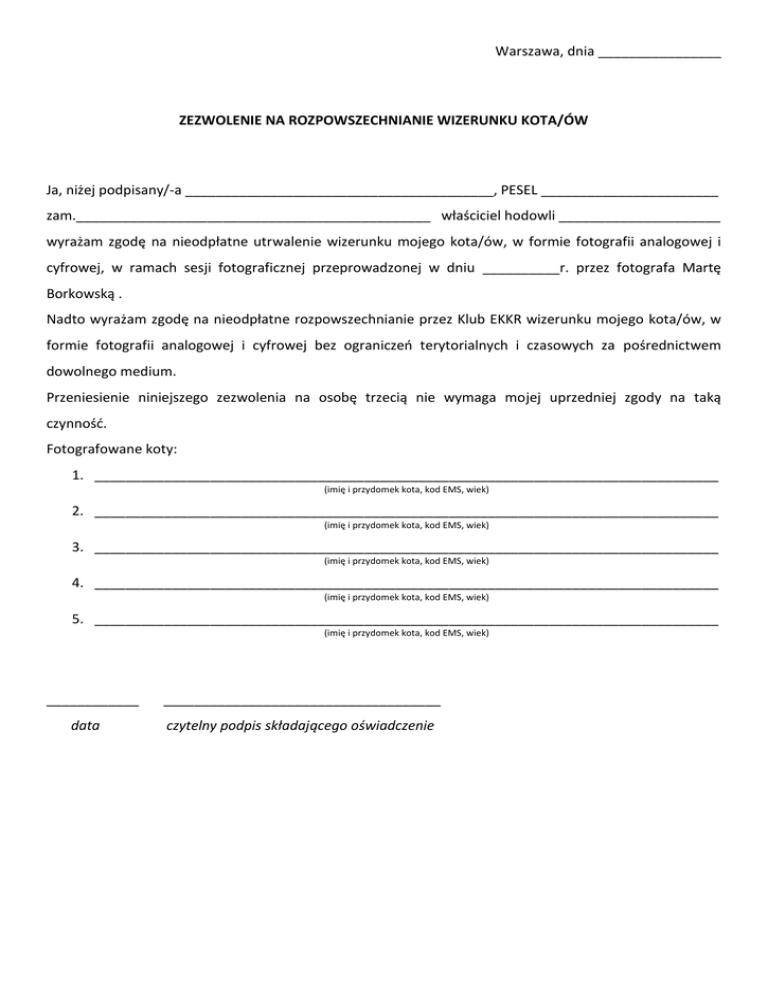 Warszawa, dnia ________________ ZEZWOLENIE NA ROZPOWSZECHNIANIE WIZERUNKU KOTA/ÓW Ja, niżej podpisany/-a ________________________________________, PESEL _______________________ zam.______________________________________________ właściciel hodowli _____________________ wyrażam zgodę na nieodpłatne utrwalenie wizerunku mojego kota/ów, w formie fotografii analogowej i cyfrowej, w ramach sesji fotograficznej przeprowadzonej w dniu __________r. przez fotografa Martę Borkowską . Nadto wyrażam zgodę na nieodpłatne rozpowszechnianie przez Klub EKKR wizerunku mojego kota/ów, w formie fotografii analogowej i cyfrowej bez ograniczeń terytorialnych i czasowych za pośrednictwem dowolnego medium. Przeniesienie niniejszego zezwolenia na osobę trzecią nie wymaga mojej uprzedniej zgody na taką czynność. Fotografowane koty: 1. _________________________________________________________________________________ (imię i przydomek kota, kod EMS, wiek) 2. _________________________________________________________________________________ (imię i przydomek kota, kod EMS, wiek) 3. _________________________________________________________________________________ (imię i przydomek kota, kod EMS, wiek) 4. _________________________________________________________________________________ (imię i przydomek kota, kod EMS, wiek) 5. _________________________________________________________________________________ (imię i przydomek kota, kod EMS, wiek) ____________ data ____________________________________ czytelny podpis składającego oświadczenie