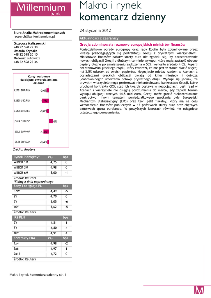 24 stycznia 2012 Biuro Analiz Makroekonomicznych [email protected] Aktualności z zagranicy Grzegorz Maliszewski +48 22 598 22 38 Urszula Kryńska +48 22 598 20 10 Mateusz Sutowicz +48 22 598 22 36 Grecja zdominowała rozmowy europejskich ministrów finansów Kursy walutowe dzisiejsze otwarcie/zmiana 0,0 0,0 0,0 0,0 dzienna 4,2781 EUR/PLN -0,6% 3,2850 USD/PLN -1,7% 3,5436 CHF/PLN -0,6% 1,3014 EUR/USD 0,0 1,0% 299,9 EUR/HUF -1,4% 25,35 EUR/CZK -0,4% Źródło: Reuters Rynek Pieniężny* (%) Bps WIBOR 1M 4,75 WIBOR 3M 4,98 0 WIBOR 6M 5,00 -1 Źródło: Reuters *Fixing z dnia poprzedniego Bony i obligacje PL 0 bps 52W 4,49 -5 2Y 4,70 0 5Y 5,05 -6 10Y 5,62 -5 Źródło: Reuters IRS PLN bps 2Y 4,81 1 5Y 4,80 4 10Y Kontrakty FRA 4,91 (%) 4 bps 1x4 4,98 -2 3x6 4,97 1 9x12 4,72 0 Źródło: Reuters Makro i rynek komentarz dzienny str. 1 Poniedziałkowe obrady eurogrupy oraz rady Ecofin były zdominowane przez kwestę przeciągających się pertraktacji Grecji z prywatnymi wierzycielami. Ministrowie finansów państw strefy euro nie zgodzili się, by oprocentowanie nowych obligacji Grecji o dłuższym terminie wykupu, które mają zastąpić obecne papiery dłużne po zmniejszeniu zadłużenia o 50%, wynosiło średnio 4,0%. Poparli oni stanowisko greckiego rządu, który twierdzi, że nie jest w stanie płacić więcej niż 3,5% odsetek od swoich papierów. Negocjacje między rządem w Atenach a posiadaczami greckich obligacji trwają od kilku miesięcy i dotyczą „dobrowolnego” umorzenia połowy prywatnego długu. Wydaje się jednak, że prywatni wierzyciele mogą preferować niekontrolowane bankructwo Grecji, które uruchomi kontrakty CDS, stąd ich twarda postawa w negocjacjach. Jeśli rząd w Atenach i wierzyciele nie osiągną porozumienia do marca, gdy zapada termin wykupu obligacji wartych 14,5 mld euro, Grecji może grozić niekontrolowane bankructwo. Innym tematem poniedziałkowego spotkania były Europejski Mechanizm Stabilizacyjny (EMS) oraz tzw. pakt fiskalny, który ma na celu wzmocnienie finansów publicznych w 17 państwach strefy euro oraz chętnych państwach spoza eurolandu. W powyższych kwestach również nie osiągnięto ostatecznego porozumienia. Notowania złotego Kursy USD/PLN i EUR/PLN /bid z zamknięcia/ 3,55 4,55 3,50 4,50 3,45 4,45 3,40 4,40 3,35 4,35 3,30 4,30 3,25 4,25 USDPLN / lewa skala / EURPLN 5 5,5 0 5,3 -5 5,1 4,9 -10 4,7 -15 4,5 -20 4,5 4,5 4,5 4,5 4,5 4,3 -25 4,25 4,25 4,25 4,25 -30 4,1 3,9 4 -35 3,7 -40 3,5 1X4 2X5 3X6 4X7 5X8 6X9 7X10 8X11 9X12 12X15 2012-01-24 2012-01-17 Current and past FRA rates Implied reference rate Obligacje krajowe rentowności i ich zmiana dzienna 0 6,0 0 -6 5,0 4,66 -5 5,62 -1 5,07 Poniedziałek przyniósł kontynuację nastrojów obserwowanych w minionym tygodniu, a wczorajsza sesja była szóstą z rzędu, która zakończyła się umocnieniem złotego w relacji do głównych walut. Podobnie jak podczas poprzednich sesji wsparciem dla złotego była stabilizacja sytuacji wewnątrz Eurolandu widoczna przede wszystkim we wzroście apetytu na ryzyko wyrażonym zwyżką notowań eurodolara oraz dalszą poprawą sytuacji na rynku europejskiego długu. Wczoraj na wartości zyskiwały także pozostałe waluty regionu CEE. Kalendarium dzisiejszej sesji to publikacja opisu z ostatniego posiedzenia RPP, która powinna potwierdzić jastrzębie nastawienie części członków Rady. W centrum uwagi będą informacje napływające ze spotkania europejskich ministrów finansów oraz publikacje wstępnych odczytów indeksów PMI. Utrzymanie dotychczasowego sentymentu inwestycyjnego powinno wspierać notowania złotego jednak w naszej ocenie potencjał aprecjacyjny złotego jest ograniczony, a skala ubiegłotygodniowej aprecjacji rodzi ryzyko korekty notowań. Tym bardziej, że sytuacja techniczna na wykresie pary EURPLN sugeruje możliwe odwrócenie dotychczasowego trendu. Zagranica - kurs EUR/USD Miniona sesja nie przyniosła przełomu w notowaniach eurodolara, który rósł kolejną sesję za sprawą pozytywnych informacji z Europy. Inwestorzy oczekiwali na informacje ze spotkania europejskich ministrów finansów, które poprzedza zaplanowany na przyszły poniedziałek szczyt przywódców państw UE. Dodatkowym wsparciem dla wspólnej waluty były wyniki aukcji bonów skarbowych Niemiec i Francji. Z kolei rentowność włoskich 10-latek spadła do najniższego poziomu od grudnia ubiegłego roku. W naszej ocenie w dalszym ciągu głównym czynnikiem ryzyka pozostaje brak postępu w negocjacjach pomiędzy Grecją, a prywatnymi pożyczkodawcami w sprawie warunków umorzenia części greckiego długu. Wypracowanie porozumienia jest niezbędne do wypłaty Atenom nowego planu pomocy finansowej. 4,0 -2 3,0 -3 2,0 -4 Nasze oczekiwania na dzisiaj Kurs Wsparcie/Opór Uzasadnienie 1,0 -5 EUR/PLN 4,24527/4,3267 Sentyment globalnego rynku, poziom awersji do ryzyka, -6 USD/PLN 3,2450/3,3315 Zmiany w notowaniach EURUSD, CHF/PLN 3,5012/3,5557 Zmiany w notowaniach EURCHF, EUR/USD 1,2873/1,3089 Poziom awersji do ryzyka, sentyment spotkanie ministrów finansów UE, 0,0 2Y 5Y 10Y zmiana dzienna w bp (pr awa oś) 2012- 01-24 500,0 460,0 420,0 380,0 5 sty 10 sty 13 sty rynku, Obligacje – Rynek krajowy Spready obligacji PLN vs. EUR 340,0 30 gru globalnego 19 sty 24 sty Wzrost apetytu na ryzyko sprzyjał wzrostowi wartości polskich obligacji wśród których najwyraźniej spadały rentowności papierów 5-letnich. Dochodowość tego segmentu obligacji zniżkowała podczas poniedziałkowej sesji o 6 bps i wyniosła 5,05% tj. najniższej od listopada ubiegłego roku. Z kolei po wczorajszym spadku rentowności o 5 bps najniżej od września 2011 roku znajduje się dochodowość obligacji z długiego końca krzywej. Potencjalnymi impulsami do zmian w wycenie krajowych papierów pozostaną informacje napływające z Europy kształtujące poziom awersji do ryzyka. Obligacje - Rynki bazowe 2Y 5Y 10Y Bundy i Treasuries rentowności i ich zmiana dzienna 10 3,6 0 3,1 2