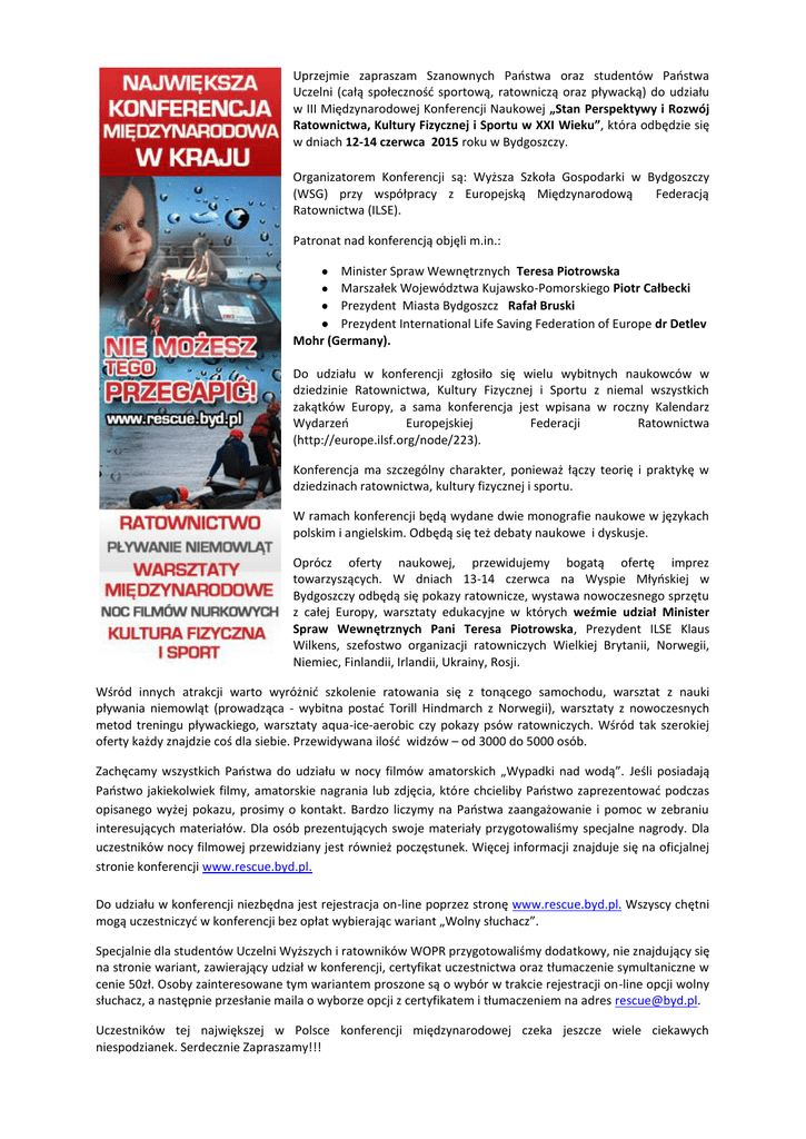 Uprzejmie zapraszam Szanownych Państwa oraz studentów Państwa Uczelni (całą społeczność sportową, ratowniczą oraz pływacką) do udziału w III Międzynarodowej Konferencji Naukowej „Stan Perspektywy i Rozwój Ratownictwa, Kultury Fizycznej i Sportu w XXI Wieku”, która odbędzie się w dniach 12-14 czerwca 2015 roku w Bydgoszczy. Organizatorem Konferencji są: Wyższa Szkoła Gospodarki w Bydgoszczy (WSG) przy współpracy z Europejską Międzynarodową Federacją Ratownictwa (ILSE). Patronat nad konferencją objęli m.in.: Minister Spraw Wewnętrznych Teresa Piotrowska Marszałek Województwa Kujawsko-Pomorskiego Piotr Całbecki Prezydent Miasta Bydgoszcz Rafał Bruski Prezydent International Life Saving Federation of Europe dr Detlev Mohr (Germany). Do udziału w konferencji zgłosiło się wielu wybitnych naukowców w dziedzinie Ratownictwa, Kultury Fizycznej i Sportu z niemal wszystkich zakątków Europy, a sama konferencja jest wpisana w roczny Kalendarz Wydarzeń Europejskiej Federacji Ratownictwa (http://europe.ilsf.org/node/223). Konferencja ma szczególny charakter, ponieważ łączy teorię i praktykę w dziedzinach ratownictwa, kultury fizycznej i sportu. W ramach konferencji będą wydane dwie monografie naukowe w językach polskim i angielskim. Odbędą się też debaty naukowe i dyskusje. Oprócz oferty naukowej, przewidujemy bogatą ofertę imprez towarzyszących. W dniach 13-14 czerwca na Wyspie Młyńskiej w Bydgoszczy odbędą się pokazy ratownicze, wystawa nowoczesnego sprzętu z całej Europy, warsztaty edukacyjne w których weźmie udział Minister Spraw Wewnętrznych Pani Teresa Piotrowska, Prezydent ILSE Klaus Wilkens, szefostwo organizacji ratowniczych Wielkiej Brytanii, Norwegii, Niemiec, Finlandii, Irlandii, Ukrainy, Rosji. Wśród innych atrakcji warto wyróżnić szkolenie ratowania się z tonącego samochodu, warsztat z nauki pływania niemowląt (prowadząca - wybitna postać Torill Hindmarch z Norwegii), warsztaty z nowoczesnych metod treningu pływackiego, warsztaty aqua-ice-aerobic czy pokazy psów ratowniczych. Wśród tak szerokiej oferty każdy znajdzie coś dla siebie. Przewidywana ilość widzów – od 3000 do 5000 osób. Zachęcamy wszystkich Państwa do udziału w nocy filmów amatorskich „Wypadki nad wodą”. Jeśli posiadają Państwo jakiekolwiek filmy, amatorskie nagrania lub zdjęcia, które chcieliby Państwo zaprezentować podczas opisanego wyżej pokazu, prosimy o kontakt. Bardzo liczymy na Państwa zaangażowanie i pomoc w zebraniu interesujących materiałów. Dla osób prezentujących swoje materiały przygotowaliśmy specjalne nagrody. Dla uczestników nocy filmowej przewidziany jest również poczęstunek. Więcej informacji znajduje się na oficjalnej stronie konferencji www.rescue.byd.pl. Do udziału w konferencji niezbędna jest rejestracja on-line poprzez stronę www.rescue.byd.pl. Wszyscy chętni mogą uczestniczyć w konferencji bez opłat wybierając wariant „Wolny słuchacz”. Specjalnie dla studentów Uczelni Wyższych i ratowników WOPR przygotowaliśmy dodatkowy, nie znajdujący się na stronie wariant, zawierający udział w konferencji, certyfikat uczestnictwa oraz tłumaczenie symultaniczne w cenie 50zł. Osoby zainteresowane tym wariantem proszone są o wybór w trakcie rejestracji on-line opcji wolny słuchacz, a następnie przesłanie maila o wyborze opcji z certyfikatem i tłumaczeniem na adres [email protected]. Uczestników tej największej w Polsce konferencji międzynarodowej czeka jeszcze wiele ciekawych niespodzianek. Serdecznie Zapraszamy!!!