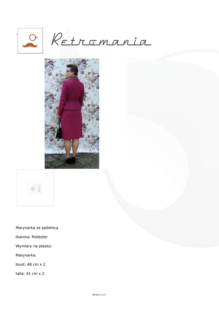 Marynarka ze spódnicą tkanina: Poliester Wymiary na płasko: Marynarka: biust: 48 cm x 2 talia: 41 cm x 2 Strona 1 z 2 biodra: 49 cm x 2 długość rękawa: 60 cm długość marynarki: 56 cm Spódnica: talia: 35 cm x 2 biodra: 49 cm x 2 długość: 65 cm Strona 2 z 2