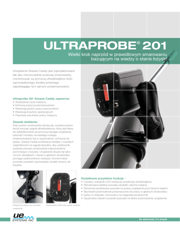 ULTRAPROBE 201 ® Wielki krok naprzód w prawidłowym smarowaniu bazującym na wiedzy o stanie łożysk! Urządzenie Grease Caddy jest zaprojektowane tak aby równocześnie podczas smarowania, monitorować za pomocą ultradźwięków ilość wprowadzonego środka smarnego zapobiegając tym samym przesmarowaniu Ultraprobe 201 Grease Caddy zapewnia: • Wydłużenie życia maszyny • Ochronę przed przesmarowaniem • Redukcję godzin pracy pracowników • Redukcję kosztów operacyjnych • Poprawę warunków pracy maszyny Zasada działania: Gdy poziom smarowania obniża się, wzrasta poziom tarcia tworząc sygnał ultradźwiekowy, który jest łatwy do zidetyfikowania za pomocą naszego urządzenia. Łatwość montażu na każdego rodzaju smarowniczkach lub w opcjonalnym uchwycie do paska. Grease Caddy przetwarza dźwięki z wysokich częstotliwości na sygnał słyszalny, aby użytkownik podczas procesu smarowania rozpoznawał te pochodzące z łożyska. Urządzenie skupia się tylko na tych dźwiękach i nawet w głośnym środowisku pomaga użytkownikowi wskazać moment kiedy powinien przestać wprowadzać środek smarny do łożyska. Dodatkowe przydatne funkcje : • Czytelny wzkaźnik LED wskazuje amplitudę ultradźwięków • Wbudowana latarka pozwala oświetlić ciemne miejsca • Obrotowa podstawka pozwala na pracę urządzenia pod różnymi kątami • Słuchawki przemysłowe przeznaczone do pracy w głośnym środowisku • Łatwy w obsłude, mocowany na magnesie przetwornik • Opcjonalny futerał na pasek pozwala na łatwe przenoszenie urządzenia Dołączony zestaw do montażu urządzenia Wyświetlacz LED oraz wybór czułości Specyfikacja urządzenia Ultraprobe 201 Grease Caddy Obudowa / Budowa Konstrukcja Wymiary Temperatura pracy Temperatura Względna Wilgotność układu Przetwornik Odpowiedź częstotliwościowa Wskaźnik Opcjonalna torba przenośna Mocowany bezpośrednio na smarowniczce daje wizualny i dźwiękowy sygnał dla prawidłowego smarowania Obudowa wykonana z aluminium 13.3 x 6.7 x 4.5 cm (LWH) (5.25" x 2.65" x 1.25") 0 °C to 60 °C (32 °F to 140 °F) 10-95% bez kondensacji w temp.do 30 °C (86 °F) Odbiornik SMD/Solid State Heterodyne piezoelektryczny mocowany na magnesie Odpowiedź szczytowa: około 38 kHz 10 segmentowy LED’owy wyświetlacz słupkowy (czerwony) Białe światło LED do oświetlenia smarowanego punktu 8 precyzyjnych pozycji tłumienia Akumulator niklowo-wodorkowe Wyłączenie po 5-ciu minutach LED Wybór czułości Zasilanie Wył.zasilania Wskaźnik niskiego poziomu baterii Słuchawki Izolujące hałas słuchawki do użycia z kaskiem Ponad 23 dB tłumienia hałasu Mocowanie Spełnia normy ANSI i standardy OSHA Uniwersalne : pasuje do większości smarowniczek dostępnych na rynku Waga 0.45 kg (16 oz) Gwarancja 1-rok na części 5-lat z odesłaną kartą gwarancyjną Built-in spotlight Ultraprobe® 201 Grease Caddy Nowatorskie urządzenie firmy UE Systems Ultraprobe® 201 Grease Caddy spowoduje, że bez problemu usłyszysz jak smar jest rozprowadzany w łożysku, a tym samym rozpoznasz kiedy należy zaprzestać smarowania. Posiadając Grease Caddy w swoim zakładzie możesz jedocześnie zapobiegać przesmarowaniu łożysk oraz kontrolować ich faktyczny stan, co spowoduje redukcję kosztów ponoszonych na środki smarne jak również wydłuży czas pracy maszyn! Futerał na pasek www.uesystems.pl Słuchawki do użycia z kaskiem UE Systems Europe • Windmolen 20 • 7609 NN Almelo • The Netherlands T: +31(0)546-725125 • F: +31(0)546-725126 • E: [email protected] • www.uesystems.eu ©UE Systems, Inc. Made in U.S.A. Ultraprobe 201 Grease Caddy: Covered by one or more of the following patents: 0151115; 0303776; 0315199; 1206586; 1297576; 1881263; 2562758; 2689339; 4416145; 4823600; 5955670; 6122966; 6339961; 6341518; 6415645; 6655214; 6707762; 6804992 UE Systems is committed to continual product improvement; therefore specifications are subject to change without notice. Warranty details are available by request.