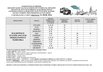 HARMONOGRAM ODBIORU ODPADÓW KOMUNALNYCH, SUROWCÓW WTÓRNYCH, ODPADÓW ZIELONYCH, ZUŻYTEGO SPRZĘTU ELEKTRONICZNEGO I ELEKTRYCZNEGO, GABARYTÓW, ZUŻYTYCH OPON, BATERII, AKUMULATORÓW, PRZETERMINOWANYCH LEKÓW I CHEMIKALIÓW Z GMINY PRZEMYŚL NA ROK 2016 MIEJSCOWOŚĆ MIESIĄC ODPADY KOMUNALNE ZMIESZANE co 2 tygodnie MALHOWICE STANISŁAWCZYK HERMANOWICE NEHRYBKA STYCZEŃ LUTY MARZEC KWIECIEŃ MAJ CZERWIEC LIPIEC SIERPIEŃ WRZESIEŃ PAŹDZIERNIK LISTOPAD GRUDZIEŃ 2, 15, 29 12, 26 11, 25 8, 22 6, 20 3, 17 1, 15, 29 12, 26 9, 23 7, 21 4, 18 2, 16, 30 SELEKTYWNA ZBIÓRKA ODPADÓW ODPADY ZIELONE ZUŻYTY SPRZĘT AGD I RTV, GABARYTY 15 12 11 8 6 3 15 12 9 7 4 16 20 17 29 26 23 21 - 20 18 - ! Worki do gromadzenia odpadów winny posiadać następujące kolory: 1 ) kolor niebieski - papier i tektura 2 ) kolor żółty - tworzywa sztuczne, metal i opakowania wielomateriałowe - łącznie 3 ) kolor zielony - szkło kolorowe i bezbarwne 4 ) kolor brązowy - odpady zielone 5) kolor czarny - odpady niesegregowane (mieszane) Z uwagi na dzień wolny: - tj. 01.01.16 r . wywóz odpadów komunalnych odbędzie się w dniu: 02.01.16 r. (I sobota) UWAGA ! 20.05.2016 r. - odbiór zużytego sprzętu elektrycznego i elektrycznego, gabarytów oraz odpadów powstałych w gospodarstwach domowych : (zużyte opony, przeterminowane leki i chemikalia, zużyte baterie, akumulatory itp. PROSIMY O OPISANIE POJEMNIKA NUMEREM POSESJI ORAZ POJEMNIKI I WORKI Z ODPADAMI WYSTAWIAĆ PRZED POSESJE DO GODZ. 7.00. Surowce wtórne gromadzone selektywnie ŻÓŁTY Tworzywa sztuczne, Metal Opak. wielomateriałowe NIEBIESKI Papier i Tektura WRZUCAMY: - gazety, książki, zeszyty, - katalogi, prospekty, foldery, - torby i worki papierowe, - pudełka kartonowe i tekturowe oraz tekturę NIE WRZUCAMY: - papieru i tektury pokrytych folią metalową i tworzywami sztucznymi (opakowań papierowych po napojach, mleku i środkach spożywczych), - pieluch jednorazowych, podpasek i papierów higienicznych, - worków po wapnie i cemencie oraz tapet, - kalki oraz zabrudzonego i tłustego papieru (np. z masła, smalcu itd.). WRZUCAMY: - opakowania po płynach i napojach (butelki PET, pojemniki po olejach spożywczych), - pojemniki po materiałach sypkich, folie budowlane, reklamówki i woreczki foliowe, - wiadra wolne od zanieczyszczeń, - puszki po napojach oraz po konserwach, - opakowania wielomateriałowe np. po napojach, sokach i mleku NIE WRZUCAMY: - opakowań po olejach silnikowych i chłodniczych, - opakowań po lekach i pojemników po wyrobach garmażeryjnych, - puszek po farbach, opakowań w aerozolach, zabawek, styropianu, - kalki i zabrudzonego i tłustego papieru (np. z masła, smalcu itd.) - sprzętu AGD. ZIELONY szkło bezbarwne i kolorowe WRZUCAMY: - opakowania ze szkła (butelki, buteleczki, pojemniki, słoiki) wolne od zanieczyszczeń, - stłuczkę opakowaniową wolną od zanieczyszczeń metalami i tworzywami, NIE WRZUCAMY: - szyb okiennych, szkła stołowego, fajansu, porcelany i ceramiki, - luster, żarówek, witraży, reflektorów, izolatorów, doniczek, szkła żaroodpornego, szkła okularowego, szyb samochodowych, - ekranów i lamp telewizyjnych PAMIĘTAJ! Nie tłucz szkła przed wyrzuceniem – wrzucaj tylko czyste opakowania BRĄZOWY Odpady zielone – biodegradowalne WRZUCAMY: - odpady pochodzące z pielęgnacji ogródków przydomowych, kwiatów domowych, balkonowych (części roślin), - odpady zielone z pielęgnacji zieleńców (skoszone trawy, liście, trociny drzewa), kora drzew, drobne i rozdrobnione gałęzie, NIE WRZUCAMY: - roślin porażonych chorobami grzybowymi, materiałów wcześniej konserwowanych chemicznie np. skórki pomarańczy, bananów i innych cytrusów, - odpadów zielonych zmieszanych z drewnem, plastikiem i szkłem PAMIĘTAJ! wrzucaj tylko czyste opakowania oraz zgnieć butelki i puszki ZUŻYTY SPRZĘT ELEKTRONICZNY I ELEKTRYCZNY WYSTAWIAMY PRZED POSESJĘ, W WYZNACZONY DZIEŃ ODBIORU MIĘDZY INNYMI: • komputery, drukarki • sprzęt AGD • sprzęt RTV • dyski twarde, klawiatury i myszki komputerowe • sprzęt telekomunikacyjny (np. telefony) • urządzenia chłodnicze • telewizory i monitory • akumulatory i baterie • świetlówki rurowe NIE PRZYJMUJEMY ZDEKOMPLETOWANEGO SPRZĘTU AGD i RTV GABARYTY WYSTAWIAMY PRZED POSESJĘ MIĘDZY INNYMI: meble meble tapicerowane (fotele, krzesła, wersalki itp.)