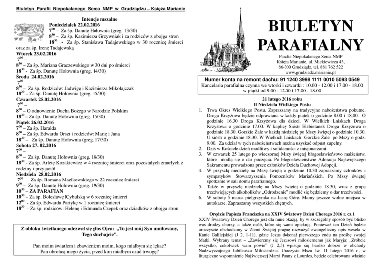 Biuletyn Parafii Niepokalanego Serca NMP w Grudziądzu – Księża Marianie Intencje mszalne Poniedziałek 22.02.2016 700 – Za śp. Danutę Hołownia (greg. 13/30) 830 – Za śp. Kazimierza Grzywniak i za rodziców z obojga stron 1830 - Za śp. Stanisława Tadajewskiego w 30 rocznicę śmierci oraz za śp. Irenę Tadajewską Wtorek 23.02.2016 700 – 830 – Za śp. Mariana Graczewskiego w 30 dni po śmierci 1830 - Za śp. Danutę Hołownia (greg. 14/30) Środa 24.02.2016 700 830 – Za śp. Rodziców: Jadwigę i Kazimierza Mikołajczak 1830 – Za śp. Danutę Hołownia (greg. 15/30) Czwartek 25.02.2016 700 – 830 – O odnowienie Ducha Bożego w Narodzie Polskim 1830 – Za śp. Danutę Hołownia (greg. 16/30) Piątek 26.02.2016 700 – Za śp. Haralda 830 – Za śp. Edwarda Orszt i rodziców: Marię i Jana 1830 – Za śp. Danutę Hołownia (greg. 17/30) Sobota 27. 02.2016 700 – 830 – Za śp. Danutę Hołownia (greg. 18/30) 1830 - Za śp. Arletę Kozakiewicz w 4 rocznicę śmierci oraz pozostałych zmarłych z rodziny i przyjaciół Niedziela 28.02.2016 730 – Za śp. Romana Mazikowskiego w 22 rocznicę śmierci 900 – Za śp. Danutę Hołownia (greg. 19/30) 1030 – ZA PARAFIAN 1030 – Za śp. Bolesławę |Cybulską w 6 rocznicę śmierci 1200 - Za śp. Edwarda Partykę w 1 rocznicę śmierci 1830 – Za śp. rodziców: Helenę i Edmunda Czepek oraz dziadków z obojga stron Z obłoku świetlanego odezwał się głos Ojca: „To jest mój Syn umiłowany, Tego słuchajcie”. Pan moim światłem i zbawieniem moim, kogo miałbym się lękać? Pan obrońcą mego życia, przed kim miałbym czuć trwogę? BIULETYN PARAFIALNY Parafia Niepokalanego Serca NMP Księża Marianie, ul. Mickiewicza 43, 86-300 Grudziądz, tel. 881 762 522 www.grudziadz.marianie.pl Numer konta na remont dachu: 91 1240 3998 1111 0010 5093 0549 Kancelaria parafialna czynna we wtorki i czwartki : 10.00 - 12.00 i 17.00 - 18.00 w piątki od 9.00 - 12.00 i 17.00 - 18.00 1. 2. 3. 4. 5. 6. 21 lutego 2016 roku II Niedziela Wielkiego Postu Trwa Okres Wielkiego Postu. Zapraszamy na tradycyjne nabożeństwa pokutne. Droga Krzyżowa będzie odprawiana w każdy piątek o godzinie 8.00 i 18.00. O godzinie 16.30 Droga Krzyżowa dla dzieci. W Wielkich Lniskach Droga Krzyżowa o godzinie 17.00. W kaplicy Sióstr Elżbietanek Droga Krzyżowa o godzinie 18.30. Gorzkie Żale w każdą niedzielę po Mszy świętej o godzinie 10.30. U sióstr o godzinie 18.30. W Wielkich Lniskach Gorzkie Żale po Mszy o godz. 9.00. Za udział w tych nabożeństwach można uzyskać odpust zupełny. Dziś w Kościele dzień modlitwy i solidarności z misjonarzami. W czwartek 25 lutego po wieczornej Mszy świętej błogosławieństwo małżeństw, które modlą się o dar poczęcia. Po błogosławieństwie Adoracja Najświętszego Sakramentu prowadzona przez członków Dzieła Duchowej Adopcji. W przyszłą niedzielę na Mszę świętą o godzinie 10.30 zapraszamy członków i sympatyków Stowarzyszenia Pomocników Mariańskich. Po Mszy świętej spotkanie w sali domu parafialnego. Także w przyszłą niedzielę na Mszy świętej o godzinie 18.30, wraz z grupą trzeźwiejących alkoholików „Odrodzenie” modlić się będziemy o dar trzeźwości. W sobotę 5 marca pielgrzymka na Jasną Górę. Mamy jeszcze wolne miejsca w autokarze. Zapraszamy wszystkich chętnych. Orędzie Papieża Franciszka na XXIV Światowy Dzień Chorego 2016 r. cz.1 XXIV Światowy Dzień Chorego jest dla mnie okazją, by w szczególny sposób być blisko was drodzy chorzy, a także osób, które się wami opiekują. Ponieważ ten Dzień będzie uroczyście obchodzony w Ziemi Świętej pragnę rozważyć ewangeliczny opis wesela w Kanie Galilejskiej (J 2, 1-11), gdzie Jezus dokonał pierwszego cudu na prośbę swojej Matki. Wybrany temat – „Zawierzmy się Jezusowi miłosiernemu jak Maryja: „Zróbcie wszystko, cokolwiek wam powie” (J 2,5) wpisuje się bardzo dobrze w obchody Nadzwyczajnego Jubileuszu Miłosierdzia. Uroczysta Msza św. 11 lutego 2016 r., w liturgiczne wspomnienie Najświętszej Maryi Panny z Lourdes, będzie celebrowana właśnie Biuletyn Parafii Niepokalanego Serca NMP w Grudziądzu – Księża Marianie Pro Christo et Ecclesia – Dla Chrystusa i Kościoła w Nazarecie, gdzie „Słowo stało się ciałem i zamieszkało wśród nas” (J 1, 14). W Nazarecie również, zgodnie z przekazem ewangelisty Łukasza, Jezus rozpoczął swoją zbawczą misję odnosząc do siebie słowa proroka Izajasza: „Duch Pański spoczywa na Mnie, ponieważ Mnie namaścił i posłał Mnie, abym ubogim niósł dobrą nowinę, więźniom głosił wolność, a niewidomym przejrzenie; abym uciśnionych odsyłał wolnymi, abym obwoływał rok łaski od Pana”. Choroba, zwłaszcza ciężka, zawsze wywołuje kryzys w ludzkiej egzystencji i niesie ze sobą głębokie pytania. W pierwszej chwili może niekiedy wywołać bunt: dlaczego mnie to spotkało? Może prowadzić do rozpaczy, do przekonania, że wszystko stracone, że nic już nie ma sensu...W tych sytuacjach wiara w Boga jest, z jednej strony, wystawiona na próbę, a jednocześnie ujawnia swą pozytywną moc. Nie dlatego, że dzięki wierze znika choroba czy ból, czy też pytania, jakie one rodzą, lecz dlatego, że daje ona klucz, który pozwala odkryć głęboki sens tego, co przeżywamy, pozwala nam zobaczyć, że choroba może być drogą do większej bliskości z Jezusem, który idzie u naszego boku, dźwigając krzyż. Ten klucz daje nam Maryja, Matka, która dobrze zna tę drogę. Na weselu w Kanie Galilejskiej Maryja jawi się jako kobieta zatroskana, która widzi ważny problem nowożeńców: skończyło się wino, symbol świątecznej radości. Dostrzega Ona trudność, traktuje ją jako swoją własną, w dyskretny sposób zaczyna natychmiast działać. Nie stoi i patrzy obojętnie, nie traci czasu na osądzanie, lecz zwraca się do Jezusa i przedstawia Mu problem: „Nie mają wina. A kiedy Jezus daje J