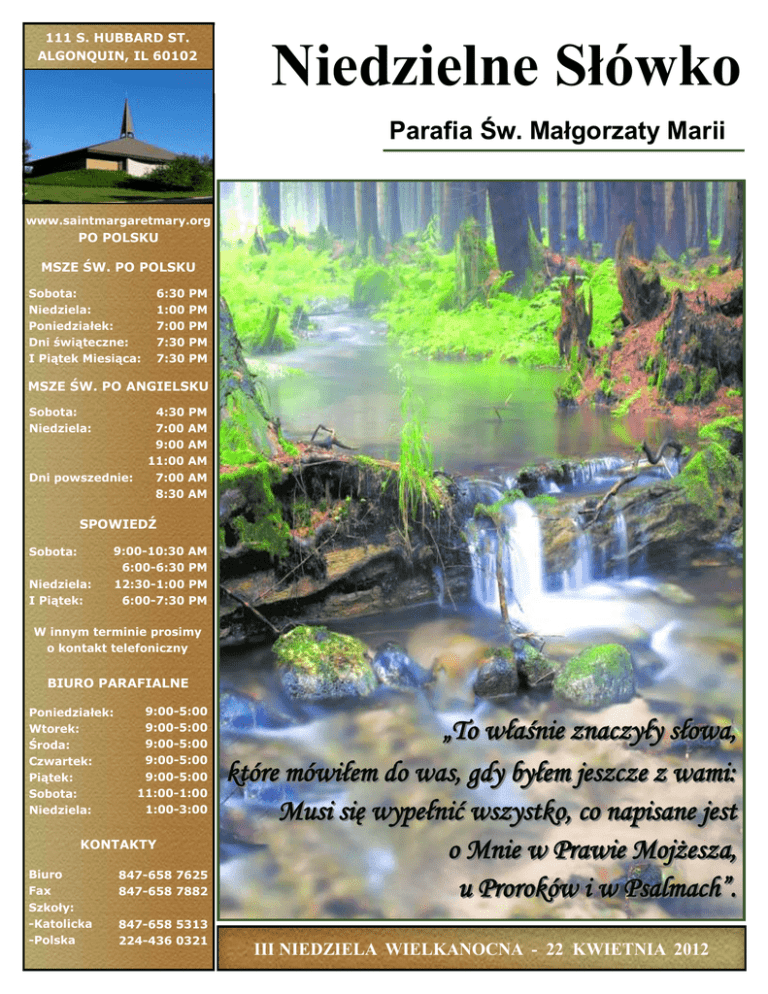 111 S. HUBBARD ST. ALGONQUIN, IL 60102 Niedzielne Słówko Parafia Św. Małgorzaty Marii www.saintmargaretmary.org PO POLSKU MSZE ŚW. PO POLSKU Sobota: Niedziela: Poniedziałek: Dni świąteczne: I Piątek Miesiąca: 6:30 1:00 7:00 7:30 7:30 PM PM PM PM PM MSZE ŚW. PO ANGIELSKU Sobota: Niedziela: Dni powszednie: 4:30 7:00 9:00 11:00 7:00 8:30 PM AM AM AM AM AM SPOWIEDŹ Sobota: Niedziela: I Piątek: 9:00-10:30 AM 6:00-6:30 PM 12:30-1:00 PM 6:00-7:30 PM W innym terminie prosimy o kontakt telefoniczny BIURO PARAFIALNE Poniedziałek: Wtorek: Środa: Czwartek: Piątek: Sobota: Niedziela: 9:00-5:00 9:00-5:00 9:00-5:00 9:00-5:00 9:00-5:00 11:00-1:00 1:00-3:00 KONTAKTY Biuro Fax Szkoły: -Katolicka -Polska 847-658 7625 847-658 7882 847-658 5313 224-436 0321 „To właśnie znaczyły słowa, które mówiłem do was, gdy byłem jeszcze z wami: Musi się wypełnić wszystko, co napisane jest o Mnie w Prawie Mojżesza, u Proroków i w Psalmach”. III NIEDZIELA WIELKANOCNA - 22 KWIETNIA 2012 Niedzielne Słówko Od Proboszcza “ Wy jesteście świadkami tego” Pod koniec Drugiej Wojny Światowej, bomba uderzyła w jeden z kościołów w Niemczech. Runęło sklepienie. W bocznym ołtarzu stała piękna marmurowa figura Serca Jezusowego. Pan Jezus miał wyciągnięte ręce z gestem zapraszającym: “ Przyjdźcie do mnie wszyscy”. W tę figurę uderzył odłamek muru ze sklepienia. Figura spadła i odłamały się ręce Chrystusa. Kiedy ludzie weszli do kościoła postawili ją na podłodze i widzieli Chrystusa bez rąk. Po skończonej wojnie odwiedzili ten kościół żołnierze alianccy. Jeden z nich , katolik, stał długo zamyślony przed tym Chrystusem bez rąk.Po chwili wyciągnął kawałek kartoniku z kieszeni i ołówkiem napisał na nim parę słów. Potem przywiązał kartonik do figurki. Przychodzili inni ludzie i z ciekawością czytali słowa napisane na kartoniku: “ Nie mam już odtąd żadnych innych rąk, tylko wasze”. Słowa napisane przez żołnierza na kartoniku, nie różnią się bardzo od słów z dzisiejszej Ewangelii skierowanych przez Jezusa do Apostołów: “Wy jesteście świadkami tego”. Chrystus ukazując się apostołom po swoim zmartwychwstaniu umacnia ich wiarę. Pozwala się im dotknąć, aby uwierzyli. Tłumaczy im, że właśnie wypełniła się Boża wola do końca. Jezus przygotowuje swoich uczniów, aby byli dobrymi świadkami, tego co widzieli i słyszeli. Zaproszenie do dawania świadectwa o swojej wierze jest skierowane również do nas. Chrystus myśli właśnie o Tobie i o mnie mówiąc: “ Wy jesteście świadkami tego”. Świadkami czego jesteśmy? Bożej miłości i dobroci dla nas. Świadkami Jego miłosierdzia i szczodrości. O tym, że Chrystus jest naszym Bogiem, że zmartwychwstał i żyje w naszych sercach, powinniśmy przede wszystkim świadczyć przykładem naszego życia. Chrystus wstąpił do Nieba i nie może już tak jak dawniej przemierzać ziemi palestyńskiej, nie może nauczać, uzdrawiać, okazywać miłosci i współczucia ludziom, którzy tego potrzebują. Ale możemy i powinniśmy czynić to my, Jego wyznawcy, Jego świadkowie. Dlatego każdy z nas powinien się starać być przedłużeniem Jezusa żyjącego współcześnie w naszych czasach i warunkach. Kiedy pracowałem w Bratysławie na Słowacji, zgłosił się do mnie lekarz, który był kiedyś niewierzący i poprosił, abym go przygotował na Chrzest. Kiedy go zapytałem jak odnalazł Boga, opowiedział mi o pacjentce śmiertelnie chorej na raka, którą się opiekował. Mimo świadomości, że umiera, kobieta ta była zawsze pogodna, spokojna i uśmiechnięta. Zapytał jej, co jest przyczyną takiej postawy. Wtedy ona wskazała na krzyż wiszący na ścianie i powiedziała: “ Chrystus, który umarł za mnie na krzyżu, pomaga mi pogodzić się z losem i znosić moje cierpienia.” Pełna wiary odpowiedź kobiety sprawiła, że ten niewierzący lekarz zaczął głęboko się nad tym zastanawiać i odnalazł swoją drogę do Boga. Słowa Ewangelii według Św. Łukasza 24, 35-48 Uczniowie opowiadali, co ich spotkało w drodze, i jak poznali Jezusa przy łamaniu chleba. A gdy rozmawiali o tym, On sam stanął pośród nich i rzekł do nich: „Pokój wam”. Zatrwożonym i wylękłym zdawało się, że widzą ducha. Lecz On rzekł do nich: „Czemu jesteście zmieszani i dlaczego wątpliwości budzą się w waszych sercach? Popatrzcie na moje ręce i nogi: to Ja jestem. Dotknijcie się Mnie i przekonajcie: duch nie ma ciała ani kości, jak widzicie, że Ja mam”. Przy tych słowach pokazał im swoje ręce i nogi. Lecz gdy oni z radości jeszcze nie wierzyli i pełni byli zdumienia, rzekł do nich: „Macie tu coś do jedzenia?” Oni podali Mu kawałek pieczonej ryby. Wziął i jadł wobec nich. Potem rzekł do nich: „To właśnie znaczyły słowa, które mówiłem do was, gdy byłem jeszcze z wami: Musi się wypełnić wszystko, co napisane jest o Mnie w Prawie Mojżesza, u Proroków i w Psalmach”. Wtedy Dziś wypada, abyśmy sobie zadali pytanie, czy jesteśmy oświecił ich umysł, aby rozumieli Pisma. świadkami Chrystusa? Czy nasza postawa pomaga innym zbliżać się do Boga? Czy nasze świadectwo chrześcijańskie jest czytelne? Niech naszym dziękczynieniem za Bożą miłość będzie aktywne świadectwo w każdym dniu naszego życia. I rzekł do nich: „Tak jest napisane: Mesjasz będzie cierpiał i trzeciego dnia zmartwychwstanie; w imię Jego głoszone będzie nawrócenie i odpuszczenie grzechów wszystkim narodom, począwszy od Jerozolimy. O. Piotr Sarnicki Wy jesteście świadkami tego”. Niedzielne Słówko Ogłoszenia Dzisiaj o 4:00 Pm w naszej parafii odbędzie się Uroczystość Bierzmowania. Polecamy naszą młodzież waszej modlitwie. W poniedziałek 23-go kwietnia Msza św. o godzinie 7:00 Pm i adoracja. Po adoracji spotkanie biblijne. Serdecznie zapraszamy . W niedzielę 29-go kwietnia po Mszy Św. o godzinie 1:00 Pm zapraszamy na Pysz