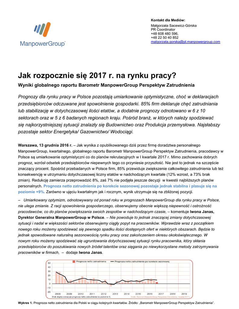 Kontakt dla Mediów: Małgorzata Sacewicz-Górska PR Coordinator +48 608 480 596, +48 22 50 40 852 [email protected] Jak rozpocznie się 2017 r. na rynku pracy? Wyniki globalnego raportu Barometr ManpowerGroup Perspektyw Zatrudnienia Prognozy dla rynku pracy w Polsce pozostają umiarkowanie optymistyczne, choć w deklaracjach przedsiębiorców odczuwane jest spowolnienie gospodarki. 85% firm deklaruje chęć zatrudniania lub stabilizację w dotychczasowej ilości etatów, a dodatnie prognozy odnotowano w 6 z 10 sektorach oraz w 5 z 6 badanych regionach kraju. Pośród branż, w których należy spodziewać się najkorzystniejszej sytuacji znalazły się Budownictwo oraz Produkcja przemysłowa. Najsłabszy pozostaje sektor Energetyka/ Gazownictwo/ Wodociągi. Warszawa, 13 grudnia 2016 r. – Jak wynika z opublikowanego dziś przez firmę doradztwa personalnego ManpowerGroup, kwartalnego, globalnego raportu Barometr ManpowerGroup Perspektyw Zatrudnienia, pracodawcy w Polsce są umiarkowanie optymistyczni co do planów rekrutacyjnych w I kwartale 2017 r. Mimo zachowania dobrych prognoz, wzrósł odsetek przedsiębiorców niepewnych tego co przyniesie przyszłość. Nie jest to jednak na szczęście znaczący procent. Spośród przebadanych w Polsce firm, 85% przewiduje zwiększenie całkowitego zatrudnienia lub też konsekwencję w utrzymaniu dotychczasowej liczny etatów w nadchodzącym kwartale (12% wzrost, a 73% brak zmian). Redukcję zamierza przeprowadzić 8%, zaś 7% nie podjęła jeszcze decyzji w kwestii najbliższych planów personalnych. Prognoza netto zatrudnienia po korekcie sezonowej pozostaje jednak stabilna i plasuje się na poziomie +9%. Zarówno w ujęciu kwartalnym jak i rocznym, wynik utrzymuje się na zbliżonej pozycji. – Umiarkowany optymizm, odnotowywany od ponad roku w prognozach ManpowerGroup dla rynku pracy w Polsce, nie ulega zmianie. Z racji spowolnienia gospodarczego, obserwujemy obecnie większą niepewność i ostrożność pracodawców, co do planów powiększania swoich zespołów w nadchodzącym czasie, – komentuje Iwona Janas, Dyrektor Generalna ManpowerGroup w Polsce. – Nie powoduje to jednak znaczącej zmiany dotychczasowej sytuacji i nadal w większości sektorów obserwujemy ciągły popyt na pracowników. Wprawdzie wraz z początkiem nowego roku możemy spodziewać się pewnego spadku ilości dostępnych ofert w niektórych obszarach. Będzie to jednak spowodowane naturalną sezonowością rynku pracy oraz zakończeniem okresu okołoświątecznego. W nowym roku możemy spodziewać się ugruntowania dotychczasowej sytuacji rynku pracownika, który skłania przedsiębiorców do poszukiwania nowych źródeł talentów oraz sięgania po niewykorzystane metody zatrzymywania pracowników w firmach, – dodaje Iwona Janas. Wykres 1. Prognoza netto zatrudnienia dla Polski w ciągu kolejnych kwartałów. Źródło: „Barometr ManpowerGroup Perspektyw Zatrudnienia”. 1 W sześciu z 10 badanych sektorach kraju prognoza netto zatrudnienia dla I kwartału 2017 r. jest dodatnia. Najwyższe noty uzyskano dla Budownictwa oraz Produkcji przemysłowej, dla których wyniki wyniosły odpowiednio +24% i +20%. Optymizm odnotowywany jest też dla branż Transport/Logistyka/Komunikacja, Restauracje/Hotele, +12% dla obu, Rolnictwo/Leśnictwo/Rybołówstwo, +10%, a także Handel detaliczny i hurtowy, +9%. Najniższe prognozy uzyskano dla sektorów Energetyka/Gazownictwo/Wodociągi oraz Finanse/Ubezpieczenia/Nieruchomości/Usługi, odpowiednio -7% i -4%. Wyniki dla obszarów Kopalnie/Przemysł wydobywczy i Instytucje sektora publicznego również wskazują na nieprzychylne warunki do szukania pracy, odpowiednio 0% i -1% Wykres 2. Prognoza netto zatrudnienia dla sektorów w Polsce na Q1 2017 r. Źródło: „Barometr ManpowerGroup Perspektyw Zatrudnienia”. – Stabilna i korzystna sytuacja na rynku pracy sprzyja powstawaniu nowych etatów, podwyższaniu stawek wynagrodzeń oraz rozwojowi świadczeń pozapłacowych. To zdecydowanie wpływa na pracowników, którzy są coraz bardziej otwarci na zmianę pracy. O ile jednak przedsiębiorcy coraz częściej starają się rozwijać narzędzia przyciągania nowych talentów, o tyle wciąż obszarem do rozwoju pozostaje motywacja i budowanie lojalności dotychczasowych pracowników. Dla kandydata w Polsce nadal najczęstszym i najprostszym sposobem zwiększenia otrzymywanego wynagrodzenia jest zmiana dotychczasowego miejsca pracy. To trend, któremu warto przeciwdziałać, zarówno dla korzyści przedsiębiorców, jak i ich zespołów, wprowadzając istotne zmiany w dotychczasowej polityce personalnej wielu przedsiębiorstw, – komentuje Iwona Janas. W ujęciu kwartalnym w sześciu z 10 badanych sektorach nastąpiło pogorszenie prognoz. Największe spadki odnotowano dla Instytucji sektora publicznego, o 11 punktów procentowych. W sektorze Finanse/ Ubezpieczenia/ Nieruchomości/ Usługi uzyskano umiarkowane osłabienie prognozy, o 5 punktów procentowych. W przypadku sektorów Transport/ Logistyka/ Komunikacja, Handel detaliczny i hurtowy, Kopalnie/ Przemysł wydobywczy, Energetyka/ Gazownictwo/ Wodociągi odnotowano nieznaczne pogorszenie wyników, o 2 lub 1 punkt procentowy. Polepszenie prognoz nastąpiło w przypadku czterech branż. Największe uzyskano dla Budownictwa, o 9 punktów procentowych. Umiarkowany wzrost zaobserwowano w sektorach Rolnictwo/ Leśnictwo/ Rybołówstwo oraz Restauracje/ Hotele, odpowiednio o 6 i o 4 punkty procentowe. W przypadku Produkcji przemysłowej wynik pozostaje na zbliżonej pozycji. W porównaniu z I kwartałem 2016 r. poprawa prognoz nastąpiła w pięciu z 10 badanych sektorach, a pogorszenie również w pięciu. Największe wzrosty odnotowano dla Budownictwa, Restauracji/Hoteli oraz Transportu/ Logistyki/ Komunikacji, odpowiednio o 7, o 6 i o 5 punktów procentowych. W przypadku sektorów Rolnictwo/ Leśnictwo/ Rybołówstwo, Produkcja Przemysłowa, a także Kopalnie/ Przemysł wydoby
