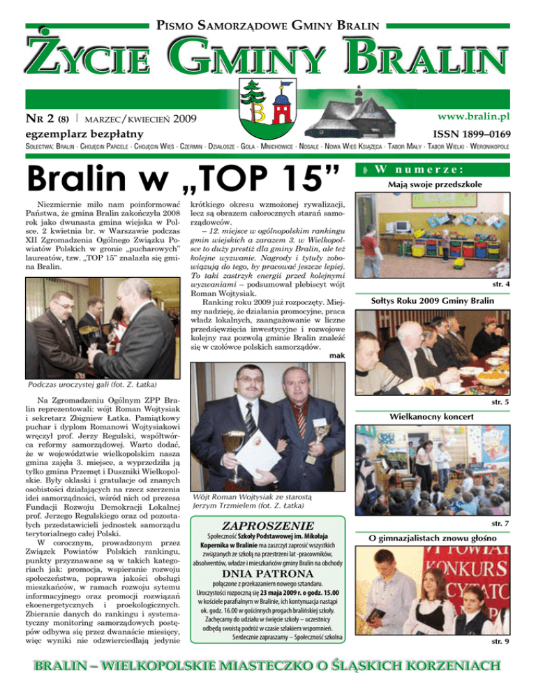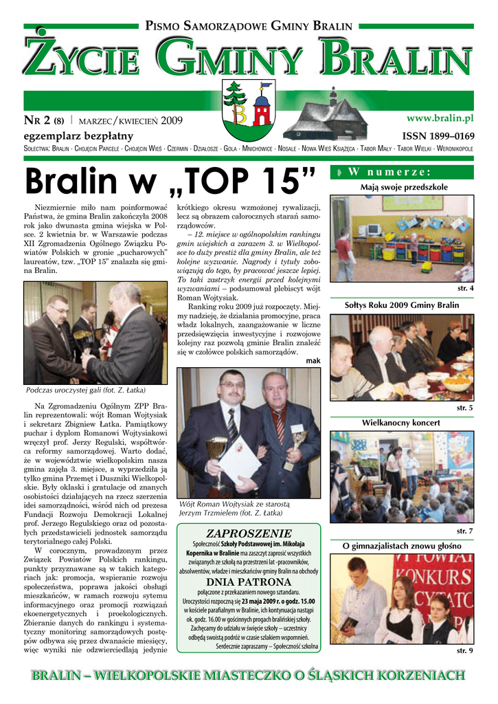 PiSmO SAMORZĄDOWe gminy bralin życie gminy bralin www.bralin.pl nr 2 (8) | MARZEC/KWIECIEŃ 2009 egzemplarz bezpłatny ISSN 1899–0169 SOŁECTWA: BRALIN • CHOJĘCIN PARCELE • CHOJĘCIN WIEŚ • CZERMIN • DZIAŁOSZE • GOLA • MNICHOWICE • NOSALE • NOWA WIEŚ KSIĄŻĘCA • TABOR MAŁY • TABOR WIELKI • WERONIKOPOLE Bralin w „TOP 15” Niezmiernie miło nam poinformować Państwa, że gmina Bralin zakończyła 2008 rok jako dwunasta gmina wiejska w Polsce. 2 kwietnia br. w Warszawie podczas XII Zgromadzenia Ogólnego Związku Powiatów Polskich w gronie „pucharowych” laureatów, tzw. „TOP 15” znalazła się gmina Bralin. krótkiego okresu wzmożonej rywalizacji, lecz są obrazem całorocznych starań samorządowców. – 12. miejsce w ogólnopolskim rankingu gmin wiejskich a zarazem 3. w Wielkopolsce to duży prestiż dla gminy Bralin, ale też kolejne wyzwanie. Nagrody i tytuły zobowiązują do tego, by pracować jeszcze lepiej. To taki zastrzyk energii przed kolejnymi wyzwaniami – podsumował plebiscyt wójt Roman Wojtysiak. Ranking roku 2009 już rozpoczęty. Miejmy nadzieję, że działania promocyjne, praca władz lokalnych, zaangażowanie w liczne przedsięwzięcia inwestycyjne i rozwojowe kolejny raz pozwolą gminie Bralin znaleźć się w czołówce polskich samorządów. mak W numerze: Mają swoje przedszkole str. 4 Sołtys Roku 2009 Gminy Bralin Podczas uroczystej gali (fot. Z. Łatka) Na Zgromadzeniu Ogólnym ZPP Bralin reprezentowali: wójt Roman Wojtysiak i sekretarz Zbigniew Łatka. Pamiątkowy puchar i dyplom Romanowi Wojtysiakowi wręczył prof. Jerzy Regulski, współtwórca reformy samorządowej. Warto dodać, że w województwie wielkopolskim nasza gmina zajęła 3. miejsce, a wyprzedziła ją tylko gmina Przemęt i Duszniki Wielkopolskie. Były oklaski i gratulacje od znanych osobistości działających na rzecz szerzenia idei samorządności, wśród nich od prezesa Fundacji Rozwoju Demokracji Lokalnej prof. Jerzego Regulskiego oraz od pozostałych przedstawicieli jednostek samorządu terytorialnego całej Polski. W corocznym, prowadzonym przez Związek Powiatów Polskich rankingu, punkty przyznawane są w takich kategoriach jak: promocja, wspieranie rozwoju społeczeństwa, poprawa jakości obsługi mieszkańców, w ramach rozwoju sytemu informacyjnego oraz promocji rozwiązań ekoenergetycznych i proekologicznych. Zbieranie danych do rankingu i systematyczny monitoring samorządowych postępów odbywa się przez dwanaście miesięcy, więc wyniki nie odzwierciedlają jedynie str. 5 Wielkanocny koncert Wójt Roman Wojtysiak ze starostą Jerzym Trzmielem (fot. Z. Łatka) ZAPROSZENIE Społeczność Szkoły Podstawowej im. Mikołaja Kopernika w Bralinie ma zaszczyt zaprosić wszystkich związanych ze szkołą na przestrzeni lat -pracowników, absolwentów, władze i mieszkańców gminy Bralin na obchody str. 7 O gimnazjalistach znowu głośno DNIA PATRONA połączone z przekazaniem nowego sztandaru. Uroczystości rozpoczną się 23 maja 2009 r. o godz. 15.00 w kościele parafialnym w Bralinie, ich kontynuacja nastąpi ok. godz. 16.00 w gościnnych progach bralińskiej szkoły. Zachęcamy do udziału w święcie szkoły – uczestnicy odbędą swoistą podróż w czasie szlakiem wspomnień. Serdecznie zapraszamy – Społeczność szkolna str. 9 BRALIN – WIELKOPOLSKIE MIASTECZKO O ŚLĄSKICH KORZENIACH Z życia urzędu 2 Wywiady z radnymi W „Życiu Gminy Bralin” inicjujemy cykl pt. „Wywiad z radnym”. W każdym numerze zaprezentujemy naszym Czytelnikom rozmowę z trzema losowo wybranymi radnymi. Rozpoczynamy od wywiadu z Przewodniczącym Rady Gminy Bralin Markiem Frasem oraz jego zastępcą Stanisławem Balcerzakiem. Może nasi Czytelnicy chcieliby na łamach „Życia Gminy Bralin” zadać pytanie swojemu radnemu? Czekamy na Państwa konstruktywne pytania i zachęcamy do współtworzenia naszej gazety. CENIĘ DZIAŁALNOŚĆ SPOŁECZNĄ Wywiad z Markiem Frasem, Przewodniczącym Rady Gminy w Bralinie, radnym z Nowej Wsi Książęcej Marek Fras pracuje w Komisji Rolnictwa oraz Komisji Przestrzegania Prawa, Ładu i Porządku Publicznego. Funkcję radnego pełni od 14 lat, zaś od 2 lat jest Przewodniczącym Rady Gminy Bralin. Co uważa Pan za swój sukces? Co udało się Panu zrobić w trakcie trwającej kadencji Rady Gminy? Sukcesem i ogromną satysfakcją było w poprzedniej kadencji Rady Gminy oddanie do użytku sali gimnastycznej, której budowa trwała 13 lat. Z pomocą drugiego radnego z Nowej Wsi Książęcej udało się nam doprowadzić tę inwestycję do końca. Dziś obiekt jest wykorzystywany nie tylko podczas zajęć wychowania fizycznego, pełni swoją rolę i sprawdza się tak jak myślałem. Do sukcesów w obecnej kadencji zaliczyłbym: zakup nowego samochodu pożarniczego marki Star Man, samochodu do przewozu osób marki VW, zbudowanie nowego chodnika w Nowej Wsi Książęcej na odcinku 200 m, plac zabaw usytuowany w okolicy Zespołu Szkół i w najbliższych dniach placu zabaw w Nowej Wsi KsiążęcejParcelach, wybudowanie drogi asfaltowej Parcele–Nowa Wieś Książęca z dojazdem do wszystkich budynków na tym odcinku, remont Domu Kultury. Wszystkie moje plany i zamierzenia, które udało się osiągnąć, to również zasługa i pomoc miejscowej Rady Sołeckiej i braci strażackiej i mieszkańców Nowej Wsi Książęcej. Jestem społecznikiem i cenię sobie bardzo wszelaką działalność społeczną. Wiem, że na wsiach można i trzeba jeszcze wiele zrobić. Jednak strasznie denerwuję się, jak słyszę, że mieszkańcy tylko wymagają, a od siebie nic nie proponują. W najbliższych planach inwestycyjnych naszej wioski jest budowa kanalizacji sanitarnej i to zadanie uważam za priorytet mojej działalności jako radnego z Nowej Wsi Książęcej tej kadencji. Co uważa Pan za swoją porażkę w pracy Rady? Uważam, że porażek nie było i życzyłbym sobie, aby ich nie było. Jak ocenia Pan współpracę w R