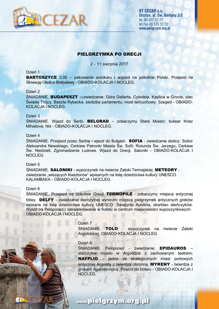 PIELGRZYMKA PO GRECJI 2 - 11 sierpnia 2017 Dzień 1 BARTOSZYCE 3.00 – pakowanie autokaru i wyjazd na południe Polski. Przejazd na Słowację Okolice Bratysławy - OBIADO-KOLACJA I NOCLEG. Dzień 2 ŚNIADANIE. BUDAPESZT zwiedzanie: Góra Gellerta, Cytadela, Kaplica w Grocie, plac Świętej Trójcy, Baszta Rybacka, siedziba parlamentu, most łańcuchowy. Szeged - OBIADOKOLACJA i NOCLEG. Dzień 3 ŚNIADANIE. Wjazd do Serbi. BELGRAD – zobaczymy Stare Miasto: bulwar Knez Mihailova. Niś - OBIADO-KOLACJA I NOCLEG. Dzień 4 ŚNIADANIE. Przejazd przez Serbię i wjazd do Bułgarii. SOFIA - zwiedzanie stolicy: Sobor Aleksandra Newskiego, Cerkiew Patronki Miasta Św. Sofii, Rotunda Św. Jerzego, Cerkiew Św. Niedzieli, Zgromadzenie Ludowe. Wjazd do Grecji. Saloniki - OBIADO-KOLACJA I NOCLEG. Dzień 5 ŚNIADANIE. SALONIKI - wypoczynek na riwierze Zatoki Termajskiej. METEORY zwiedzanie „wiszących klasztorów” wpisanych na listę dziedzictwa kultury UNESCO. KALAMBAKA - OBIADO-KOLACJA I NOCLEG. Dzień 6 ŚNIADANIE. Przejazd na południe Grecji TERMOPILE - zobaczymy miejsca antycznej bitwy. DELFY - zwiedzanie starożytnej wyroczni miejsca pielgrzymek antycznych greków wpisane na listę dziedzictwa kultury UNESCO: Świątynia Apollina, skarbiec ateńczyków. Wjazd na Peloponez i zakwaterowanie w hotelu w centrum miejscowości wypoczynkowych. OBIADO-KOLACJA I NOCLEG. Dzień 7 ŚNIADANIE. TOLO - wypoczynek na Argolidzkiej. OBIADO-KOLACJA I NOCLEG. riwierze Zatoki Dzień 8 ŚNIADANIE. Peloponez - zwiedzanie: EPIDAUROS – starożytne miasto w Argolidzie z zachowanym teatrem; NAFPLIO – jedno ze strategicznych miast portowych antycznej Argolidy z twierdzą obronną, MYKENY - twierdza z grobem Agamemnona. Powrót do hotelu - OBIADO-KOLACJA I NOCLEG. Dzień 9 ŚNIADANIE. TOLO - wypoczynek na riwierze Zatoki Argolidzkiej. KORYNT – miejsce pobytu Św. Pawła, Kanał Koryncki. KORYNT – miejsce pobytu Św. Pawła, Kanał Koryncki. Powrót do hotelu - OBIADO-KOLACJA I NOCLEG. Dzień 10 ŚNIADANIE. ATENY - zwiedzanie: Pałac Prezydencki, Parlament, Stadion Olimpijski, park, słupy Świątyni Zeusa, Łuk Hadriana, Teatr Dionizosa, Akropol, starożytna Agora – miejsce „wykładów” św. Pawła, Place Omonia i Syntagma. Przyjazd na terminal lotniska i o godz. 17.00 wylot do Polski. Warszawa - Modlin 18.45 przylot na lotnisko i przejazd autokarem do BARTOSZYC. 23.30 -zakończenie pielgrzymki. Cena: 2580 zł ŚWIADCZENIA w cenie autobus turystyczny - posiadający: klimatyzację, DVD/CD, ekspres do kawy, WC samolot – na trasie: Ateny - Warszawa noclegi – w hotelach **/*** i pokojach 2-3 osobowych z łazienką: wyżywienie - 9 śniadań kontynentalnych i 9 obiado-kolacji. ubezpieczenie - osób od nieszczęśliwych wypadków i leczenia za granicą NW AXA; obsługa - pilota, księdza duszpasterza, przewodniczki w Grecji. Podatek VAT oraz opłata na Turystyczny Fundusz Gwarancyjny Cena nie zawiera OPŁAT ORGANIZACYJNYCH. W koszt uczestnictwa nie są wliczone opłaty przejazdowe, podatki pobytowe oraz opłaty za przewodników miejscowych. Obowiązkowo: 150 euro. BILETÓW WSTĘPU do zwiedzanych obiektów, dla chętnych ok. 50 euro OPŁAT ZA BAGAŻ lotniczy w przypadku przekroczenia standardów ustalonych przez przewoźnika. POKÓJ JEDNOOSOBOWY dla zainteresowanych za dopłatą – 590 zł. INFORMACJE DODATKOWE MODLITWA. Czas Mszy świętej oraz innych praktyk duchowych nie został ujęty w programie, ponieważ jest uzależniony od szczegółowego przebiegu każdego dnia i będzie podawany na bieżąco. KOSZT PIELGRZYMKI planowany jest dla grupy 40 osobowej. W przypadku mniejszej ilości osób może być przedstawiona oferta zmodyfikowana. BAGAŻ każdego uczestnika ze względu na przelot samolotem musi spełniać standardy wymiarów i wagi ustalone przez konkretnego przewoźnika. W przypadku przekroczenia tych standardów obowiązują opłaty za przewóz bagażu. Więcej informacji na stronie internetowej w zakładce: Dla Pielgrzymów – bagaż lotniczy / wersja A