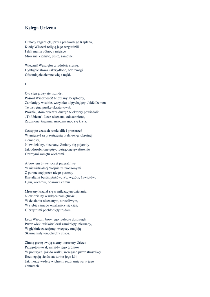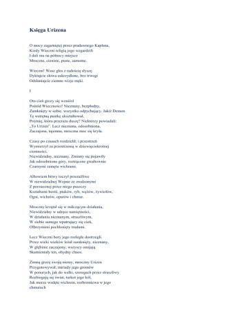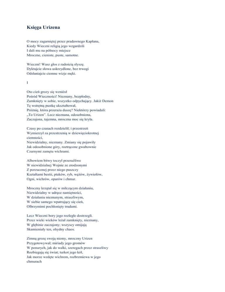 Księga Urizena O mocy zagarniętej przez pradawnego Kapłana, Kiedy Wieczni religią jego wzgardzili I dali mu na północy miejsce Mroczne, cieniste, puste, samotne. Wieczni! Wasz głos z radością słyszę. Dyktujcie słowa uskrzydlone, bez trwogi Odsłaniajcie ciemne wizje męki. I Oto cień grozy się wzniósł Pośród Wieczności! Nieznany, bezpłodny, Zamknięty w sobie, wszystko odpychający. Jakiż Demon Tę wstrętną pustkę ukształtował, Próżnię, która przeraża duszę? Niektórzy powiadali: „To Urizen”. Lecz nieznana, odosobniona, Zaczajona, tajemna, mroczna moc się kryła. Czasy po czasach rozdzielił; i przestrzeń Wymierzył za przestrzenią w dziewięciokrotnej ciemności, Niewidzialny, nieznany. Zmiany się pojawiły Jak odosobnione góry, roztrącone gwałtownie Czarnymi zamętu wichrami. Albowiem bitwy toczył przeraźliwe W niewidzialnej Wojnie ze zrodzonymi Z porzuconej przez niego puszczy Kształtami bestii, ptaków, ryb, wężów, żywiołów, Ogni, wichrów, oparów i chmur. Mroczny krzątał się w milczącym działaniu, Niewidzialny w udręce namiętności, W działaniu nieznanym, straszliwym, W siebie samego wpatrujący się cień, Olbrzymimi pochłonięty trudami. Lecz Wieczni bory jego rozległe dostrzegli. Przez wieki wieków leżał zamknięty, nieznany, W głębinie zaczajony; wszyscy omijają Skamieniały ten, ohydny chaos. Zimną grozę swoją niemy, mroczny Urizen Przygotowywał; miriady jego gromów W ponurych, jak do walki, szeregach przez straszliwy Rozbiegają się świat; turkot jego kół, Jak morze wzdęte wichrem, rozbrzmiewa w jego chmurach I na jego wzgórzach przygniecionych zwałami śniegu, Na mroźnych, chłostanych gradem górach; krzyk zgrozy Nieraz daje się słyszeć, podobny gromom jesiennym, Ilekroć się chmura nad żniwami rozżarzy. II Ziemi nie było ani kul przyciągania. Wola Nieśmiertelnego rozprzestrzeniała Albo ścieśniała wszystkie jego giętkie zmysły. Śmierci nie było; wieczne krzewiło się życie. Głos trąby niebiosa przebudził; I szeroko rozpostarte chmury krwi Toczyły się wokół skał Urizena zamglonych. Takie nosił imię ten samotny w Bezmiarze. Ostry trąby dźwięk. I oto miriady z Wieczności Stają w ordynku nad szarymi pustyniami Pełnymi teraz chmur, ciemności, fair Które mozolnie, krętymi drogami się toczyły. I słowa wypowiedział wyraźne, a huczały Jak grom nad wierzchołkami jego gór: „Z głębi mrocznej samotności, z wiecznego Gniazda w łonie mej świętości, Ukryty, odosobniony pośród zamysłów surowych, Przeznaczony dla dni przyszłości, Szukałem radości bez bólu, Trwałości bez rozchwiania. Dlaczego umrzeć chcecie, Wieczni? Czemu w nie gasnącym żyjecie palenisku? Najpierw z ogniem się zmagałem — i w głębię Wtłoczyłem go, w świat wewnętrzny, Pustkę bezmierną, dziką, ciemną, bezdenną, Gdzie niczego nie było, Natury rozległe łono. I wsparty na samym sobie, nad próżnią rozpostarty Ja jeden, właśnie ja! wichry bezlitosne Spętałem; lecz gęstniejąc w kaskady Spadają nieustannie. Silny, odepchnąłem Fale szerokie — i powstał nad wodami Swiat mocnego utwierdzenia. Ja tu samotny w księgach wykutych z metalu Zapisałem tajemnice mądrości, Walkami, zmaganiami Tajemnice mrocznej kontemplacji Z przeraźliwymi z Grzechu zrodzonymi potworami, Mieszkającymi W łonach wszystkich, Siedmioma grzechami śmiertelnymi duszy. Oto rozsuwam moją ciemność, oto na tej skale Ręką mocną kładę tę Księgę W spiżu wiecznym wykutą, w odosobnieniu moim napisaną: Prawa pokoju, miłości, jedności, Litości, współczucia, przebaczenia. Niechaj każdy jeden wybierze przybytek, Odwieczny swój dom bezmierny, Jedno przykazanie, radość jedną, tęsknotę jedną, Jedną klątwę, jedno brzemię, jedną miarę, Jednego Króla, jednego Boqa, jedno Prawo.” III Głos umilkł. Widzieli bladą jego twarz, Jak się z ciemności wynurzała, jego rękę Na skale wieczności zdejmującą klamry Z Księgi spiżowej. Wściekłość zatrzęsła silnymi. Wściekłość, furia, oburzenie W lawinach ognia, krwi i żółci, W wirach siarkowego dymu. I olbrzymie kształty energii, Wszystkie siedmiorakie grzechy śmiertelne duszy W ożywionych pojawiły się tworach, W płomieniach wiecznego gniewu. Rozpadając się, ciemniejąc, wybuchając gromami, Strasznym wstrząsem rozdarta Wieczność rozprysnęła się szeroko, Na wszystkie strony daleko się tocząc; Wzdęta w góry na wszystkie strony olbrzymie, Odchodziła, odchodziła, odchodziła, Zostawiając pogruchotane szczątki życia, Urwiste, groźne skały — a w środku był bezmierny Ocean pustki bezdennej. Płomienie z łopofem przebieqały po niebiosach W wichurze, w ulewach krwi; Nad mrocznymi Urizena pustyniami Płomienie przez pustkę jak deszcz spadały Na zastępy Urizena, które on sam zrodził. Nie dadzą światła te płomienie: wszędzie ciemność W pożodze furii wiecznej. W męce, wśród płomieni nie gasnących Ku pustyniom i skałom biegł gniewny, Aby się tam ukryć; ale nie znalazł schronienia; Więc z uporem rył góry I wzgórza swą mocą, Piętrzył je W trudzie nieustannym, Wyjąc głucho, w bólu, w szaleństwie, Długo, długo wśród płomieni się mozoląc, Aż siwy się stał, wiekiem zgarbiony, sędziwy W rozpaczy i cieniu śmierci. Strop rozległy, kamienny Dokoła siebie ukształtował, jak łono, Gdzie tysiące rzek w żyłach krwi Spływa po zboczach gór, aby uśmierzać Wieczne ognie, co się rozprzestrzeniały Oc! Wiecznych; i jak czarna kula Oglądana przez synów Wieczności stojących Na wybrzeżu bezmiernego Oceanu, Jak ludzkie, w piersi bijące, szamoczące się serce Świat przestronny Urizena się wyłonił. A Los wokół ciemnej kuli Urizena Z polecenia Wiecznych krążył, czaił się, aby uwięzić I odosobnić to mroczne oddzielenie, Od którego Wieczność tak była daleka, Jak daleko gwiazdy są od ziemi. Płakał, szlochał Los, krążąc wokół c