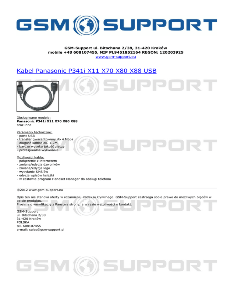 GSM-Support ul. Bitschana 2/38, 31-420 Kraków mobile +48 608107455, NIP PL9451852164 REGON: 120203925 www.gsm-support.eu Kabel Panasonic P341i X11 X70 X80 X88 USB Obsługiwane modele: Panasonic P341i X11 X70 X80 X88 oraz inne Parametry techniczne: - port: USB - transfer gwarantowany do 4 Mbps - długość kabla: ok. 1.2m - bardzo wysoka jakość złączy - profesjonalne wykonanie Możliwości kabla: - połączenie z internetem - zmiana/edycja dzwonków - zmiana/edycja logo - wysyłanie SMS'ów - edycja wpisów książki - w zestawie program Handset Manager do obsługi telefonu ©2012 www.gsm-support.eu Opis ten nie stanowi oferty w rozumieniu Kodeksu Cywilnego. GSM-Support zastrzega sobie prawo do możliwych błędów w opisie produktu. Prosimy o weryfikację z Państwa strony, a w razie wątpliwości o kontakt. GSM-Support ul. Bitschana 2/38 31-420 Kraków POLSKA tel. 608107455 e-mail: [email protected] Powered by TCPDF (www.tcpdf.org)