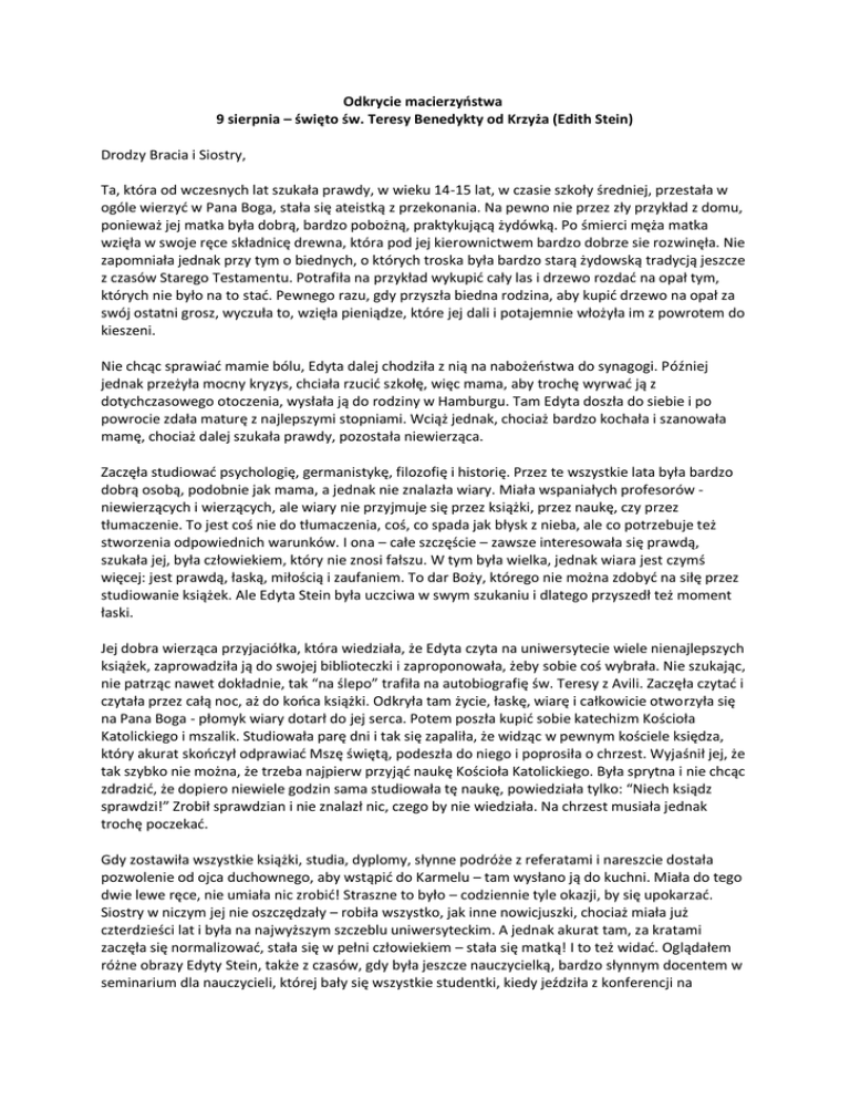 Odkrycie macierzyostwa 9 sierpnia – święto św. Teresy Benedykty od Krzyża (Edith Stein) Drodzy Bracia i Siostry, Ta, która od wczesnych lat szukała prawdy, w wieku 14-15 lat, w czasie szkoły średniej, przestała w ogóle wierzyd w Pana Boga, stała się ateistką z przekonania. Na pewno nie przez zły przykład z domu, ponieważ jej matka była dobrą, bardzo pobożną, praktykującą żydówką. Po śmierci męża matka wzięła w swoje ręce składnicę drewna, która pod jej kierownictwem bardzo dobrze sie rozwinęła. Nie zapomniała jednak przy tym o biednych, o których troska była bardzo starą żydowską tradycją jeszcze z czasów Starego Testamentu. Potrafiła na przykład wykupid cały las i drzewo rozdad na opał tym, których nie było na to stad. Pewnego razu, gdy przyszła biedna rodzina, aby kupid drzewo na opał za swój ostatni grosz, wyczuła to, wzięła pieniądze, które jej dali i potajemnie włożyła im z powrotem do kieszeni. Nie chcąc sprawiad mamie bólu, Edyta dalej chodziła z nią na nabożeostwa do synagogi. Później jednak przeżyła mocny kryzys, chciała rzucid szkołę, więc mama, aby trochę wyrwad ją z dotychczasowego otoczenia, wysłała ją do rodziny w Hamburgu. Tam Edyta doszła do siebie i po powrocie zdała maturę z najlepszymi stopniami. Wciąż jednak, chociaż bardzo kochała i szanowała mamę, chociaż dalej szukała prawdy, pozostała niewierząca. Zaczęła studiowad psychologię, germanistykę, filozofię i historię. Przez te wszystkie lata była bardzo dobrą osobą, podobnie jak mama, a jednak nie znalazła wiary. Miała wspaniałych profesorów niewierzących i wierzących, ale wiary nie przyjmuje się przez książki, przez naukę, czy przez tłumaczenie. To jest coś nie do tłumaczenia, coś, co spada jak błysk z nieba, ale co potrzebuje też stworzenia odpowiednich warunków. I ona – całe szczęście – zawsze interesowała się prawdą, szukała jej, była człowiekiem, który nie znosi fałszu. W tym była wielka, jednak wiara jest czymś więcej: jest prawdą, łaską, miłością i zaufaniem. To dar Boży, którego nie można zdobyd na siłę przez studiowanie książek. Ale Edyta Stein była uczciwa w swym szukaniu i dlatego przyszedł też moment łaski. Jej dobra wierząca przyjaciółka, która wiedziała, że Edyta czyta na uniwersytecie wiele nienajlepszych książek, zaprowadziła ją do swojej biblioteczki i zaproponowała, żeby sobie coś wybrała. Nie szukając, nie patrząc nawet dokładnie, tak “na ślepo” trafiła na autobiografię św. Teresy z Avili. Zaczęła czytad i czytała przez całą noc, aż do kooca książki. Odkryła tam życie, łaskę, wiarę i całkowicie otworzyła się na Pana Boga - płomyk wiary dotarł do jej serca. Potem poszła kupid sobie katechizm Kościoła Katolickiego i mszalik. Studiowała parę dni i tak się zapaliła, że widząc w pewnym kościele księdza, który akurat skooczył odprawiad Mszę świętą, podeszła do niego i poprosiła o chrzest. Wyjaśnił jej, że tak szybko nie można, że trzeba najpierw przyjąd naukę Kościoła Katolickiego. Była sprytna i nie chcąc zdradzid, że dopiero niewiele godzin sama studiowała tę naukę, powiedziała tylko: “Niech ksiądz sprawdzi!” Zrobił sprawdzian i nie znalazł nic, czego by nie wiedziała. Na chrzest musiała jednak trochę poczekad. Gdy zostawiła wszystkie książki, studia, dyplomy, słynne podróże z referatami i nareszcie dostała pozwolenie od ojca duchownego, aby wstąpid do Karmelu – tam wysłano ją do kuchni. Miała do tego dwie lewe ręce, nie umiała nic zrobid! Straszne to było – codziennie tyle okazji, by się upokarzad. Siostry w niczym jej nie oszczędzały – robiła wszystko, jak inne nowicjuszki, chociaż miała już czterdzieści lat i była na najwyższym szczeblu uniwersyteckim. A jednak akurat tam, za kratami zaczęła się normalizowad, stała się w pełni człowiekiem – stała się matką! I to też widad. Oglądałem różne obrazy Edyty Stein, także z czasów, gdy była jeszcze nauczycielką, bardzo słynnym docentem w seminarium dla nauczycieli, której bały się wszystkie studentki, kiedy jeździła z konferencji na konferencję, od katedry do katedry i ludzie nieraz uciekali od niej (bardzo cenili ją tylko naukowcy). Na tym obrazie wygląda naprawdę bardzo surowo. Patrząc na obrazy, które zostały zrobione w klasztorze, widad tam życie, miłośd, ona budzi zaufanie, bliskośd, tam widad macierzyostwo! To dało mi bardzo dużo do myślenia. Dzięki temu, że zaczęła takie – powierzchownie patrząc na to, "sztuczne", "nienormalne" życie w klasztorze, za kratami, z surowym planem dnia, co chwilę chodząc do kaplicy – stała się normalna, stała się w pełni sobą. Jak to możliwe? Jestem pewny: dlatego, bo trwała w Nim, tak jak latorośl w krzewie winnym. Przez to trwanie w Nim, też w trudnych, prostych, normalnych zajęciach, bez ambicji, bez sukcesu – obojętnie, czy to adoracja w kaplicy albo kontemplacja w czasie rozważania czy zwyczajna praca – stała się normalnym, w pełni dojrzałym człowiekiem. To jest droga dla każdego z nas i szczęśliwy, kto jest tak uczciwy w szukaniu prawdy jak ona. Na koocu była tak wolna, że z największą naturalnością poszła za tymi, którzy zaprowadzili ją do obozu koncentracyjnego. I ta tak niepraktyczna z natury, z wychowania kobieta, potrafiła teraz wspaniale organizowad, zajmowad się praktycznymi rzeczami, aby służyd innym. Ona trwała w Panu Bogu — nie było już tak ważne, gdzie jest i w jakich warunkach idzie do Niego. Nie klasztor, nie reguła, nie sposób pracy: czy to na uniwersytecie, czy w kuchni są istotne, ale bycie w Nim – świętośd. To jest ta tajemnica: trwad w Panu Bogu – to wszystko. O. Winfried Wermter