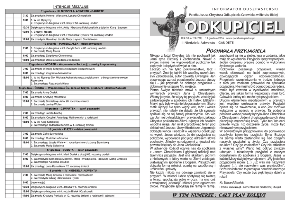 Intencje Mszalne 11 grudnia – III NIEDZIELA ADWENTU - GAUDETE 7:30 Za zmarłych: Helenę, Wiesława, Leszka Chmarskich I N F O R M AT O R D U S Z PA S T E R S K I Parafia Jezusa Chrystusa Odkupiciela Człowieka w Bielsku-Białej 9:00 1. W int. Ojczyzny 2. Dziękczynno-błagalna w int. Ilony w 50. rocznicę urodzin 10:30 Dziękczynno-błagalna w int. Anity i Gracjana Kołakowskich z dziećmi Klarą i Leonem 12:00 1. Chrzty i Roczki 2. Dziękczynno-błagalna w int. Franciszka Cybuli w 10. rocznicę urodzin 17:00 Za zmarłych: Karolinę i Józefa Siuty z synem Stanisławem 12 grudnia – PONIEDZIAŁEK – dzień powszedni 7:00 1. Dziękczynno-błagalna w int. Cecylii Bem w 80. rocznicę urodzin 2. Za zmarłą Marię Marek 8:00 Za zmarłego Zbigniewa Chmielowca 18:00 Za zmarłego Daniela Dziedzica z rodzicami 13 grudnia – WTOREK – Wspomnienie Św. Łucji, dziewicy i męczennicy 7:00 Za zmarłą Wiktorię Skrzypek z rodzicami i rodzeństwem 8:00 Za zmarłego Zbigniewa Niewiedział 18:00 1. W int. Rycerzy Św. Michała Archanioła wraz z opiekunem i o błogosławione owoce Rycerstwa 2. Za zmarłego Ryszarda Miklera 14 grudnia – ŚRODA – Wspomnienie Św. Jana od Krzyża, prezbitera i doktora Kościoła 7:00 Za zmarłą Annę Oksiak 8:00 Za zmarłą Krystynę Makarczuk 18:00 1. Za zmarłą Bronisławę Jeł w 20. rocznicę śmierci 2. Za zmarłą Janinę Wolan 15 grudnia – CZWARTEK – dzień powszedni 7:00 Za zmarłego Józefa Muchę 8:00 Za zmarłych: Cecylię i Antoniego Malinowskich z rodzicami 18:00 1. W int. Akcji Katolickiej 2. Za zmarłego Tadeusza Koniora w 1. rocznicę śmierci 16 grudnia – PIĄTEK – dzień powszedni 7:00 Za zmarłą Zofię Szymańską 8:00 Za zmarłego Rudolfa Hoffmanna 18:00 1. Za zmarłego Józefa Wala w 1. rocznicę śmierci z żoną Stanisławą 2. Za zmarłą Marię Salachna 17 grudnia – SOBOTA – dzień powszedni 7:00 Dziękczynno-błagalna w int. Marii Dudek z okazji 65. rocznicy urodzin 8:00 1. Za zmarłych: Stanisława Moskwik, Marię i Władysława, Tadeusza i Zofię Grzesiek 2. Za zmarłego Kajetana Jakubca 18:00 Za zmarłego Jana Kastelika w 12. rocznicę śmierci 18 grudnia – IV NIEDZIELA ADWENTU 7:30 1. Za zmarłą Marię Kmiecik z rodzicami i rodzeństwem 2. Za zmarłych: Albinę i Kazimierza Pytiak 9:00 (rezerwacja) 10:30 Dziękczynno-błagalna w int. Jakuba w 5. rocznicę urodzin 12:00 Dziękczynno-błagalna w int. rodzin Białek i Czajkowski 17:00 Za zmarłą Krystynę Penkala w 10. rocznicę śmierci z rodzicami i teściami ą Rok 18, nr 39 (730) grudnia24 2016 (609) www.parafiakarpackie.pl Rok 18,11nr 22 czerw- III XIINiedziela NiedzielaAdwentu Zwykła - GAUDETE Pochwała przyjaciela Nikogo z ludzi Chrystus tak nie pochwalił jak Jana syna Elżbiety i Zachariasza. Nawet o swojej mamie nie wypowiedział publicznie tak pięknych i ciepłych słów jak o nim. Łączyło ich nie tylko pokrewieństwo, lecz i przyjaźń. Znał jej tajniki ich wspólny uczeń Jan, syn Zebedeusza, autor czwartej Ewangelii. Jan obserwując wzrost popularności Jezusa cieszy się i – jak przystało na dobrego przyjaciela – dobrowolnie ustępuje Mu miejsca. Pismo Święte niewiele mówi o konkretnych wymiarach przyjaźni Jana z Chrystusem. Wiemy jedynie, że więzy tej przyjaźni zostały już zadzierzgnięte w spotkaniu ich matek: Elżbiety i Maryi, gdy były w stanie błogosławionym. Skoro matki łączyły nie tylko więzy krwi, lecz i wielka przyjaźń, nie należy się dziwić, że ich synowie spotkali się na tej samej płaszczyźnie. Kto wie czy Jan nie był najbliższym przyjacielem, jakiego Chrystus posiadał na Ziemi. Łączyła ich bowiem wspólna misja. Jan miał przygotować teren pod działalność Jezusa. Uczynił to dobrze. Jego misja dobiegła końca i siedział w więzieniu oczekując na wyrok. Jezus wiedząc, że dni przyjaciela są policzone, wypowiada pod jego adresem słowa pochwały: „Między narodzonymi z niewiast nie powstał większy od Jana Chrzciciela”. W adwencie Kościół wzywa nas do spotkania z Janem Chrzcicielem i głębszej refleksji nad tajemnicą przyjaźni. Jest ona skarbem, jednym z nielicznych, o który warto na Ziemi zabiegać, ułatwiającym spotkanie z Bogiem. Przyjaźń jest dojrzałą formą miłości, opartą na współpracy i umiłowaniu prawdy. Nie każda miłość ma odwagę zamienić się w przyjaźń. W miłości ludzie spotykają się twarzą w twarz, spoglądają sobie w oczy, ma ona coś z wzajemnej „adoracji”. Miłości grozi egoizm we dwoje. Przyjaciele spotykają się ramię w ramię, zapatrzeni są nie w siebie, lecz w zadania, jakie mają do wykonania. Przyjaciół łączy wspólny cel. Jeden drugiemu pragnie pomóc w wykonaniu życiowego zadania. Ktokolwiek poszukuje przyjaciela, winien wzrok skierować na ludzi zapracowanych, dźwigających ciężar odpowiedzialności. Pragnienie uczestniczenia w trudzie jednego z nich jest znakiem gotowości na spotkanie przyjaciela. Nie musi to być pomoc bezpośrednia, może być zawarta w życzliwości, modlitwie, ofierze, ale jakaś forma współpracy musi być. Człowiek leniwy nie może być przyjacielem. Drugim elementem nieodzownym w przyjaźni jest wspólne umiłowanie prawdy. Przyjaźń opiera się na zawierzeniu, a ono jest możliwe wyłącznie w oparciu o prawdę. Ta podobna postawa wobec prawdy łączyła Jana Chrzciciela z Chrystusem. Jeden i drugi prawdę swych słów pieczętuje męczeńską krwią. Tylko ten, kto ceni prawdę wyżej niż doczesne życie, może być niezawodnym przyjacielem. W adwentowym przygotowaniu do ponownego przeżycia tajemnicy przyjścia Syna Bożego na ziemię warto zastanowić się nad dziejami naszych przyjaźni w życiu. Czy przyjaciela szukam? Czy go znalazłem? Czy nie straciłem z własnej winy? Warto też odkryć związek udanych i nieudanych przyjaźni z naszym dorastaniem do spotkania z Bogiem. Jezus w każdej Mszy świętej wyznaje nam: „Wy jesteście przyjaciółmi moimi (...) Już was nie nazyw