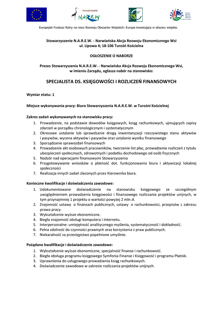 Europejski Fundusz Rolny na rzecz Rozwoju Obszarów Wiejskich: Europa inwestująca w obszary wiejskie. Stowarzyszenie N.A.R.E.W. - Narwiańska Akcja Rozwoju Ekonomicznego Wsi ul. Lipowa 4; 18-106 Turośń Kościelna OGŁOSZENIE O NABORZE Prezes Stowarzyszenia N.A.R.E.W. - Narwiańska Akcja Rozwoju Ekonomicznego Wsi, w imieniu Zarządu, ogłasza nabór na stanowisko: SPECJALISTA DS. KSIĘGOWOŚCI I ROZLICZEŃ FINANSOWYCH Wymiar etatu: 1 Miejsce wykonywania pracy: Biuro Stowarzyszenia N.A.R.E.W. w Turośni Kościelnej Zakres zadań wykonywanych na stanowisku pracy: 1. Prowadzenie, na podstawie dowodów księgowych, ksiąg rachunkowych, ujmujących zapisy zdarzeń w porządku chronologicznym i systematycznym 2. Okresowe ustalanie lub sprawdzanie drogą inwentaryzacji rzeczywistego stanu aktywów i pasywów, wycena aktywów i pasywów oraz ustalanie wyniku finansowego 3. Sporządzanie sprawozdań finansowych 4. Prowadzenie akt osobowych pracowników, tworzenie list płac, prowadzenie rozliczeń z tytułu ubezpieczeń społecznych, zdrowotnych i podatku dochodowego od osób fizycznych 5. Nadzór nad operacjami finansowymi Stowarzyszenia 6. Przygotowywanie wniosków o płatność dot. funkcjonowania biura i aktywizacji lokalnej społeczności 7. Realizacja innych zadań zleconych przez Kierownika biura. Konieczne kwalifikacje i doświadczenia zawodowe: 1. Udokumentowane doświadczenie na stanowisku księgowego ze szczególnym uwzględnieniem prowadzenia księgowości i finansowego rozliczania projektów unijnych, w tym przynajmniej 1 projektu o wartości powyżej 2 mln zł. 2. Znajomość ustawy o finansach publicznych, ustawy o rachunkowości, przepisów z zakresu prawa pracy. 3. Wykształcenie wyższe ekonomiczne. 4. Biegła znajomość obsługi komputera i Internetu. 5. Interpersonalne: umiejętność analitycznego myślenia, systematyczność i dokładność. 6. Pełna zdolność do czynności prawnych oraz korzystania z praw publicznych. 7. Niekaralność za przestępstwo popełnione umyślnie. Pożądane kwalifikacje i doświadczenie zawodowe: 1. Wykształcenie wyższe ekonomiczne, specjalność finanse i rachunkowość. 2. Biegła obsługa programu księgowego Symfonia Finanse i Księgowość i programu Płatnik. 3. Uprawnienia do usługowego prowadzenia ksiąg rachunkowych. 4. Doświadczenie zawodowe w zakresie rozliczania projektów unijnych. Europejski Fundusz Rolny na rzecz Rozwoju Obszarów Wiejskich: Europa inwestująca w obszary wiejskie. Wymagane dokumenty i oświadczenia: 1. CV i list motywacyjny, 2. oświadczenie kandydata o wyrażeniu zgody na przetwarzanie danych osobowych do celów rekrutacji, 3. kserokopie dokumentów potwierdzających wymagane wykształcenie i doświadczenie, 4. oświadczenie kandydata o pełnej zdolności do czynności prawnych oraz o korzystaniu z pełni praw publicznych, 5. oświadczenie kandydata o nieskazaniu prawomocnym wyrokiem za przestępstwo popełnione umyślnie. Termin składania dokumentów: 06-06-2016 do godziny 15.00. Miejsce składania dokumentów: Biuro Stowarzyszenia N.A.R.E.W. - Narwiańska Akcja Rozwoju Ekonomicznego Wsi, ul. Lipowa 4, 18 – 106 Turośń Kościelna, czynne w godzinach 08.00 – 16.00. Inne informacje: 1. Wymagane dokumenty aplikacyjne należy złożyć w zamkniętej kopercie w biurze Stowarzyszenia N.A.R.E.W. lub przesłać pocztą z dopiskiem: Nabór na wolne stanowisko pracy: specjalista ds. księgowości i rozliczeń finansowych . Za datę złożenia dokumentów drogą pocztową uważa się datę wpływu oferty do biura Stowarzyszenia. Oferty, które wpłyną drogą e-mailową, po terminie lub będą niekompletne, nie będą rozpatrywane. Ofert niewybranych biuro nie odsyła. 2. CV, list motywacyjny i oświadczenia powinny być złożone w oryginale i podpisane przez Kandydata; pozostałe dokumenty, składane w kserokopiach, powinny być poświadczone za zgodność z oryginałem przez Kandydata (czytelny podpis, data oraz sformułowanie: „Za zgodność z oryginałem”). 3. Brak w złożonej przez kandydata dokumentacji aplikacyjnej informacji (w formie oświadczeń lub dokumentów źródłowych) o spełnieniu wymagań koniecznych będzie potraktowane jako niespełnienie kryterium. Jeżeli kandydat nie spełnia wymagań koniecznych zamieszczonych w ogłoszeniu o naborze, jego kandydatura nie jest brana pod uwagę w dalszym postępowaniu kwalifikacyjnym i kandydat nie zostanie zaproszony na rozmowę kwalifikacyjną. 4. Lista kandydatów spełniających wymagania formalne będzie umieszczona na stronie internetowej Stowarzyszenia N.A.R.E.W. : www.stowarzyszenienarew.org.pl. w terminie do 5 dni od terminu zakończenia naboru. 5. Procedura naboru pracowników wynika z Regulaminu Biura Stowarzyszenia N.A.R.E.W. – Narwiańska Akcja Rozwoju Ekonomicznego Wsi i jest do wglądu w biurze Stowarzyszenia N.A.R.E.W. w godzinach pracy biura. Europejski Fundusz Rolny na rzecz Rozwoju Obszarów Wiejskich: Europa inwestująca w obszary wiejskie.