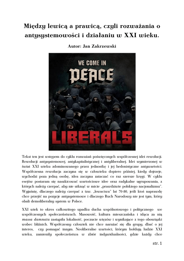 Między lewicą a prawicą, czyli rozważania o antysystemowości i działaniu w XXI wieku. Autor: Jan Zakrzewski Tekst ten jest wstępem do cyklu rozważań poświęconych współczesnej idei rewolucji. Rewolucji antysystemowej, antykapitalistycznej i antyliberalnej. Idei wymierzonej w świat XXI wieku zdominowanego przez jednostkę i jej hedonistyczne antywartości. Współczesna rewolucja zaczyna się w człowieku dopiero później, kiedy dojrzeje, wychodzi poza jedną osobę, idea zaczyna zataczać co raz szersze kręgi. W cyklu esejów postaram się naszkicować wartościowe idee oraz radykalne ugrupowania, z których należy czerpać, aby nie utknąć w micie „prawdziwie polskiego nacjonalizmu”. Wyjaśnię, dlaczego należy czerpać z tzw. „lewactwa” lat 70-80, jeśli ktoś naprawdę chce przejść na pozycje antysystemowe i dlaczego Ruch Narodowy nie jest tym, który obali demoliberalny system w Polsce. XXI wiek to okres całkowitego upadku ducha wspólnotowego i politycznego we współczesnych społeczeństwach. Masowość, kultura mieszczańska i idąca za nią massa damnata zastąpiła lokalność, poczucie więzów i wynikające z tego obowiązki wobec bliźnich. Współczesny człowiek nie chce narażać się dla grupy, dbać o jej interes, czy pomagać innym. Neoliberalne wartości, którym hołdują ludzie XXI wieku, zamieniły społeczeństwa w zbiór indywidualności, gdzie każdy chce str. 1 konsumować, nie martwić się i żyć szczęśliwie bez zobowiązań. Rozbite więzi społeczne doprowadziły do tego, że wiele osób zaczyna się zastanawiać, czy pojęcie narodu ma jeszcze sens, czy to już tylko slogan związany z terminem Staatsnation Meineckego. Indywidualizm, materializm, konsumpcjonizm, niszczenie sfery ducha oraz obojętność to plagi XXI wieku, które rozbijają poczucie więzi, będące fundamentem każdego ruchu społecznego. Rewolucjoniści XXI wieku stają przed trudnym wyborem: co robić, jak walczyć i przede wszystkim, czy to jeszcze ma sens. Walka zbrojna, przy rozbudowanym, państwowym aparacie kontroli i represji, bez odpowiedniego zaplecza finansowospołecznego, nie ma sensu. Pozostaje walka na płaszczyźnie ideowej, która jest również trudna z racji obojętności społecznej. Neoliberalne dogmaty bardzo szybko przyjmują się w każdym społeczeństwie, rozbijając lokalną tradycję, kulturę i wykształcone przez wieki więzi społeczne. Wszyscy stają się tacy sami i gdzie ten multikulturalizm… Nacjonalista chcący włączyć się w wojnę przeciwko nowoczesnemu światu staje na początku trudnej i zawiłej drogi. Musi dokonać wielu wyborów, zmienić sposób życia, pokonać wiele słabości, a przede wszystkim zmierzyć się z sobą samym. Wojna, którą rozpocznie to przede wszystkim wojna dwóch światów duchowych, to tam dojdzie do największej bitwy. Świata upadłego, niskich żądz, chtonicznego, ze światem lunarnym, arystokratycznym, który Juliusz Evola nazywa aryjskim. To tutaj dochodzi do największej batalii, kiedy młody nacjonalista odkryje te wartości i zapragnie przekazać je zniewieściałemu, opętanemu filisterstwem społeczeństwu. Zobaczy, że jest to bardzo trudne, współczesne społeczeństwo jest, idąc za św. Augustynem, masą potępioną (massa damnata) i nie reprezentuje sobą żadnych aspiracji duchowych, dlatego głównym zadaniem współczesnych rewolucjonistów jest rozbudzenie pierwiastka duchowego w tych ludziach. W tym momencie przyszły rewolucjonista zada pytanie: gdzie szukać inspiracji? Zacznijmy od Polski, a mundurkowi działacze odpowiedzą chórem: „Roman Dmowski i endecja”. Niestety nie jest to właściwa droga. Doktryna endecka dostarczyła wielu interesujących rozwiązań, jednak odeszła od swoich ludowych założeń już w początkach XX wieku, kierując się ku interesom mieszczan i właścicieli ziemskich oraz bogatych przedsiębiorców. Oczywiście rozłamowcy 1934 roku w postaci ONR oraz ZMN skupili się na tych wykluczonych grupach, ale w dalszym ciągu były to tylko symboliczne gesty, które nie pociągnęły za sobą niczego konkretnego. Doktryna piłsudczykowska, druga wielka myśl II RP, bazowała na etosie państwowo – wojennym w związku z czym była trochę bliższa społeczeństwu. W Legionach mógł walczyć każdy, dzięki temu idea ta spajała wiele klas społecznych. Najważniejszym ruchem, który znalazł się na orbicie wpływów piłsudczyków, był bez wątpienia syndykalizm. Doktryna polskiego syndykalizmu przesiąknięta była duchem rewolucji i patriotyzmu, pozytywnego patriotyzmu. Jej twórca Stanisław Brzozowski (1878-1911) wielokrotnie podkreślał, że trzeba oderwać polską świadomość narodową od str. 2 wiązania jej ze szlachectwem i jego kompleksami. Nowa, polska świadomość powinna być skupiona na etosie ludzi pracy, którzy stworzą mit silnej, solidarnej i walczącej Polski. Idee te kontynuowali w II RP teoretycy polskiego syndykalizmu na czele z Kazimierzem Zakrzewskim, który twierdził, że tylko sojusz młota i miecza pomoże zbudować nowe państwo i nowe społeczeństwo. Zakrzewski pisał: „Syndykalizm to jedyny ruch rewolucyjny, który odmładza narody, odradza je wewnętrznie budzi w nich nowe siły. To jedyna siła społeczna, która zapowiada i przygotowuje nowe Odrodzenie”.(przypis) Syndykaliści przeanalizowali ówczesne idee polityczne w postaci rewolucji antyliberalnych, od bolszewizmu po narodowy socjalizm, ukazując ich mocne i słabe strony, które podsumowali: „Bolszewizm czy faszyzm w procesie dziejów nowego świata zrobiły już swoją robotę, której odwalanie raz jeszcze nie jest chyba nikomu potrzebne. Powinniśmy dążyć do przejścia ponad tymi systemami do dalszego okresu rewolucji antyliberalnej, bardziej konstrukcyjnego i, powiedzmy sobie, więcej ludzkiego, ale w każdym razie iść naprzód z każdym dniem”.(przypis) Po śmierci Zakrzewskiego myśl syndykalistyczna upadła, zmieni
