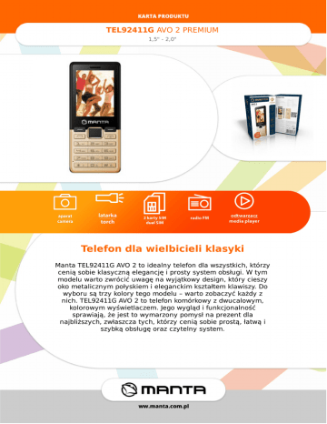 TEL92411GAVO2PREMIUM 1,5"-2,0" Telefondlawielbicieliklasyki MantaTEL92411GAVO2toidealnytelefondlawszystkich,którzy ceniąsobieklasycznąelegancjęiprostysystemobsługi.Wtym modeluwartozwrócićuwagęnawyjątkowydesign,którycieszy okometalicznympołyskiemieleganckimkształtemklawiszy.Do wyborusątrzykolorytegomodelu–wartozobaczyćkażdyz nich.TEL92411GAVO2totelefonkomórkowyzdwucalowym, kolorowymwyświetlaczem.Jegowyglądifunkcjonalność sprawiają,żejesttowymarzonypomysłnaprezentdla najbliższych,zwłaszczatych,którzyceniąsobieprostą,łatwąi szybkąobsługęorazczytelnysystem. TEL92411GAVO2PREMIUM 1,5"-2,0" Specyfikacja Funkcjetelefonu MantaTEL92411GAVO2posiada32MBpamięci flash,dziękiczemupomieściniezbędnepliki– posiadateżgniazdopamięciTFCard,dziękiczemu możnazwiększyćpamięćflashtelefonuo8GB zapewniająctymsamymmożliwość przechowywaniazdjęćczyinnych,ważnychdla użytkownikaplików. Multimedia Mimotego,żetelefonjestprostywobsłudze,nie przypominaonzwykłychtelefonówkomórkowych, gdyżposiadaowielewięcejfunkcji–między innymiumożliwiasłuchanieulubionychstacji radiowych,dziękiwbudowanemuradiuFM. Ponadtoposiadalatarkę,trybwibracjiorazbardzo pojemnąbaterię(1000mAh)dziękiktórejmodelten zapewniadługiczasużytkowanianajednym ładowaniu.Jesttoidealnyprezent,wszczególności dlastarszychosób. Waga 100g Dual-SIM Tak Bluetooth Tak Aparat Tak Gniazdokartpamięci TFCard(max.8GB) ObsługiwanepasmaGSM 850/900/1800/1900MHz RadioFM Tak Wyświetlacz 2"LCD Bateria 1000mAh Wymiary 121.4x51.2x93mm Obsługamultimediów TAK Wibracje TAK Latarka TAK Pamięć 32MB http://www.manta.com.pl/pl/tel92411g EAN:5902510605735
