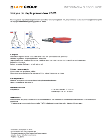 INFORMACJA O PRODUKCIE Nożyce do cięcia przewodów KS 20