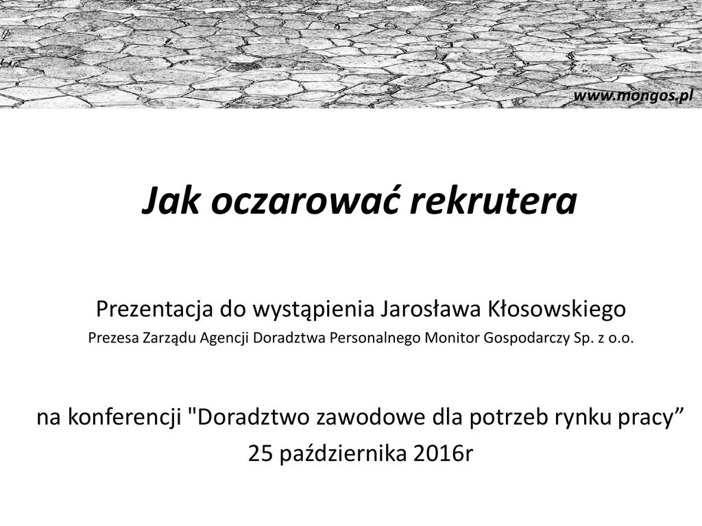 www.mongos.pl Jak oczarować rekrutera Prezentacja do wystąpienia Jarosława Kłosowskiego Prezesa Zarządu Agencji Doradztwa Personalnego Monitor Gospodarczy Sp. z o.o. na konferencji "Doradztwo zawodowe dla potrzeb rynku pracy” 25 października 2016r Rynek pracownika Trudność w pozyskaniu kandydatów – spada skuteczność ogłoszeń, pojawia się konieczność zatrudniania osób o niższych kwalifikacjach niż początkowo zakładano Wzrastają wymagania kandydatów – dotyczą zarówno wynagrodzeń, ale także szeroko rozumianego rozwoju zawodowego, warunków i relacji międzyludzkich w pracy Osoby niezadowolone z pracy częściej myślą o odejściu, spada poziom lojalności już zatrudnionych osób www.mongos.pl Rekrutacja na rynku pracownika – docieranie do kandydatów Ogłoszenia: Ograniczona responsywność kandydatów Funkcja związana głównie z budowaniem wizerunku firmy Docieranie bezpośrednie: Pozyskiwani kandydaci posiadają wymagane kwalifikacje i doświadczenie Nie są zmotywowani do podjęcia pracy w naszej firmie i naszym zadaniem jest tę motywację wzbudzić Programy praktyk i stażów: Pozyskiwani kandydaci nie posiadają doświadczenia Możliwość sprawdzenia kompetencji „miękkich” w praktyce www.mongos.pl Millenialsi • Kasa, Sława , Melanż • Profesjonalizm, innowacyjność vs zero nadgodzin, pogarda dla niedouczonych kierowników i przestarzałych struktur • Zero lojalności • Bezczelne i roszczeniowe chłopaki, leniwe i aroganckie dziewczyny • Pokolenie sieci – odważni, mający własne zdanie, asertywni, wierzą tylko w rekomendacje • Boją się tylko jednego - Dorosłości www.mongos.pl Jak szukamy • ogłoszenie prasowe • ogłoszenie internetowe • strona internetowa • portale internetowe i społecznościowe • „siła przyciągania marki” • biura karier • targi pracy • polecenie • kupowanie baz • werbowanie branżowe • wyławianie (head hunting) www.mongos.pl Daj się zauważyć • • • • • • • Przystępuj do kół naukowych i stowarzyszeń Czytaj prasę branżową, sam pisz Uczęszczaj na targi i spotkania branżowe Bierz udział w szkoleniach Pchaj się do lokalnych mediów Buduj sieć kontaktów Nie nawiązuj kontaktów niepotrzebnych • Bądź wzorem do naśladowania www.mongos.pl Kogo szukamy • • • • • • • • Są precyzyjni Działają we właściwym momencie Wiedzą ile zostało do zrobienia Myślą realnie, ale są optymistami Są coraz lepsi Są wytrwali Nie kuszą losu Skupiają się na tym co zrobią, zamiast na tym czego nie zrobią www.mongos.pl Rozmowa rekrutacyjna pierwsze wrażenie • Wejście ( punktualne) • Jak mnie widzą ( pozytywne nastawienie) • Najważniejsze są szczegóły ( profesjonalizm) • Moda a mój styl • „Chemia” www.mongos.pl Rozmowa rekrutacyjna Kompetencje zawodowe, cechy osobowość, motywacja • • • • • • • • • • Perfekcyjne CV Pokaz swoje osiągnięcia Wiedza nt. stanowiska i firmy Ubierz się odpowiednio Nikogo nie lekceważ Opanuj mowę ciała Poszukaj swojego wyróżnika Nigdy nie kłam Dbaj o dobra komunikację, pytaj Podziękuj za spotkanie www.mongos.pl Rozmowa rekrutacyjna 5 pytań które zawsze padają • Proszę opowiedzieć coś o osobie • Jak widzi Pani/Pan swoją karierę zawodowa za 5 lat • Jakie są Pani/Pana mocne i słabe strony ( ew. proszę opowiedzieć o swoim sukcesie/porażce zawodowej ) • Co Pani/Pan wie o naszej firmie • Jakie są Pani/Pana oczekiwania finansowe www.mongos.pl Rozmowa kwalifikacyjna te pytania (nie)mogą paść • Ile piłek golfowych zmieści się w szkolnym autobusie? To podchwytliwe pytanie. Ciężko jest na nie odpowiedzieć nie znając wymiarów autobusu i piłeczki golfowej. • Jak wiele zapłaciłbyś za umycie wszystkich okien w Seattle? To jest jedno z tych pytań, gdzie sztuką jest wymyślić łatwiejszą odpowiedź niż ta, która jest wymagana. Business Insider proponuje odpowiedź: 10 dolarów za okno • W pewnym kraju rodzice chcą mieć wyłącznie chłopców. Jeżeli jako pierwsze dziecko rodzi się dziewczynka rodzice "próbują" aż do skutku z kolejnymi dziećmi. Gdy pojawi się chłopiec jest to zawsze ostatnie dziecko w rodzinie. Jaka jest proporcja chłopców do dziewczynek w tym kraju? 50/50 • Zaprojektuj plan ewakuacji San Francisco. Za pomocą tego pytania osoba rekrutująca chce sprawdzić, w jaki sposób podejdziemy do problemu. Pytamy :"Jakiej katastrofy ma dotyczyć ewakuacja?" • Dlaczego dekle na studzienki ściekowe są okrągłe? Żeby nie wpadły do środka www.mongos.pl Bądź gwiazdą - STAR S (situation) opisz sytuację w jakiej się znalazłeś T (task) przedstaw zadanie które miałeś rozwiązać A (action) opisz dokładnie jakie podjąłeś działania i jak je realizowałeś R (result) przedstaw jaki był efekt podjętych działań , co osiągnięto, czego się nauczyłeś , z czego jesteś dumny www.mongos.pl Tylko tyle i aż tyle • Profesjonalizm • Motywacja • Innowacyjność www.mongos.pl