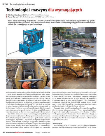 Kraj Technologie bezwykopowe Technologie i maszyny dla wymagających ❚ Wiesław Niewiarowski, PPUH MARK Antoni Marek Kulesza ❚ Paweł Derwich, DTA-Technik Sp. z o.o., TRACTO-Technik® w Polsce Nie ma lepszej rekomendacji dla producenta i dostawcy sprzętu budowlanego niż sukcesy odnoszone przez użytkowników tego sprzętu. Dzięki połączeniu dużej żywotności, mocy i funkcjonalności maszyn Tracto-Technik® z profesjonalną obsługą klientów firma MARK zdobyła zaufanie firm o uznanej pozycji na rynku budowlanym. Przedsiębiorstwo Produkcyjno-Usługowo-Handlowe MARK Antoni Marek Kulesza funkcjonuje na rynku od maja 1994 r. Początkowo zajmowało się projektowaniem sieci i instalacji sanitarnych. Po pewnym czasie rozszerzyło profil o usługi w zakresie kompleksowego wykonawstwa w branży wodno-kanalizacyjnej. Funkcjonowanie firmy w obszarze wykonawstwa bazowało wtedy na jednej koparce „Ostrówek” KT162. Stałe inwestycje w sprzęt i pracowników spowodowały, że obecnie dysponuje 35 jednostkami ciężkiego sprzętu budowlanego i 40 jednostkami sprzętu pomocniczego, który jest do dyspozycji kilkunastu samodzielnych i w pełni wyposażonych brygad wykonawczych. Od 2006 r. firma inwestuje w technologię i sprzęt do bezwykopowej renowacji kanałów. Pomysł podsunęła analiza uwarunkowań technicznych, środowiskowych i społecznych wymiany rurociągów. Wychodząc naprzeciw rosnącemu zapotrzebowaniu, firma MARK poszerzyła swoją ofertę o bezwykopową metodę renowacji kanałów zwaną krakingiem (berstliningiem) statycznym. Metoda krakingu jako jedyna ze stosowanych obecnie renowacyjnych technik bezwykopowych umożliwia 40 Nowoczesne Budownictwo Inżynieryjne Listopad – Grudzień 2009 poszerzenie starego kanału w sprzyjających warunkach i odpowiednim sprzęcie nawet o trzy dymensje i niszczenie starych rur o średnicach do Ø 800 mm. Likwiduje też w znaczącym stopniu (przy większych poszerzeniach) przeciwspadki (w przypadku ich występowania na trasie starego kanału). Takie możliwości, unikatowe w skali kraju, firma MARK posiada dzięki współpracy z firmą DTA-Technik Sp. z o.o., która jest przedstawicielem producenta maszyn Tracto-Technik® w Polsce. Strategia firmy MARK zakłada kompleksową obsługę klientów, począwszy od promowania w Polsce technologii bezwykopowych wśród jednostek samorządowych, biur projektowych i generalnych wykonawców. Dalsze działania polegają na dostarczaniu kompletnej technologii firmom wykonawczym według ich potrzeb oraz świadczeniu pomocy w całym okresie użytkowania maszyn Technologia Berstlining (TRACTO-Technik) jest technologią bezwykopowej wymiany istniejącego rurociągu na nowy przy zacho- Kraj Technologie bezwykopowe Podsumowanie Z uwagi na materiał, długość odcinków, średnicę rur do realizacji zadania została wybrana 80-tonowa maszyna krakingowa Grundoburst® 800 firmy TRACTO-Technik®. Duża siła ciągu, niezawodnie zakleszczające się żerdzie Quicklock® oraz zastosowanie noży rolkowych przyczyniły się do sukcesu całego przedsięwzięcia. GRUNDOBURST® 800 G Laweta Długość min./max 1700/2850 mm Szerokość 720 mm Wysokość 670 mm Waga 1450 kg min. wymiary wykopu (głębokość 225 mm poniżej osi rury) 3000 x 800 mm Siła ciągu standardowa przy 250 bar 769 kN Siła pchania standardowa przy 250 bar 377 kN Wymiary żerdzi „Quicklock” (Ś/D) 70 x 798 mm Długość użytkowa żerdzi „Quicklock” 700 mm Waga żerdzi „Quicklock” 7,5 kg max. Prędkość burstliningu 1,5 m/min max. średnica poszerzenia (zależna od gruntu) 520 mm max. średnica zewnętrzna rury (zależna od gruntu) 450 mm 1640 mm Stacja hydrauliczna Długość waniu dotychczasowej średnicy lub jej zwiększeniu. Podczas procesu wymiany używa się jedynie sił statycznych. Potężne siły potrzebne do zniszczenia starej rury, rozepchnięcia jej oraz wciągnięcia nowej przekazywane są z lawety roboczej za pośrednictwem specjalnych żerdzi do narzędzi roboczych. Metodę tę można stosować do rurociągów z różnych materiałów i o różnym stopniu zniszczenia. Nie wymaga kosztownego procesu czyszczenia rurociągu, gdyż stara rura wymieniona jest na całkowicie nową, a nie tylko reperowana. Materiały, tj. kamionka, beton, azbest, żeliwo, stal lub tworzywa stałe, kruszone są za pomocą specjalnych noży lub rozcinane z jednoczesnym wciąganie nowej rury o tym samym lub większym przekroju. Istnieje możliwość pracy z modułami od studni do studni. Przykład realizacji Wyżej opisaną metodę krakingu rury Ø 200 mm firma MARK zastosowała na położonej w centrum Katowic ul. Jagiellońskiej. O wyborze technologii zdecydowały takie czynniki, jak gęstość podziemnego uzbrojenia i potencjalnie wysokie koszty społeczne całkowitego zamknięcia ruchu w porównaniu do metod tradycyjnych. Zadanie polegające na modernizacji sieci wodociągowej zrealizowano poprzez rozcięcie (kruszenie) bezwykopowo rur stalowych i żeliwnych starego rurociągu i na ich miejsce wciągnięcie rur PE 225. Mimo wielu trudności podczas realizacji prac budowlanych, jak m.in. podziemna zabudowa, nieczynne kable energetyczne oraz stare przyłącza gazowe, które nie były naniesione na plany, budowa przebiegała zgodnie z wcześniej ustalonym harmonogramem. Dzięki wyspecjalizowanym brygadom pracującym w dzień i w nocy przełączenia budynków do nowej sieci wodociągowej zostały zrealizowane praktycznie bez żadnych przerw w dostawie wody, a nieliczne wykopy pozwalały na zachowanie płynnego ruchu na ul. Jagiellońskiej oraz jak najmniejszą ingerencję w życie codziennie mieszkańców Katowic. Szerokość 840 mm Wysokość 1650 mm Waga 1300 silnik diesla Deutz kg Jednostka napędowa Moc przy 2200 U/min kW max. moc przy 2800 U/min 55,5 kW Zbiornik paliwa (objętość) 110 l Rozrusznik 12 V max. wydajność oleju 200 l/min max. ciśnienie oleju 250 bar Zbiornik oleju (objętość) 230 l Poziom hałasu Lwa 98 dB(A) Zapra