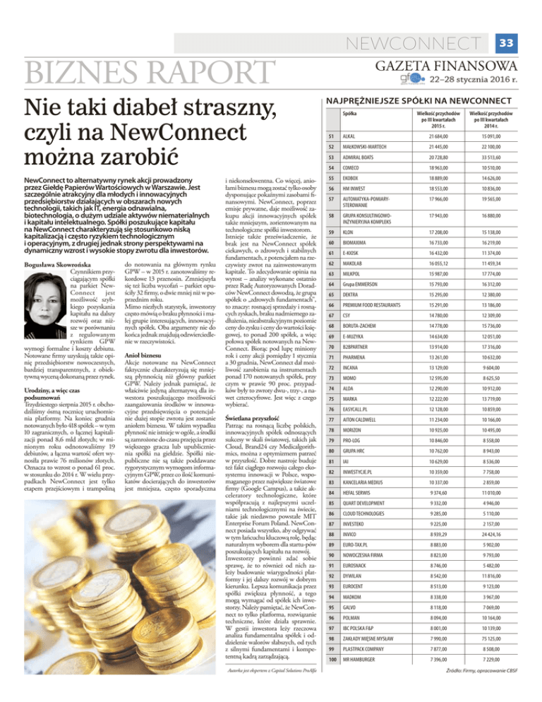 newconnect BIZNES RAPORT Nie taki diabeł straszny, czyli na NewConnect można zarobić NewConnect to alternatywny rynek akcji prowadzony przez Giełdę Papierów Wartościowych w Warszawie. Jest szczególnie atrakcyjny dla młodych i innowacyjnych przedsiębiorstw działających w obszarach nowych technologii, takich jak IT, energia odnawialna, biotechnologia, o dużym udziale aktywów niematerialnych i kapitału intelektualnego. Spółki poszukujące kapitału na NewConnect charakteryzują się stosunkowo niską kapitalizacją i często ryzykiem technologicznym i operacyjnym, z drugiej jednak strony perspektywami na dynamiczny wzrost i wysokie stopy zwrotu dla inwestorów. Bogusława Skowrońska Czynnikiem przyciągającym spółki na parkiet NewConnect jest możliwość szybkiego pozyskania kapitału na dalszy rozwój oraz niższe w porównaniu z regulowanym rynkiem GPW wymogi formalne i koszty debiutu. Notowane firmy uzyskują także opinię przedsiębiorstw nowoczesnych, bardziej transparentnych, z obiektywną wyceną dokonaną przez rynek. Urodziny, a więc czas podsumowań Trzydziestego sierpnia 2015 r. obchodziliśmy ósmą rocznicę uruchomienia platformy. Na koniec grudnia notowanych było 418 spółek – w tym 10 zagranicznych, o łącznej kapitalizacji ponad 8,6 mld złotych; w minionym roku odnotowaliśmy 19 debiutów, a łączna wartość ofert wynosiła prawie 76 milionów złotych. Oznacza to wzrost o ponad 61 proc. w stosunku do 2014 r. W wielu przypadkach NewConnect jest tylko etapem przejściowym i trampoliną do notowania na głównym rynku GPW – w 2015 r. zanotowaliśmy rekordowe 13 przenosin. Zmniejszyła się też liczba wycofań – parkiet opuściły 32 firmy, o dwie mniej niż w poprzednim roku. Mimo niezłych statystyk, inwestorzy często mówią o braku płynności i małej grupie interesujących, innowacyjnych spółek. Oba argumenty nie do końca jednak znajdują odzwierciedlenie w rzeczywistości. Anioł biznesu Akcje notowane na NewConnect faktycznie charakteryzują się mniejszą płynnością niż główny parkiet GPW. Należy jednak pamiętać, że właściwie jedyną alternatywą dla inwestora poszukującego możliwości zaangażowania środków w innowacyjne przedsięwzięcia o potencjalnie dużej stopie zwrotu jest zostanie aniołem biznesu. W takim wypadku płynność nie istnieje w ogóle, a środki są zamrożone do czasu przejęcia przez większego gracza lub upublicznienia spółki na giełdzie. Spółki niepubliczne nie są także poddawane rygorystycznym wymogom informacyjnym GPW, przez co ilość komunikatów docierających do inwestorów jest mniejsza, często sporadyczna 33 gazeta finansowa 22–28 stycznia 2016 r. Najprężniejsze spółki na Newconnect Spółka Wielkość przychodów po III kwartałach 2015 r. Wielkość przychodów po III kwartałach 2014 r. 51 ALKAL 21 684,00 15 091,00 52 MAŁKOWSKI-MARTECH 21 445,00 22 100,00 53 ADMIRAL BOATS 20 728,80 33 513,60 54 COMECO 18 963,00 10 510,00 i niekonsekwentna. Co więcej, aniołami biznesu mogą zostać tylko osoby dysponujące pokaźnymi zasobami finansowymi. NewConnect, poprzez emisje prywatne, daje możliwość zakupu akcji innowacyjnych spółek także mniejszym, zorientowanym na technologiczne spółki inwestorom. Istnieje także przeświadczenie, że brak jest na NewConnect spółek ciekawych, o zdrowych i stabilnych fundamentach, z potencjałem na rzeczywisty zwrot na zainwestowanym kapitale. To zdecydowanie opinia na wyrost – analizy wykonane ostatnio przez Radę Autoryzowanych Doradców NewConnect dowodzą, że grupa spółek o „zdrowych fundamentach”, to znaczy: rosnącej sprzedaży i rosnących zyskach, braku nadmiernego zadłużenia, nieabstrakcyjnym poziomie ceny do zysku i ceny do wartości księgowej, to ponad 200 spółek, a więc połowa spółek notowanych na NewConnect. Biorąc pod lupę miniony rok i ceny akcji pomiędzy 1 stycznia a 30 grudnia, NewConnect dał możliwość zarobienia na instrumentach ponad 170 notowanych spółek, przy czym w prawie 90 proc. przypadków były to zwroty dwu-, trzy-, a nawet czterocyfrowe. Jest więc z czego wybierać. 55 EKOBOX 18 889,00 14 626,00 56 HM INWEST 18 553,00 10 836,00 57 AUTOMATYKA-POMIARYSTEROWANIE 17 966,00 19 565,00 58 GRUPA KONSULTINGOWOINŻYNIERYJNA KOMPLEKS 17 943,00 16 880,00 59 KLON 17 208,00 15 138,00 60 BIOMAXIMA 16 733,00 16 219,00 61 E-KIOSK 16 432,00 11 374,00 62 MAKOLAB 16 055,12 11 459,34 63 MILKPOL 15 987,00 17 774,00 64 Grupa EMMERSON 15 793,00 16 312,00 65 DEKTRA 15 295,00 12 380,00 66 PREMIUM FOOD RESTAURANTS 15 291,00 13 186,00 67 CSY 14 780,00 12 309,00 68 BORUTA-ZACHEM 14 778,00 15 736,00 69 E-MUZYKA 14 634,00 12 051,00 70 B2BPARTNER 13 914,00 17 316,00 71 PHARMENA 13 261,00 10 632,00 72 INCANA 13 129,00 9 604,00 73 MOMO 12 595,00 8 625,50 74 ALDA 12 290,00 10 912,00 75 MARKA 12 222,00 13 719,00 76 EASYCALL.PL 12 128,00 10 859,00 Świetlana przyszłość Patrząc na rosnącą liczbę polskich, innowacyjnych spółek odnoszących sukcesy w skali światowej, takich jak Cloud, Brand24 czy Medicalgorithmics, można z optymizmem patrzeć w przyszłość. Dobre nastroje buduje też fakt ciągłego rozwoju całego ekosystemu innowacji w Polsce, wspomaganego przez największe światowe firmy (Google Campus), a także akceleratory technologiczne, które współpracują z najlepszymi uczelniami technologicznymi na świecie, takie jak niedawno powstałe MIT Enterprise Forum Poland. NewConnect posiada wszystko, aby odgrywać w tym łańcuchu kluczową rolę, będąc naturalnym wyborem dla startu-pów poszukujących kapitału na rozwój. Inwestorzy powinni zdać sobie sprawę, że to również od nich zależy budowanie wiarygodności platformy i jej dalszy rozwój w dobrym kierunku. Lepsza komunikacja przez spółki zwiększa płynność, a tego mogą wymagać od spółek ich inwestorzy. Należy pamiętać, że NewConnect to tylko platforma, rozwiązanie techniczne, które działa sprawnie. W gestii inw