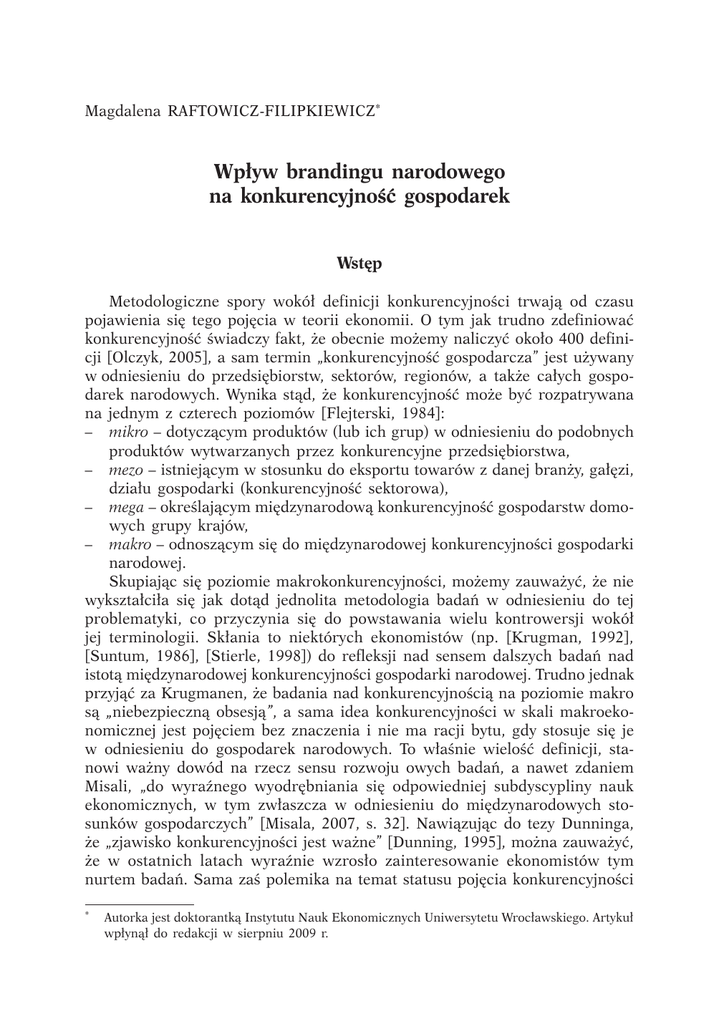 Magdalena RAFTOWICZ-FILIPKIEWICZ* Wpływ brandingu narodowego na konkurencyjność gospodarek Wstęp Metodologiczne spory wokół definicji konkurencyjności trwają od czasu pojawienia się tego pojęcia w teorii ekonomii. O tym jak trudno zdefiniować konkurencyjność świadczy fakt, że obecnie możemy naliczyć około 400 definicji [Olczyk, 2005], a sam termin „konkurencyjność gospodarcza” jest używany w odniesieniu do przedsiębiorstw, sektorów, regionów, a także całych gospodarek narodowych. Wynika stąd, że konkurencyjność może być rozpatrywana na jednym z czterech poziomów [Flejterski, 1984]: – mikro – dotyczącym produktów (lub ich grup) w odniesieniu do podobnych produktów wytwarzanych przez konkurencyjne przedsiębiorstwa, – mezo – istniejącym w stosunku do eksportu towarów z danej branży, gałęzi, działu gospodarki (konkurencyjność sektorowa), – mega – określającym międzynarodową konkurencyjność gospodarstw domowych grupy krajów, – makro – odnoszącym się do międzynarodowej konkurencyjności gospodarki narodowej. Skupiając się poziomie makrokonkurencyjności, możemy zauważyć, że nie wykształciła się jak dotąd jednolita metodologia badań w odniesieniu do tej problematyki, co przyczynia się do powstawania wielu kontrowersji wokół jej terminologii. Skłania to niektórych ekonomistów (np. [Krugman, 1992], [Suntum, 1986], [Stierle, 1998]) do refleksji nad sensem dalszych badań nad istotą międzynarodowej konkurencyjności gospodarki narodowej. Trudno jednak przyjąć za Krugmanen, że badania nad konkurencyjnością na poziomie makro są „niebezpieczną obsesją”, a sama idea konkurencyjności w skali makroekonomicznej jest pojęciem bez znaczenia i nie ma racji bytu, gdy stosuje się je w odniesieniu do gospodarek narodowych. To właśnie wielość definicji, stanowi ważny dowód na rzecz sensu rozwoju owych badań, a nawet zdaniem Misali, „do wyraźnego wyodrębniania się odpowiedniej subdyscypliny nauk ekonomicznych, w tym zwłaszcza w odniesieniu do międzynarodowych stosunków gospodarczych” [Misala, 2007, s. 32]. Nawiązując do tezy Dunninga, że „zjawisko konkurencyjności jest ważne” [Dunning, 1995], można zauważyć, że w ostatnich latach wyraźnie wzrosło zainteresowanie ekonomistów tym nurtem badań. Sama zaś polemika na temat statusu pojęcia konkurencyjności * Autorka jest doktorantką Instytutu Nauk Ekonomicznych Uniwersytetu Wrocławskiego. Artykuł wpłynął do redakcji w sierpniu 2009 r. 104 GOSPODARKA NARODOWA Nr 10/2009 przesunęła się, zdaniem Świtalskiego, „z płaszczyzny teoretycznej na płaszczyznę faktograficzno-porównawczą” [Świtalski, 2005, s. 207], czego dowodem jest m.in. działalność licznych instytucji publikujących stałe raporty na temat konkurencyjności międzynarodowej państw i regionów. Rosnące znaczenie makrokonkurencyjności w świecie teorii i praktyki potwierdzają także intensywnie rozwijające się badania (przypadające zwłaszcza na ostatnie dwie dekady), które przyczyniły się w efekcie do powstania wielu problemów natury koncepcyjnej i metodologicznej. Sachs, analizując przyczyny wzrostu znaczenia problematyki konkurencyjności w ujęciu makroekonomicznym, wymienia m.in.: – znaczące różnice w tempie rozwoju gospodarczego występujące miedzy poszczególnymi podmiotami gospodarki światowej, – uzależnienie sukcesu ekonomicznego gospodarki narodowej nie tylko od czynników zewnętrznych, ale również od kondycji ekonomicznej państw konkurentów, – upadek gospodarki centralnie planowanej w byłych państwach socjalistycznych oraz wzrost aktywności wśród grupy państw rozwijających się, co powoduje w konsekwencji nasilenie procesów integracyjnych na świecie [Sachs, 1996]. Dowodzi to, że dynamiczne przemiany jakie zaobserwować można współcześnie w gospodarce światowej, które związane są z rozwojem globalizacji, mają swoje odzwierciedlenie w poziomie makrokonkurencyjności gospodarek narodowych. Prócz tego, tendencją współczesnych państw w sytuacji pogłębiających się procesów globalizacji jest obecnie ciągłe współzawodnictwo, mające na celu takie wzmocnienie gospodarki narodowej, aby uczynić ją bardziej konkurencyjną na arenie międzynarodowej. W raporcie Grupy Lizbońskiej, odnoszącym się do problematyki konkurencyjności w skali międzynarodowej, czytamy, że „brak konkurencyjności oznacza wykluczenie z rynku, utratę władzy nad przyszłością i podporządkowanie się dominacji silniejszych. Indywidualny i zbiorowy społeczno-gospodarczy dobrobyt, autonomia regionu, bezpieczeństwo i niepodległość kraju czy kontynentu zależą od stopnia jego konkurencyjności” [Grupa Lizbońska, 1996, s. 139], co oznacza, że im kraj jest bardziej konkurencyjny, tym większa jest jego szansa na sukces gospodarczy, społeczny czy polityczny. Nowym zjawiskiem jest także, niespotykana na dotychczasową skalę intensywność tej konkurencyjności – zarówno wewnątrz krajów, jak i pomiędzy nimi. Wynika stąd, iż rzeczywistość gospodarcza XXI w. wykracza poza sztywne ramy współczesnych teorii i modeli makroekonomicznych zajmujących się opisem międzynarodowych stosunków gospodarczych, co implikuje potrzebę uwzględnienia w tych analizach zupełnie nowych czynników, które dotychczas pomijano lub też przyjmowano je za stałe. Literatura naukowa obfituje w wiele publikacji na temat konkurencyjności międzynarodowej, opisywanej przez pryzmat twardych czynników mikro czy makroekonomicznych wpływających na jej poziom. W ujęciu syntetycznym, spośród najczęściej wymienianych elementów determinujących międzynarodową konkurencyjność gospodarki narodowej możemy wymienić przede wszystkim: internacjonalizację gospodarki, sprawność systemu społeczno-ekonomicznego oraz polityki ekonomicznej wraz z jej możliwościami Magdalena Raftowicz-Filipkiewicz, Wpływ branding