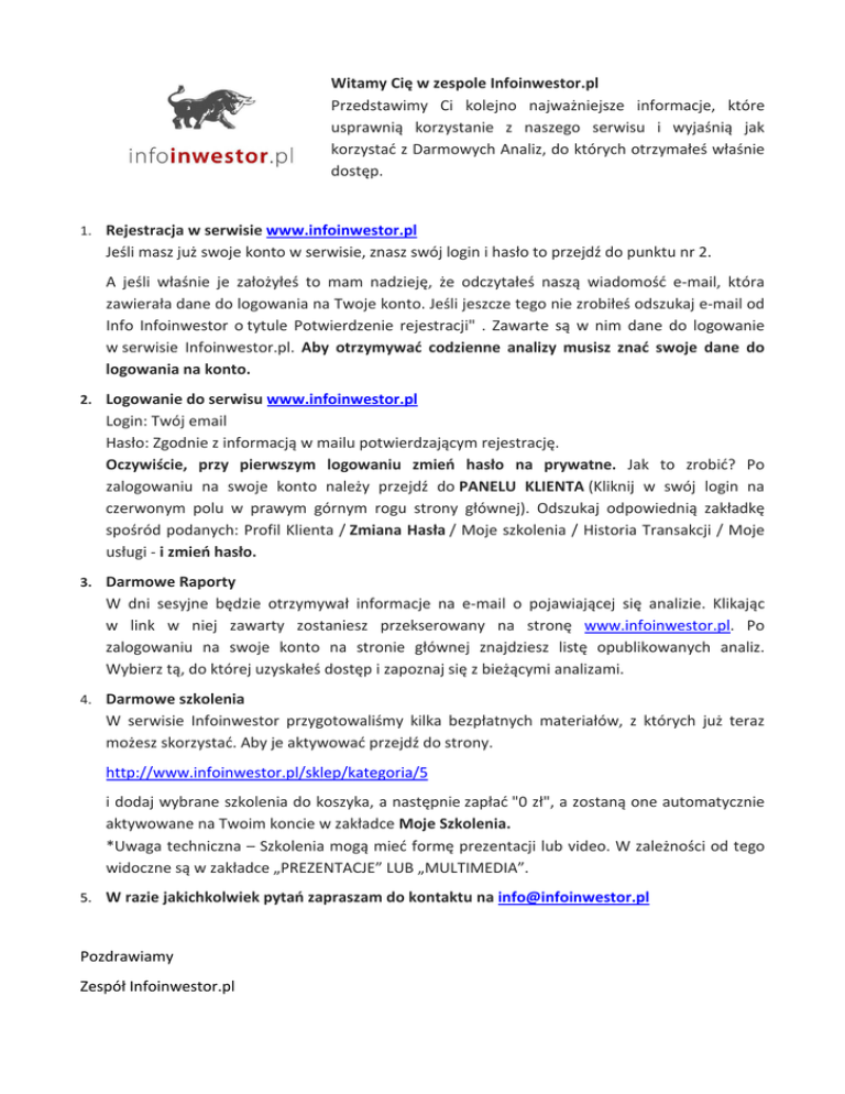 Witamy Cię w zespole Infoinwestor.pl Przedstawimy Ci kolejno najważniejsze informacje, które usprawnią korzystanie z naszego serwisu i wyjaśnią jak korzystać z Darmowych Analiz, do których otrzymałeś właśnie dostęp. 1. Rejestracja w serwisie www.infoinwestor.pl Jeśli masz już swoje konto w serwisie, znasz swój login i hasło to przejdź do punktu nr 2. A jeśli właśnie je założyłeś to mam nadzieję, że odczytałeś naszą wiadomość e-mail, która zawierała dane do logowania na Twoje konto. Jeśli jeszcze tego nie zrobiłeś odszukaj e-mail od Info Infoinwestor o tytule Potwierdzenie rejestracji" . Zawarte są w nim dane do logowanie w serwisie Infoinwestor.pl. Aby otrzymywać codzienne analizy musisz znać swoje dane do logowania na konto. 2. Logowanie do serwisu www.infoinwestor.pl Login: Twój email Hasło: Zgodnie z informacją w mailu potwierdzającym rejestrację. Oczywiście, przy pierwszym logowaniu zmień hasło na prywatne. Jak to zrobić? Po zalogowaniu na swoje konto należy przejdź do PANELU KLIENTA (Kliknij w swój login na czerwonym polu w prawym górnym rogu strony głównej). Odszukaj odpowiednią zakładkę spośród podanych: Profil Klienta / Zmiana Hasła / Moje szkolenia / Historia Transakcji / Moje usługi - i zmień hasło. 3. Darmowe Raporty W dni sesyjne będzie otrzymywał informacje na e-mail o pojawiającej się analizie. Klikając w link w niej zawarty zostaniesz przekserowany na stronę www.infoinwestor.pl. Po zalogowaniu na swoje konto na stronie głównej znajdziesz listę opublikowanych analiz. Wybierz tą, do której uzyskałeś dostęp i zapoznaj się z bieżącymi analizami. 4. Darmowe szkolenia W serwisie Infoinwestor przygotowaliśmy kilka bezpłatnych materiałów, z których już teraz możesz skorzystać. Aby je aktywować przejdź do strony. http://www.infoinwestor.pl/sklep/kategoria/5 i dodaj wybrane szkolenia do koszyka, a następnie zapłać "0 zł", a zostaną one automatycznie aktywowane na Twoim koncie w zakładce Moje Szkolenia. *Uwaga techniczna – Szkolenia mogą mieć formę prezentacji lub video. W zależności od tego widoczne są w zakładce „PREZENTACJE” LUB „MULTIMEDIA”. 5. W razie jakichkolwiek pytań zapraszam do kontaktu na [email protected] Pozdrawiamy Zespół Infoinwestor.pl
