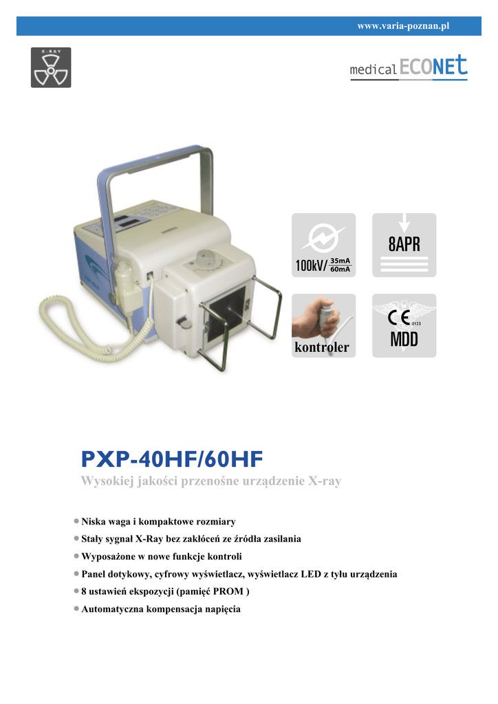 www.varia-poznan.pl 8APR 100kV/ 35mA 60mA kontroler MDD PXP-40HF/60HF Wysokiej jakości przenośne urządzenie X-ray ● Niska waga i kompaktowe rozmiary ● Stały sygnał X-Ray bez zakłóceń ze źródła zasilania ● Wyposażone w nowe funkcje kontroli ● Panel dotykowy, cyfrowy wyświetlacz, wyświetlacz LED z tyłu urządzenia ● 8 ustawień ekspozycji (pamięć PROM ) ● Automatyczna kompensacja napięcia Przenośne X-ray : 100kV/35mA, 12.8kg | 100kV/60mA, 14.6kg Specyfikacja Model Wyjście Kolimator PXP-60HF Nap. lampy/natężenie 100kV/35mA 100kV/60mA Zakres napięcia 40-100kV, 1kV step <–– Zakres mAs (prądu) 0.4-100mAs, 25 steps <–– Moc max. (wyjście) 2.4kW@80kV 3.2kW@80kV Toshiba D-205B Ogniskowa Toshiba D-124 1.2mm Pojemność HU 20kHU 40kHU Chłodzenie 250HU/sec 378HU/sec Min. wielkość pola 5cm×5cm @1m SID <–– Max. wielkość pola 35cm×35cm @65cm SID <–– Lampa 50 watt lampa halogenowa 150 watt lampa halogenowa Auto timer 30 sec <–– Długość miarki SID 2m <–– Znacznik laserowy wbudowany <–– Wejście 110/220 VAC 220-240 VAC 50/60Hz, pojed. faza <–– Typ lampy LampaX-ray PXP-40HF Zasilanie Częstotliwość/faza Kompensacja napięcia ±10% Opcjonalne akcesoria 2.0mm PXMS-1800 <–– 7-segmentowy LED,odczyt z tyłu, ręczny panel sterujący Panel sterujący Cyfrowy wyświetlacz LED : mAs & KV Sterowanie oprogramowaniem & PROM Programowalne ustawienia ekspozycji Zapis danych & przycisk pamięci Wskaźnik LED : gotowy & oczekiwanie Waga Wymiary (sz. x wys. x dł.) Funkcje specjalne 12.8 kg 14.6 kg 250×195×355 <–– 8 APR <–– PXVT-2000 “dostępne różne statywy i stoły” Wymiary Standardowe Akcesoria Walizka dystrybutor: P.I.H. VARIA Sp. z o.o. ul. Witkowa 3 62-020 Rokietnica k/Poznania tel: 061 81 45 203 fax: 061 81 45 204 mail: [email protected] www.varia-poznan.pl