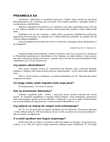 PREAMBUŁA AA Anonimowi Alkoholicy są wspólnotą mężczyzn i kobiet, którzy dzielą się nawzajem doświadczeniem, siłą i nadzieją, aby rozwiązać swój wspólny problem i pomagać innym w wyzdrowieniu z alkoholizmu. Jedynym warunkiem uczestnictwa we wspólnocie jest chęć zaprzestania picia. Nie ma w AA żadnych składek ani opłat, jesteśmy samowystarczalni, poprzez własne dobrowolne datki. Wspólnota AA nie jest związana z żadną sektą, wyznaniem, działalnością polityczną, organizacją lub instytucją, nie angażuje się w żadne publiczne polemiki, nie popiera ani nie zwalcza żadnych poglądów. Naszym podstawowym celem jest trwać w trzeźwości i pomagać innym alkoholikom w jej osiągnięciu. Copyright © by the A. A. Grapevine, Inc. Niniejszą ulotkę opracowaliśmy z myślą o ludziach, którzy po raz pierwszy stykają się ze Wspólnotą Anonimowych Alkoholików (AA). Staramy się odpowiedzieć w niej na pytania, które najczęściej nurtują nowicjuszy - pytania, które również my sami stawialiśmy, kiedy zetknęliśmy się z AA po raz pierwszy. Czy jestem alkoholikiem? Jeśli często wypijasz więcej niż zamierzałeś lub chciałeś; jeśli z powodu alkoholu wpadasz w kłopoty; jeśli podczas picia miewasz zaniki pamięci - to być może jesteś alkoholikiem. Nikt w AA nie postawi ci diagnozy, czy jesteś uzależniony czy nie. Taka decyzja zależy wyłącznie od ciebie. Co mogę zrobić, jeżeli niepokoi mnie moje picie? Poszukaj pomocy. AA może Ci pomóc. Kim są Anonimowi Alkoholicy? Jesteśmy wspólnotą ludzi - kobiet i mężczyzn którzy utracili kontrolę nad swoim piciem. W rezultacie popadliśmy w różnego rodzaju kłopoty. Teraz próbujemy wypracować sobie zadowalający sposób życia bez alkoholu i większości z nas się to udaje. Przekonaliśmy się, że potrzebujemy do tego pomocy i wsparcia innych alkoholików z AA . Czy pójście na mityng do czegoś mnie zobowiązuje? Nie. W AA nie prowadzi się rejestru członków ani list obecności. Nie musisz ujawniać o sobie żadnych danych. Jeśli nie zechcesz do nas wrócić, po prostu się więcej nie pokażesz nikt nie będzie cię nagabywał. A co jeśli spotkam tam kogoś znajomego? Jeżeli nawet tak się zdarzy, to przecież osoba taka będzie na mityngu z tych samych powodów, co ty. Nikt nie wyjawi twojej tożsamości ludziom spoza Wspólnoty. W AA każdy zachowuje taki stopień anonimowości, jaki mu odpowiada. Między innymi dlatego nazywamy siebie Anonimowymi Alkoholikami. Jak wygląda mityng AA? Są różne rodzaje mityngów, ale na każdym spotkasz alkoholików opowiadających o tym, jak alkohol wpłynął na ich życie i osobowość; o tym, co zrobili, żeby sobie pomóc, i o tym, jak im się żyje teraz. W jaki sposób może mi to pomóc? My, uczestnicy AA, wiemy, co to znaczy być uzależnionym od alkoholu i nie móc dotrzymać obietnicy zaprzestania picia - złożonej sobie i innym. Nie jesteśmy zawodowymi terapeutami. Staramy się pomóc innym w zdrowieniu z alkoholizmu, ponieważ nam samym udało się przestać pić to nasze jedyne „kwalifikacje”. Osoby z problemem alkoholowym, które do nas przychodzą, zdają sobie sprawę, że powrót do zdrowia jest możliwy, ponieważ we wspólnocie widzą ludzi z krwi i kości, którym udało się uwolnić od nałogu. Dlaczego uczestnicy AA nadal chodzą na mityngi, mimo że się już wyleczyli? Wyznajemy pogląd, że z alkoholizmu nie można się w y 1 e c z y ć - już nigdy bowiem nie będziemy w stanie pić normalnie. Zdolność do zachowania przez nas abstynencji zależy od naszego zdrowia fizycznego, psychicznego i duchowego. Zdrowie to osiągamy chodząc regularnie na mityngi i stosując w życiu to, czego się na nich uczymy. Przekonaliśmy się też, że łatwiej nam utrzymać trzeźwość, jeśli pomagamy innym alkoholikom. Co trzeba zrobić, żeby wstąpić do AA? Wstępujesz do wspólnoty i stajesz się jej uczestnikiem, jeśli tylko (i kiedy) tego chcesz. Jedynym warunkiem uczestnictwa jest chęć zaprzestania picia. Przystępując do AA, wielu z nas nie było tej chęci całkiem pewnych. Ile kosztuje członkowstwo w AA? Wspólnota AA nie pobiera żadnych składek ani opłat za uczestnictwo. Pod koniec mityngu zbiera się wprawdzie pieniądze (potrzebne na pokrycie kosztów kawy, herbaty, wynajmu lokalu itp.) ale datki te są całkowicie dobrowolne; również ich wysokość zależy wyłącznie od ciebie. Czy Wspólnota AA jest organizacją religijną? Nie. I nie jest też powiązana z żadną sektą, wyznaniem ani Kościołem. Ale dużo się tam mówi o Bogu, prawda? Większość uczestników AA wierzy, że nasz problem alkoholowy udało nam się rozwiązać nie dzięki własnej Sile woli, lecz dzięki jakiejś Większej od nas samych. Każdy jednak definiuje ową siłę po swojemu. Wiele osób nazywa Bogiem, inne utożsamiają ją z grupą AA, a jesz inne wcale w nią nie wierzą. W AA jest miejsce wszystkich, zarówno wierzących, jak i niewierzących. Czy na mityng AA mogę przyprowadzić rodzinę? Członkowie rodzin i przyjaciele są mile widzi na tzw. mityngach otwartych. Informacje na ten mat możecie uzyskać w najbliższym punkcie kontaktowym AA. Co radzicie swoim nowym członkom? Z naszych doświadczeń wynika, że w AA najlepiej wracają do zdrowia ci, którzy: a) unikają pierwszego kieliszka; b) systematycznie uczęszczają na mityngi; c) trzymają się blisko ludzi o dłuższym sta trzeźwości; d) starają się stosować w życiu zasady i sugestie programu . Jak mogę się skontaktować z AA? Skontaktuj się z Biurem Służby Krajowej AA (Warszawa, ul. Chmielna 20). Biuro pracuje od poniedziałku do piątku w godz. 9-15. Mieszczący się tam punkt kontaktowy jest czynny od poniedziałku do piątku, w godz. 15-21 (tel. (0-22) 828-04-94) Dyżurujący na ochotnika alkoholicy dysponują wszelkimi potrzebnymi ci informacjami oraz aktualną ulotką z terminami i adresami spotkań AA . Mityngi (spotkania) grupy A
