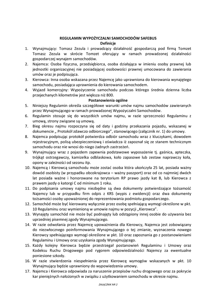1. 2. 3. 4. 5. 6. 7. 8. 9. 10. 11. 12. 13. 14. 15. 16. 17. REGULAMIN WYPOŻYCZALNI SAMOCHODÓW SAFEBUS Definicje Wynajmujący: Tomasz Zezula i prowadzący działalność gospodarczą pod firmą Tomzet Tomasz Zezula w skrócie Tomzet oferujący w ramach prowadzonej działalności gospodarczej wynajem samochodów. Najemca: Osoba fizyczna, przedsiębiorca, osoba działająca w imieniu osoby prawnej lub jednostki organizacyjnej nie posiadającej osobowości prawnej umocowana do zawierania umów oraz je podpisująca. Kierowca: Inna osoba wskazana przez Najemcę jako uprawniona do kierowania wynajętego samochodu, posiadająca uprawnienia do kierowania samochodem. Wyjazd komercyjny: Wypożyczenie samochodu podczas którego średnia dzienna liczba przejechanych kilometrów jest większa niż 800. Postanowienia ogólne Niniejszy Regulamin określa szczegółowe warunki umów najmu samochodów zawieranych przez Wynajmującego w ramach prowadzonej Wypożyczalni Samochodów. Regulamin stosuje się do wszystkich umów najmu, w razie sprzeczności Regulaminu z umową, strony związane są umową. Bieg okresu najmu rozpoczyna się od daty i godziny przekazania pojazdu, wskazanej w dokumencie „ Protokół zdawczo odbiorczego”, stanowiącego (załącznik nr. 1) do umowy. Najemca podpisując protokół potwierdza odbiór samochodu wraz z kluczykami, dowodem rejestracyjnym, polisą ubezpieczeniową i oświadcza iż zapoznał się ze stanem technicznym samochodu oraz nie wnosi do niego żadnych zastrzeżeń. Wynajmujący wraz z pojazdem zapewnia podstawowe wyposażenie tj. gaśnica, apteczka, trójkąt ostrzegawczy, kamizelka odblaskowa, koło zapasowe lub zestaw naprawczy koła, opony w zależności od sezonu itp. Najemcą i Kierowcą samochodu może zostać osoba która ukończyła 25 lat, posiada ważny dowód osobisty (w przypadku obcokrajowca – ważny paszport) oraz od co najmniej dwóch lat posiada ważne i honorowane na terytorium RP prawo jazdy kat B, lub Kierowca z prawem jazdy o katorgi C od minimum 1 roku. Do podpisania umowy najmu niezbędne są dwa dokumenty potwierdzające tożsamość Najemcy lub w przypadku firm odpis z KRS (wypis z ewidencji) oraz dwa dokumenty tożsamości osoby upoważnionej do reprezentowania podmiotu gospodarczego. Samochód może być kierowany wyłącznie przez osobę spełniającą wymogi określone w pkt. 10 Regulaminu oraz wymienioną w umowie najmu w pozycji „Kierowca”. Wynajęty samochód nie może być podnajęty lub odstąpiony innej osobie do używania bez uprzedniej pisemnej zgody Wynajmującego. W razie odwołania przez Najemcę upoważnienia dla Kierowcy, Najemca jest zobowiązany do niezwłocznego poinformowania Wynajmującego o tej zmianie, wyznaczenia nowego Kierowcy spełniającego wymogi określone w pkt. 10 oraz zapoznania go z postanowieniami Regulaminu i Umowy oraz uzyskania zgody Wynajmującego. Każdy kolejny Kierowca będzie przestrzegał postanowień Regulaminu i Umowy oraz Kodeksu Ruchu Drogowego pod rygorem odpowiedzialności Najemcy za ewentualne poniesione szkody. W razie stwierdzenia niespełnienia przez Kierowcę wymogów wskazanych w pkt. 10 Wynajmujący będzie uprawniony do wypowiedzenia umowy. Najemca i Kierowca odpowiada za naruszenie przepisów ruchu drogowego oraz za pokrycie kar pieniężnych nałożonych w związku z użytkowaniem samochodu w okresie najmu. ZAŁĄCZNIK NR 2 18. Ewentualne spory mogące wyniknąć z realizacji umów najmu samochodów, rozstrzygać będzie Sąd właściwy miejscowo dla siedziby Wynajmującego. Rezerwacja, zawarcie umowy, przedmiot usługi 19. Klient dokonując rezerwacji zobowiązuje się do zawarcia umowy najmu w oparciu o poniższe warunki i specyfikację usług zawartych w umowie najmu. Rezerwacja traktowana jest jak zamówienie Klienta, wiążące TOMZET TOMASZ ZEZULA dopiero po pisemnym zaakceptowaniu warunków najmu oraz wpłaceniu zaliczki. 20. Brak przekazania zaliczki w ustalonym przez strony terminie traktowany jest jako rezygnacja z rezerwacji terminu. Brak wpłaty drugiej transzy w określonym terminie lub nie pojawienie się Najemcy na odbiór samochodu będzie traktowane jako rezygnacja z wynajmu, a opłata rezerwacyjna przepadnie w całości na rzecz Wynajmującego, a Najemca nie ma prawa żądać jej zwrotu. 21. Opłata za wynajem przekazywana jest przez Najemcę w dwóch transzach: I transza – opłata rezerwacyjna w wysokości 20% całkowitej opłaty, jednak nie mniej niż 200 PLN – przekazywana przy rezerwacji. II transza – opłata zasadnicza stanowiąca uzupełnienie do całkowitej opłaty przekazywana najpóźniej w dniu przekazania samochodu Najemcy. 22. Klient dokonuje rezerwacji konkretnego samochodu. 23. Klient ma możliwość obejrzenia samochodu przed dokonaniem opłaty rezerwacyjnej, jednak jedynie w siedzibie TOMZET TOMASZ ZEZULA i w terminie wskazanym przez przedstawiciela firmy. 24. W przypadku dokonywania rezerwacji w sposób elektroniczny (przez e-mail) Wynajmujący powinien potwierdzić Klientowi otrzymanie rezerwacji niezwłocznie w sposób elektroniczny (w ciągu 24h). Potwierdzenie otrzymania rezerwacji przekazane elektronicznie oznacza wpisanie Klienta na listę zainteresowanych najmem i nie jest jednoznaczne z potwierdzeniem rezerwacji (zawarciem umowy) i nie uprawnia Klienta do roszczenia praw związanych z zawarciem umowy. 25. Umowa najmu musi być pod rygorem nieważności zawarta w formie pisemnej. 26. Informacje publikowane w ulotkach, informatorach przez osoby trzecie, producentów, biura wynajmu pojazdów, agentów podróży, które wykraczają lub są sprzeczne z wiadomościami i postanowieniami publikowanymi przez TOMZET TOMASZ ZEZULA nie są wiążące dla TOMZET TOMASZ ZEZULA. 27. Niniejszym postanawia się, iż nie istnieje możliwość odstąpienia od umowy lub jej rozwiązania albo wypowiedzenia, z zastrzeżeniem pkt 28. 28. W przypadku odstąpienia przez Klienta od umowy przed odbiorem pojazdu, co pod rygorem nieważności wymaga 
