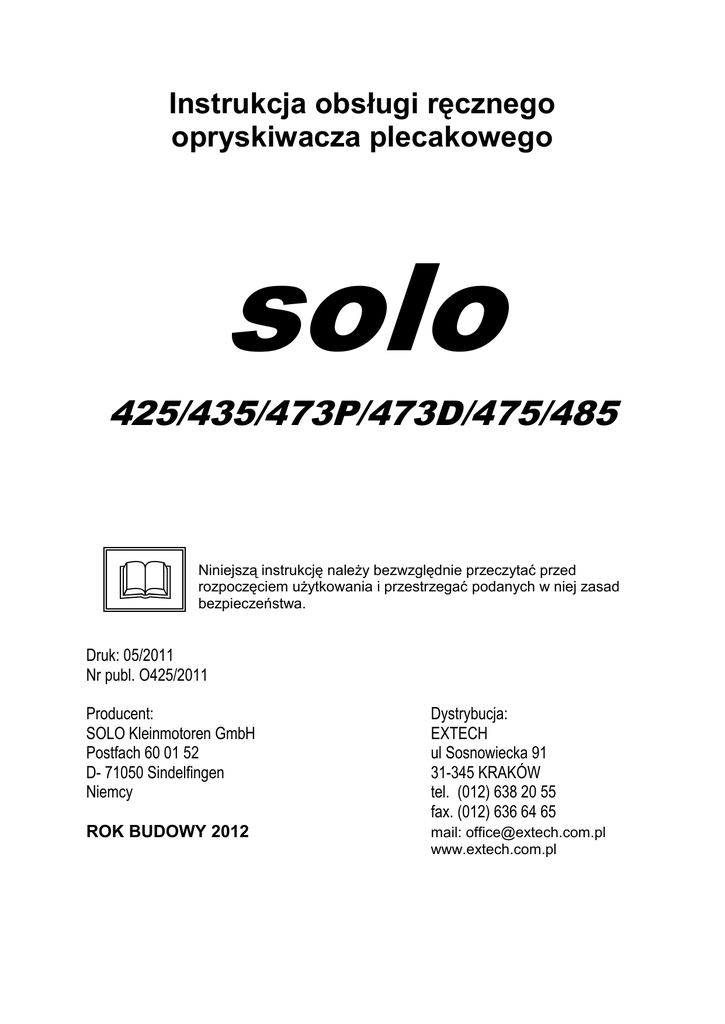 Instrukcja obsługi ręcznego opryskiwacza plecakowego solo 425/435/473P/473D/475/485 Niniejszą instrukcję należy bezwzględnie przeczytać przed rozpoczęciem użytkowania i przestrzegać podanych w niej zasad bezpieczeństwa. Druk: 05/2011 Nr publ. O425/2011 Producent: SOLO Kleinmotoren GmbH Postfach 60 01 52 D- 71050 Sindelfingen Niemcy Dystrybucja: EXTECH ul Sosnowiecka 91 31-345 KRAKÓW tel. (012) 638 20 55 fax. (012) 636 64 65 ROK BUDOWY 2012 mail: [email protected] www.extech.com.pl Gratulujemy zakupu opryskiwacza firmy SOLO. Gratulując Państwu udanego zakupu urządzenia firmy SOLO mamy nadzieję, że to nowoczesne urządzenie spełni Państwa oczekiwania. Konstruktorzy firmy SOLO, dysponujący wieloletnim doświadczeniem oraz wychodząc naprzeciw współczesnym wymaganiom, w oparciu o najnowocześniejsze technologie i najwyższej jakości materiały, opracowali urządzenie charakteryzujące się łatwą obsługą, bezproblemową i długą eksploatacją oraz wyposażane w wiele nowoczesnych rozwiązań. Wraz z zakupionym sprzętem otrzymują Państwo instrukcję obsługi. Jest to bardzo ważny dokument, który powinien zawsze towarzyszyć sprzętowi. W razie zgubienia lub zniszczenia jej należy bezzwłocznie nabyć nowy egzemplarz zamawiając go u dostawcy Przed przystąpieniem do pracy urządzeniem należy dokładnie zapoznać się z instrukcją obsługi oraz z zasadami bezpieczeństwa. Aby zapewnić długotrwałą pracę urządzenia należy ściśle przestrzegać zawartych w instrukcji wskazówek dotyczących obsługi i konserwacji. W razie jakichkolwiek wątpliwości i pytań prosimy o kontakt pod adres dystrybutora urządzenia. sprzętu. Przeznaczenie opryskiwacza Plecakowe opryskiwacze ciśnieniowe znajdują szerokie zastosowanie w rolnictwie, ogrodnictwie, leśnictwie, uprawach winorośli, szkółkach leśnych, szklarniach (tylko mających prawidłową wentylację) do zabiegów z zakresu ochrony roślin i nawożenia upraw powierzchniowych, rzędowych oraz pojedynczych roślin. Opryskiwacz można stosować także do dezynfekcji pomieszczeń zamkniętych, posiadających sprawnie działającą wentylację, takich jak: magazyny, wagony i statki Plecakowe opryskiwacze ciśnieniowe są przeznaczone do oprysku zaaprobowanych płynnych środków ochrony roślin, pestycydów, herbicydów, środków owadobójczych i grzybobójczych oraz płynnych środków nawożących, dostępnych w autoryzowanych punktach sprzedaży. Zalecamy stosować tylko i wyłącznie środki dopuszczone do użytku przez lokalne przepisy. Środki ochrony roślin można stosować wyłącznie do celów określonych w etykiecieinstrukcji stosowania i ściśle według podanych w niej zaleceń w taki sposób, aby nie dopuścić do zagrożenia zdrowia ludzi, zwierząt i skażenia środowiska oraz uwzględniając w pierwszej kolejności biologiczne, hodowlane i agrotechniczne metody ochrony roślin, które pozwalają ograniczyć stosowanie chemicznych środków do niezbędnego minimum. Użytkowanie opryskiwacza do innych niż wymienione celów oraz stosowanie niezaaprobowanych środków do oprysku może powodować niebezpieczeństwo dla operatora, jego otoczenia, środowiska naturalnego, i będzie traktowane jako zastosowanie niezgodne z przeznaczeniem urządzenia i instrukcją obsługi. Wszelkie uszkodzenia urządzenia powstałe w wyniku stosowania nieaprobowanych środków ochrony roślin są wyłączone z warunków gwarancji. 2 1. Ogólne Zasady bezpieczeństwa Niniejszą instrukcję obsługi należy uważnie przeczytać przed pierwszym uruchomieniem urządzenia, zapoznać się z zawartymi w niej wskazówkami dotyczącymi prawidłowej eksploatacji urządzenia i zasadami bezpieczeństwa, oraz następnie zachować do wglądu w bezpiecznym miejscu. Urządzenie należy użytkować ze szczególną ostrożnością, przestrzegając następujących zasad bezpieczeństwa. Nieprzestrzeganie zasad bezpieczeństwa może być powodem powstania ryzyka poważnych zranień operatora oraz powikłań zdrowotnych. Instrukcja obsługi powinna być zawsze dostępna w trakcie użytkowania urządzenia. Urządzenie może być eksploatowane i używane tylko i wyłącznie zgodnie ze swoim przeznaczeniem Niedozwolone jest użytkowanie urządzenia przez dzieci. Młodzież poniżej 18 roku życia może używać urządzenie tylko pod kontrolą dorosłych i po przeszkoleniu. W obszarze pracy nie powinny się znajdować osoby postronne oraz zwierzęta. Nigdy nie wolno kierować dyszy w kierunku osób, zwierząt. Wypływająca pod wysokim ciśnieniem ciecz jest potencjalnym zagrożeniem i może spowodować poważne obrażenia. Obsługujący urządzenie odpowiada za bezpieczeństwo osób trzecich oraz zwierząt znajdujących się w okolicy Urządzenie wolno odstępować lub pożyczać jedynie osobom zaznajomionym z instrukcją obsługi i zasadami bezpieczeństwa. Instrukcja obsługi zawsze powinna być przekazana osobom, którym pożyczono lub przekazano urządzenie. Jedynie sprawne fizycznie osoby mogą obsługiwać urządzenie. Zmęczenie lub choroba mogą spowodować obniżenie koncentracji i brak uwagi. Osobom pod wpływem alkoholu, narkotyków lub leków wpływających na obniżenie prawności psychofizycznej nie wolno pracować urządzeniem Urządzenie może być użytkowane tylko i wyłącznie, gdy pozostaje w dobrym stanie technicznym. Zawsze należy skontrolować stan urządzenia przed uruchomieniem. Do użytkowania dopuszczone są wyłącznie oryginalne akcesoria dostarczone przez producenta, przeznaczone do konkretnego modelu urządzenia. Niezawodna praca urządzenia i zachowanie zasad bezpiecznego użytkowania uzależnione jest także od jakości części zamiennych. Należy używać wyłącznie oryginalnych części zamiennych, które wytwarzane są z zachowaniem odpowiednich technologii, co gwarantuje najwyższą możliwą jakość zarówno w zakresie materiałowym, wymiarowości, funkcjonalności jak i bezpieczeństwa. Oryginaln