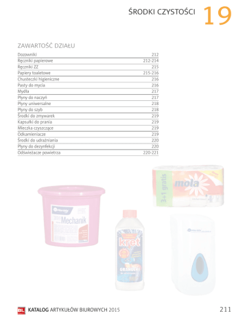 ŚRODKI CZYSTOŚCI 19 ZAWARTOŚĆ DZIAŁU Dozowniki212 Ręczniki papierowe 212-214 Ręczniki ZZ 215 Papiery toaletowe 215-216 Chusteczki higieniczne 216 Pasty do mycia 216 Mydła217 Płyny do naczyń 217 Płyny uniwersalne 218 Płyny do szyb 218 Środki do zmywarek 219 Kapsułki do prania 219 Mleczka czyszczące 219 Odkamieniacze219 Środki do udrażniania 220 Płyny do dezynfekcji 220 Odświeżacze powietrza 220-221 KATALOG ARTYKUŁÓW BIUROWYCH 2015 211 Elektroniczny odświeżacz powietrza z programatorem OE3 Elektroniczny odświeżacz powietrza OE4 PULSE II ♦♦ W pełni automatyczne działanie ♦♦ Elegancki wygląd ♦♦ Bardzo wysoka skuteczność (pełny efekt ♦♦ W pełni automatyczne działanie ♦♦ Elegancki wygląd ♦♦ Bardzo wysoka skuteczność (pełny efekt zapachowy w pomieszczeniach o kubaturze do 170 m3) – programowana częstotliwość emisji zapachu (interwał 5 do 25 min.) ♦♦ Trzy opcje działania: w dzień, w nocy, przez całą dobę ♦♦ Wskaźnik zużycia baterii ♦♦ Wskaźnik zużycia wkładu zapachowego ♦♦ Możliwość włączenia automatycznego sygnału dźwiękowego w razie konieczności wymiany wkładu zapachowego lub wymiany baterii ♦♦ Możliwość zastosowania w każdym pomieszczeniu ♦♦ Maksymalnie efektywne wykorzystanie baterii ♦♦ Wymiary (szer. x wys. x gł.) 9 x 22 x 7,5 cm indeks ME070 Dozownik mydła w pianie DF3TN TOP indeks ME185 Mechaniczny podjanik ręczników papierowych w rolach CTN401 TOP MINI 19 ŚRODKI CZYSTOŚCI ♦♦ Mydło dozowane w postaci niebywale delikatnej piany ♦♦ Bardzo wydajny – ponad 2000 porcji piany z jednego wkładu z mydłem ♦♦ Do stosowania z mydłem w pianie M12P, M13P, M13XP ♦♦ Całkowita szczelność wkładu zabezpiecza przed skażeniem zawartości ♦♦ Dostępny w kolorze białym ♦♦ Niebieskie okienko do kontroli poziomu mydła ♦♦ Wykonany z wysokiej jakości tworzywa ABS ♦♦ Zamykany na kluczyk ♦♦ Wysokość 25 cm ♦♦ Szerokość 11,5 cm ♦♦ Głębokość 11,5cm indeks ME188 Mydło w pianie M12P do dozownika DF3TN lub DF3TS BALI PLUS w pianie DF3TN i DF3TS ♦♦ Jednorazowy wkład z pompką spieniającą, piany z jednego wkładu skażeniem zawartości 212 stosowanie tych ręczników zapewnia właściwe funkcjonowanie dozownika ♦♦ Dostępny w kolorze białym z niebieskim okienkiem do kontroli ilości ręczników ♦♦ Wykonany z tworzywa ABS ♦♦ Wyposażony w mechanizm wysuwający kolejne porcje ręcznika o długości listka 27,5 cm ♦♦ Zamykany na klucz kolor zielony biały Ręczniki papierowe w roli RAZ401 do podajnika CTN401 TOP MINI dającą niebywale delikatną pianę ♦♦ Bardzo wydajne – ok. 2000 porcji ♦♦ Oszczędność zużycia wody i mniejsza ilość ścieków ♦♦ Skrócenie czasu mycia rąk ♦♦ Opakowanie podlega całkowitemu recyklingowi ♦♦ Do użycia z ręcznikami papierowymi w rolce ♦♦ Do użycia z ręcznikami papierowymi w rolach z adaptorami – indeks ME186 ME187 ♦♦ Do stosowania w dozowniku mydła ♦♦ Masa wkładów 700 g ♦♦ Całkowita szczelność wkładu zabezpiecza przed zapachowy w pomieszczeniach o kubaturze do 170 m3) ♦♦ Możliwość programowania wielu parametrów: – opcji wykorzystania wkładu (30–60–90 dni); – dobowego cyklu pracy (12/24 godz.); – godziny rozpoczęcia i dni pracy indeks ♦♦ Wskaźnik ilości dni do wymiany wkładu zapachowego ME140 ♦♦ Wskaźnik zużycia baterii ♦♦ Możliwość włączenia automatycznego sygnału dźwiękowego w razie konieczności wymiany wkładu zapachowego lub wymiany baterii ♦♦ Możliwość zastosowania w każdym pomieszczeniu ♦♦ Maksymalnie efektywne wykorzystanie baterii ♦♦ Wymiary (szer. x wys. x gł.) 9 x 22 x 7,5 cm indeks ME218 ♦♦ Gofrowane, wzmacniane ♦♦ Jednowarstwowe ♦♦ Ilość listków 498 sztuk ♦♦ Wysokość 20 cm ♦♦ Średnica 14,5 cm ♦♦ Długość 137 m biuroland.eu indeks ME-PR31 Czyściwo celulozowe UTB002 ♦♦ 100% celulozy ♦♦ Dwuwarstwowe, gofrowane, perforowane ♦♦ do pojemnika MINI ♦♦ Długość wstęgi 70 m ♦♦ Szerokość wstęgi 21 cm ♦♦ Średnica 13 cm ♦♦ 100% celulozy ♦♦ Dwuwarstwowe, perforowane co 38 cm ♦♦ Bardzo chłonne, niepylące ♦♦ Długość 700 metrów, szerokość wstęgi 25 cm ♦♦ Średnica 39 cm ♦♦ Opakowanie handlowe zawiera 1 rolę czyściwa Papier Jumbo Roll Ręcznik papierowy TOP Maxi Merida biały RTB101 indeks SC142 SC141 rodzaj biały zielony indeks ME313 ST243 rodzaj Merida biały 12 szt. Ander biały indeks JAR001 Ręcznik papierowy JAR-POL Jumbo Maxi zielony 19 cm KATALOG ARTYKUŁÓW BIUROWYCH 2015 indeks ME307 indeks ME015 ♦♦ 100% celulozy ♦♦ Dwuwarstwowy, gofrowany, perforowany co 29 cm ♦♦ Miękki 19 ŚRODKI CZYSTOŚCI Ręcznik Papierowy w roli Merida Top Mini RTB201 indeks NI036 Ręcznik papierowy 14 cm ASKO ♦♦ Rolka o średnicy 14 cm ♦♦ Makulatura dwuwarstwowa ♦♦ 75% białości ♦♦ 65 m ♦♦ 12 sztuk w opakowaniu 213 indeks NI031 indeks NI032 Ręcznik papierowy Jumbo 19 cm ASKO Ręcznik papierowy 14 cm GRASANT ♦♦ Rolka o średnicy 19 cm ♦♦ Makulatura jednowarstwowa ♦♦ 65 % białości ♦♦ 300 m ♦♦ 6 sztuk w opakowaniu ♦♦ Rolka o średnicy 14 cm ♦♦ Celuloza dwuwarstwowa ♦♦ 100% celuloza ♦♦ 65 m ♦♦ 12 sztuk w opakowaniu indeks NI037 19 ŚRODKI CZYSTOŚCI Ręcznik papierowy Jumbo 19 cm KAREN ♦♦ Rolka o średnicy 19 cm ♦♦ Celuloza dwuwarstwowa ♦♦ 100% celuloza biała ♦♦ 150 m ♦♦ 6 sztuk w opakowaniu Czyściwa Papernet indeks NI023 NI024 rodzaj Specjal Spe Virgin Ręczniki papierowe indeks NI025 Ręcznik kuchenny Papernet 402406 214 indeks AND007 NI002 LM0025 rodzaj Leo Mola 3+1 Soft&Easy ilość 2 szt. 4 szt. 2 szt. biuroland.eu Ręczniki ZZ rodzaj Merida PZ26 4000 biały Papyrus biały Celuloza dwuwarstwowy 3000 biały Szary Papyrus szary Cliver zielony Papyrus zielony indeks NI034 Ręcznik składany zz 23x